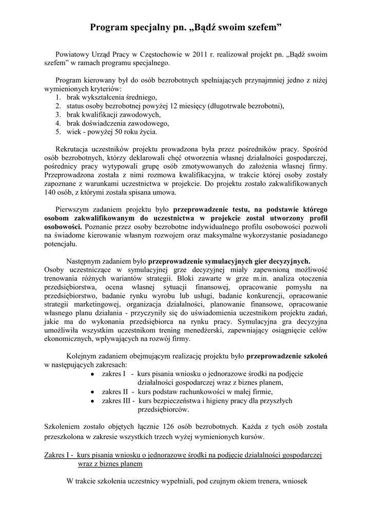 Program specjalny pn. „Bądź swoim szefem” Powiatowy Urząd Pracy w Częstochowie w 2011 r. realizował projekt pn. „Bądź swoim szefem” w ramach programu specjalnego. Program kierowany był do osób bezrobotnych spełniających przynajmniej jedno z niżej wymienionych kryteriów: 1. brak wykształcenia średniego, 2. status osoby bezrobotnej powyżej 12 miesięcy (długotrwale bezrobotni), 3. brak kwalifikacji zawodowych, 4. brak doświadczenia zawodowego, 5. wiek - powyżej 50 roku życia. Rekrutacja uczestników projektu prowadzona była przez pośredników pracy. Spośród osób bezrobotnych, którzy deklarowali chęć otworzenia własnej działalności gospodarczej, pośrednicy pracy wytypowali grupę osób zmotywowanych do założenia własnej firmy. Przeprowadzona została z nimi rozmowa kwalifikacyjna, w trakcie której osoby zostały zapoznane z warunkami uczestnictwa w projekcie. Do projektu zostało zakwalifikowanych 140 osób, z którymi została spisana umowa. Pierwszym zadaniem projektu było przeprowadzenie testu, na podstawie którego osobom zakwalifikowanym do uczestnictwa w projekcie został utworzony profil osobowości. Poznanie przez osoby bezrobotne indywidualnego profilu osobowości pozwoli na świadome kierowanie własnym rozwojem oraz maksymalne wykorzystanie posiadanego potencjału. Następnym zadaniem było przeprowadzenie symulacyjnych gier decyzyjnych. Osoby uczestniczące w symulacyjnej grze decyzyjnej miały zapewnioną możliwość trenowania różnych wariantów strategii. Bloki zawarte w grze m.in. analiza otoczenia przedsiębiorstwa, ocena własnej sytuacji finansowej, opracowanie pomysłu na przedsiębiorstwo, badanie rynku wyrobu lub usługi, badanie konkurencji, opracowanie strategii marketingowej, organizacja działalności, planowanie finansowe, opracowanie własnego planu działania - przyczyniły się do uświadomienia uczestnikom projektu zadań, jakie ma do wykonania przedsiębiorca na rynku pracy. Symulacyjna gra decyzyjna umożliwiła wszystkim uczestnikom trening menedżerski, zapewniający osiągnięcie celów ekonomicznych, wpływających na rozwój firmy. Kolejnym zadaniem obejmującym realizację projektu było przeprowadzenie szkoleń w następujących zakresach: zakres I - kurs pisania wniosku o jednorazowe środki na podjęcie działalności gospodarczej wraz z biznes planem, zakres II - kurs podstaw rachunkowości w małej firmie, zakres III - kurs bezpieczeństwa i higieny pracy dla przyszłych przedsiębiorców. Szkoleniem zostało objętych łącznie 126 osób bezrobotnych. Każda z tych osób została przeszkolona w zakresie wszystkich trzech wyżej wymienionych kursów. Zakres I - kurs pisania wniosku o jednorazowe środki na podjęcie działalności gospodarczej wraz z biznes planem W trakcie szkolenia uczestnicy wypełniali, pod czujnym okiem trenera, wniosek o przyznanie jednorazowych środków na rozpoczęcie działalności gospodarczej oraz sporządzali biznes plan. Program zajęć zawierał również tematykę strategii firmy z elementami marketingu oraz podstaw prawnych funkcjonowania firmy w powiązaniu z ustawami o swobodzie działalności gospodarczej i ustawy o pomocy publicznej. Zakres II - kurs podstaw rachunkowości w małej firmie Celem kursu było nabycie wiedzy z zakresu prowadzenia działalności gospodarczej począwszy od podstaw jej zakładania. Każdy z uczestników zdobył i uszczegółowił wiedzę niezbędną w zakresie zakładania działalności gospodarczej oraz wypełniania i prowadzenia kompletnej dokumentacji związanej z prowadzeniem małej firmy. Uzyskana na kursie wiedza wpłynie na umiejętność interpretacji danych finansowych zawartych w bilansie, rachunku zysków i strat, oraz przepływach pieniężnych. Wiedza ta przyczyni się do trwałości przedsiębiorstwa, a zatem osoba bezrobotna sama utworzy sobie miejsce pracy, które będzie trwałe. Wpłynie to na sytuację ekonomiczną samej osoby bezrobotnej, rodziny, lokalnej społeczności. Zakres III - kurs bezpieczeństwa i higieny pracy dla przyszłych przedsiębiorców Celem szkolenia było zapoznanie przyszłego przedsiębiorcy z podstawowymi przepisami bezpieczeństwa i higieny pracy, z zasadami udzielania pierwszej pomocy w razie wypadku oraz z zasadami postępowania dotyczącymi ochrony przeciwpożarowej. Uczestnicy kursu nauczyli się, jak zorganizować stanowisko pracy z uwzględnieniem higienicznych warunków pracy, zidentyfikować zagrożenia czynnikami szkodliwymi i niebezpiecznymi dla zdrowia. Poznali również zasady postępowania w razie wypadku w czasie pracy i w sytuacjach zagrożeń, w tym zasady udzielania pierwszej pomocy w razie wypadku. Zaznajomili się również ze skutkami ekonomicznymi niewłaściwych warunków pracy (np. świadczenia z tytułu warunków pracy, składka na ubezpieczenie społeczne pracowników). Szkolenie zawierało również zagadnienia z zakresu ergonomii w kształtowaniu warunków pracy. Ukończenie kursu przygotuje przyszłych przedsiębiorców do odpowiedzialności w biznesie i sprawi, że w przyszłości będą mogli świadomie tworzyć nowe stanowiska pracy i zatrudniać inne osoby. Ostatnim zadaniem projektu była wypłata jednorazowych środków na rozpoczęcie działalności gospodarczej oraz środków na utworzenie i utrzymanie strony WWW. Z uczestnikami projektu zostały spisane umowy cywilno prawne, w ramach których zostały przekazane jednorazowe środki na rozpoczęcie działalności gospodarczej i środki na utworzenie oraz utrzymanie przez 12 miesięcy strony internetowej. Projekt trwał do 31.12.2011 r. Pierwotnie zakładano, że udział w nim weźmie 140 osób, z których 110 otrzyma wsparcie w postaci jednorazowych środków na rozpoczęcie działalności gospodarczej oraz środki na utworzenie i utrzymanie strony internetowej. Dzięki uzyskanym oszczędnościom udało się powiększyć liczbę osób, które otrzymają środki na uruchomienie własnej działalności ze 110