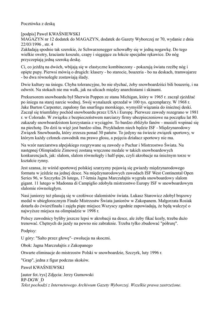 Pocztówka z deską [podpis] Paweł KWAŚNIEWSKI MAGAZYN nr 12 dodatek do MAGAZYN, dodatek do Gazety Wyborczej nr 70, wydanie z dnia 22/03/1996 , str. 4 Zakładają spodnie tak szerokie, że Schwarzenegger schowałby się w jedną nogawkę. Do tego wielkie swetry, kraciaste koszule, czapy i sięgające za łokcie specjalne rękawice. Do nóg przyczepiają jedną szeroką deskę. Ci, co jeżdżą na dwóch, wbijają się w elastyczne kombinezony - pokazują światu rzeźbę nóg i opięte pupy. Pierwsi mówią o drugich: klasery - bo starocie, boazeria - bo na deskach, tramwajarze - bo dwa równoległe zostawiają ślady. Dwie kultury na śniegu. Chyba tolerancyjne, bo nie słychać, żeby snowboardziści bili boazerię, i na odwrót. Na stokach nie ma walk, jak na ulicach między anarchistami i skinami. Prekursorem snowboardu był Sherwin Poppen ze stanu Michigan, który w 1965 r. zaczął zjeżdżać po śniegu na starej narcie wodnej. Swój wynalazek sprzedał w 100 tys. egzemplarzy. W 1968 r. Jake Burton Carpenter, zapalony fan snurfingu morskiego, wymyślił wiązania do śnieżnej deski. Zaczął się triumfalny pochód snowboardu przez USA i Europę. Pierwsze zawody rozegrano w 1981 r. w Colorado. W związku z bezpieczeństwem narciarzy firmy ubezpieczeniowe na początku lat 80. zakazały snowboardzistom korzystania z wyciągów. To bardzo zbliżyło fanów - musieli wspinać się na piechotę. Do dziś ta więź jest bardzo silna. Przykładem niech będzie ISF - Międzynarodowy Związek Snowboardu, który zrzesza ponad 30 państw. To jedyny na świecie związek sportowy, w którym każdy członek-zawodnik ma prawo głosu, a pojęcia działacz sportowy nie ma. Na wzór narciarstwa alpejskiego rozgrywane są zawody o Puchar i Mistrzostwo Świata. Na następnej Olimpiadzie Zimowej zostaną wręczone medale w takich snowboardowych konkurencjach, jak: slalom, slalom równoległy i half-pipe, czyli akrobacje na śnieżnym torze w kształcie rynny. Jest szansa, że wśród sportowej polskiej szarzyzny pojawią się gwiazdy międzynarodowego formatu w jeździe na jednej desce. Na międzynarodowych zawodach ISF West Continental Open Series 96, w Szczyrku 26 lutego, 17-letnia Jagna Marczułajtis wygrała snowboardowy slalom gigant. 11 lutego w Madonna di Campiglio zdobyła mistrzostwo Europy ISF w snowboardowym slalomie równoległym. Nasi juniorzy też plasują się w czołówce slalomistów świata. Łukasz Starowicz zdobył brązowy medal w ubiegłorocznym Finale Mistrzostw Świata juniorów w Zakopanem. Małgorzata Rosiak dotarła do ćwierćfinału i zajęła piąte miejsce.Wszyscy zgodnie zapowiadają, że będą walczyć o najwyższe miejsca na olimpiadzie w 1998 r. Polscy zawodnicy byliby jeszcze lepsi w akrobacji na desce, ale żeby fikać kozły, trzeba dużo trenować. Chętnych do jazdy na pewno nie zabraknie. Trzeba tylko zbudować "półrurę". Podpisy: U góry: "Salto przez głowę"- ewolucja na skoczni. Obok: Jagna Marczułajtis z Zakopanego Otwarte eliminacje do mistrzostw Polski w snowboardzie, Szczyrk, luty 1996 r. "Grap", jedna z figur podczas skoków. Paweł KWAŚNIEWSKI [autor fot./rys] Zdjęcia: Jerzy Gumowski RP-DGW_D Tekst pochodzi z Internetowego Archiwum Gazety Wyborczej. Wszelkie prawa zastrzeżone. Kopiowanie i rozpowszechnianie w jakiejkolwiek formie bez odrębnej zgody Wydawcy zabronione. © Archiwum GW 1998,2002,2004