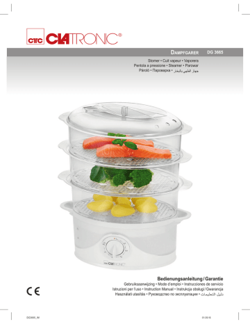 DAMPFGARER DG 3665 Stomer • Cuit vapeur • Vaporera Pentola a pressione • Steamer • Parowar 3iUROyɉɚɪɨɜɚɪɤɚ Bedienungsanleitung / Garantie Gebruiksaanwijzing • Mode d’emploi • Instrucciones de servicio ,VWUX]LRQLSHUO¶XVR,QVWUXFWLRQ0DQXDO,QVWUXNFMDREVáXJL*ZDUDQFMD +DV]QiODWLXWDVtWiVɊɭɤɨɜɨɞɫɬɜɨɩɨɷɤɫɩɥɭɚɬɚɰɢɢ DG3665_IM 01.09.16 DEUTSCH Inhalt Übersicht der Bedienelemente .................................. Seite 3 Bedienungsanleitung ................................................. Seite 4 Technische Daten ...................................................... Seite 10 Garantie ..................................................................... Seite 10 Entsorgung ................................................................. Seite 11 ENGLISH Contents Overview of the Components ....................................Page 3 Instruction Manual......................................................Page 40 Technical Data............................................................Page 45 Disposal......................................................................Page 45 -Ċ=<.32/6., NEDERLANDS 6SLVWUHğFL Inhoud Overzicht van de bedieningselementen .................Pagina 3 Gebruiksaanwijzing .................................................Pagina 12 Technische gegevens .............................................Pagina 18 Verwijdering.............................................................Pagina 18 3U]HJOąGHOHPHQWyZREVáXJL....................................Strona ,QVWUXNFMDREVáXJL .....................................................Strona Dane techniczne ......................................................Strona Ogólne warunki gwarancji........................................Strona Usuwanie .................................................................Strona 3 46 52 52 52 0$*<$58/ FRANÇAIS Sommaire Tartalom Liste des différents éléments de commande.............Page 3 Mode d’emploi............................................................Page 19 Données techniques ..................................................Page 25 Élimination..................................................................Page 25 $NH]HOĘHOHPHNiWWHNLQWpVH .......................................Oldal 3 Használati utasítás.....................................................Oldal 53 0ĦV]DNLDGDWRN ..........................................................Oldal 58 Hulladékkezelés .........................................................Oldal 59 ESPAÑOL ɋɎɌɌɅɃɄ Ɍɩɟɠɫɡɛɨɣɠ Indice Indicación de los elementos de manejo .................Página 3 Instrucciones de servicio.........................................Página 26 Datos técnicos.........................................................Página 32 Eliminación ..............................................................Página 32 Ɉɛɡɨɪɞɟɬɚɥɟɣɩɪɢɛɨɪɚ ............................................ɫɬɪ Ɋɭɤɨɜɨɞɫɬɜɨɩɨɷɤɫɩɥɭɚɬɚɰɢɢ...................................ɫɬɪ Ɍɟɯɧɢɱɟɫɤɢɟɞɚɧɧɵɟ ..................................................ɫɬɪ ITALIANO ΕΎϳϭΗΣϣϟ Indice Elementi di comando ..............................................Pagina 3 Istruzioni per l’uso ...................................................Pagina 33 Dati tecnici...............................................................Pagina 39 Smaltimento ............................................................Pagina 39 3 72 67 ..................................... ΕΎϧϭϛϣϟϰϠϋΔϣΎϋΓέυϧ ...................................................ΕΎϣϳϠόΗϟϝϳϟΩ .................................................... ΔϳϧϔϟΕΎϧΎϳΑϟ 2 DG3665_IM 01.09.16 Übersicht der Bedienelemente Overzicht van de bedieningselementen • Liste des différents éléments de commande Indicación de los elementos de manejo • Elementi di comando • Overview of the Components 3U]HJOąGHOHPHQWyZREVáXJL$NH]HOĘHOHPHNiWWHNLQWpVH Ɉɛɡɨɪɞɟɬɚɥɟɣɩɪɢɛɨɪɚ 3 DG3665_IM 01.09.16 ,QVWUXNFMDREVâXJL ']LĊNXMHP\]DZ\EyUQDV]HJRSURGXNWX0DP\QDG]LHMĊĪH NRU]\VWDQLH]XU]ąG]HQLDVSUDZL3DĔVWZXUDGRĞü 6\PEROHXī\WHZWHMLQVWUXNFMLREVâXJL :DĪQHLQIRUPDFMHGRW\F]ąFHEH]SLHF]HĔVWZDXĪ\WNRZQLNDVą VSHFMDOQLHZ\UyĪQLRQH.RQLHF]QLHVWRVXMVLĊGRW\FKZVND]yZHNDE\XQLNQąüZ\SDGNyZLXV]NRG]HQLDXU]ąG]HQLD 2675=(ĪENIE: 2VWU]HJDSU]HG]DJURĪHQLDPLGOD]GURZLDLZVND]XMHQD SRWHQFMDOQHU\]\NDREUDĪHĔ UWAGA: :VND]XMHQDSRWHQFMDOQH]DJURĪHQLDGODXU]ąG]HQLDOXE innych przedmiotów. :6.$=Ð:.$ :\UyĪQLDSRUDG\LLQIRUPDFMHZDĪQHGODXĪ\WNRZQLND Ogólne uwagi 3U]HGXUXFKRPLHQLHPXU]ąG]HQLDSURV]ĊEDUG]RGRNáDGQLH SU]HF]\WDüLQVWUXNFMĊREVáXJL3URV]Ċ]DFKRZDüMąZUD]] NDUWąJZDUDQF\MQąSDUDJRQHPLZPLDUĊPRĪOLZRĞFLUyZQLHĪ NDUWRQHP]RSDNRZDQLHPZHZQĊWU]Q\P3U]HND]XMąFXU]ąG]HQLHLQQHMRVRELHRGGDMMHMWDNĪHLQVWUXNFMĊREVáXJL • 3URV]ĊZ\NRU]\VW\ZDüXU]ąG]HQLHMHG\QLHGODSU\ZDWQHJR FHOXMDNL]RVWDáSU]HZLG]LDQ\GODXU]ąG]HQLD8U]ąG]HQLH WRQLH]RVWDáRSU]HZLG]LDQHGRXĪ\WNXZUDPDFKG]LDáDOQRĞFLJRVSRGDUF]HM • 3URV]ĊQLHNRU]\VWDü]XU]ąG]HQLDQD]HZQąWU]3URV]Ċ WU]\PDüXU]ąG]HQLH]GDOHNDRGFLHSáDEH]SRĞUHGQLHJR SURPLHQLRZDQLDVáRQHF]QHJRZLOJRFLZĪDGQ\PZ\SDGNXQLH]DQXU]DüZVXEVWDQFMDFKSá\QQ\FKRUD]RVWU\FK NUDZĊG]L3URV]ĊQLHREVáXJLZDüXU]ąG]HQLDZLOJRWQ\PL GáRĔPL-HĪHOLXU]ąG]HQLHMHVWZLOJRWQHOXEPRNUHSURV]Ċ QDW\FKPLDVWZ\FLąJQąüZW\F]NĊ • -HĪHOLQLHNRU]\VWDFLH3DĔVWZR]XU]ąG]HQLDMHĪHOL FKFHFLH3DĔVWZR]DPRQWRZDüMDNLHĞDNFHVRULDZFHOX Z\F]\V]F]HQLDOXEZSU]\SDGNXMDNLFKNROZLHN]DNáyFHĔ SURV]Ċ]DZV]HZ\áąF]\üXU]ąG]HQLHLZ\MąüZW\F]NĊ] gniazdka. • 3UDFXMąFHJRXU]ąG]HQLDnieQDOHĪ\SR]RVWDZLDüEH] QDG]RUX3U]HGRSXV]F]HQLHPSRPLHV]F]HQLDXU]ąG]HQLH QDOHĪ\]DZV]HZ\áąF]DüLZ\FLąJDüZW\F]NĊVLHFLRZą] JQLD]GDQDOHĪ\FLąJQąü]DZW\F]NĊQLH]DSU]HZyG • 1DOHĪ\UHJXODUQLHVSUDZG]DüF]\XU]ąG]HQLHLNDEHO VLHFLRZ\QLHVąXV]NRG]RQH:UD]LHXV]NRG]HQLDQDOHĪ\ SU]HVWDüNRU]\VWDü]XU]ąG]HQLD • 3UR