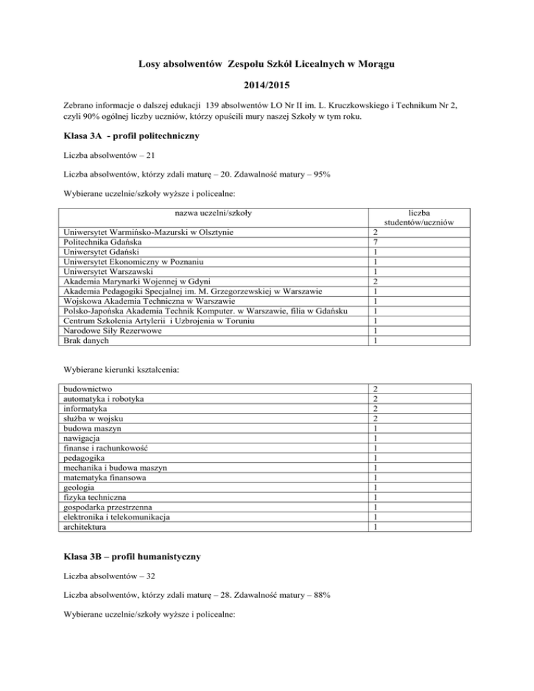 Losy absolwentów Zespołu Szkół Licealnych w Morągu 2014/2015 Zebrano informacje o dalszej edukacji 139 absolwentów LO Nr II im. L. Kruczkowskiego i Technikum Nr 2, czyli 90% ogólnej liczby uczniów, którzy opuścili mury naszej Szkoły w tym roku. Klasa 3A - profil politechniczny Liczba absolwentów – 21 Liczba absolwentów, którzy zdali maturę – 20. Zdawalność matury – 95% Wybierane uczelnie/szkoły wyższe i policealne: nazwa uczelni/szkoły Uniwersytet Warmińsko-Mazurski w Olsztynie Politechnika Gdańska Uniwersytet Gdański Uniwersytet Ekonomiczny w Poznaniu Uniwersytet Warszawski Akademia Marynarki Wojennej w Gdyni Akademia Pedagogiki Specjalnej im. M. Grzegorzewskiej w Warszawie Wojskowa Akademia Techniczna w Warszawie Polsko-Japońska Akademia Technik Komputer. w Warszawie, filia w Gdańsku Centrum Szkolenia Artylerii i Uzbrojenia w Toruniu Narodowe Siły Rezerwowe Brak danych liczba studentów/uczniów 2 7 1 1 1 2 1 1 1 1 1 1 Wybierane kierunki kształcenia: budownictwo automatyka i robotyka informatyka służba w wojsku budowa maszyn nawigacja finanse i rachunkowość pedagogika mechanika i budowa maszyn matematyka finansowa geologia fizyka techniczna gospodarka przestrzenna elektronika i telekomunikacja architektura Klasa 3B – profil humanistyczny Liczba absolwentów – 32 Liczba absolwentów, którzy zdali maturę – 28. Zdawalność matury – 88% Wybierane uczelnie/szkoły wyższe i policealne: 2 2 2 2 1 1 1 1 1 1 1 1 1 1 1 nazwa szkoły/uczelni Uniwersytet Warmińsko-Mazurski w Olsztynie Politechnika Gdańska Uniwersytet Gdański Uniwersytet im. A. Mickiewicza w Poznaniu Uniwersytet Warszawski Uniwersytet Rzeszowski Akademia Marynarki Wojennej w Gdyni Akademia Sztuk Pięknych w Gdańsku Szkoła policealna Wyjazd za granicę Praca liczba uczniów/studentów 12 1 2 1 1 1 1 1 9 2 1 Wybierane kierunki kształcenia: prawo bezpieczeństwo wewnętrzne administracja i zarządzanie filologia angielska finanse i rachunkowość logopedia elektrotechnika pedagogika wczesnoszkolna i przedszkolna teologia – nauki o rodzinie i mediacja dziennikarstwo stosunki międzynarodowe ekonomia wzornictwo socjologia technik fotografik technik bhp technik administracji technik usług kosmetycznych 3 4 2 1 1 1 1 1 1 1 1 1 1 1 1 1 6 1 Klasa 3C – profil medyczny Liczba absolwentów – 30 Liczba absolwentów, którzy zdali maturę – 29. Zdawalność matury – 97% Wybierane uczelnie/szkoły wyższe i policealne: nazwa szkoły/uczelni Uniwersytet Warmińsko-Mazurski w Olsztynie Gdański Uniwersytet Medyczny Uniwersytet Gdański Uniwersytet Kard. S. Wyszyńskiego w Warszawie Szkoła Główna Gospodarstwa Wiejskiego w Warszawie Elbląska Uczelnia Humanistyczno-Ekonomiczna w Elblągu Wyższa Szkoła Bankowa w Gdańsku Szkoła policealna Praca Brak danych Wybierane kierunki kształcenia: liczba uczniów/studentów 12 1 7 1 1 1 1 4 1 1 technologia żywności i żywienia człowieka biologia biotechnologia dietetyka pielęgniarstwo administracja zarządzanie filologia romańska żywienie człowieka i ocena żywności bezpieczeństwo wewnętrzne pedagogika filologia germańska psychologia analityka medyczna technik higienistka stomatologiczna technik administracji 2 3 2 3 1 1 1 1 1 3 2 1 1 1 2 1 Klasa 3D – profil sportowy Liczba absolwentów – 16 Liczba absolwentów, którzy zdali maturę – 13. Zdawalność matury – 81% Wybierane uczelnie/szkoły wyższe i policealne: nazwa szkoły/uczelni Uniwersytet Warmińsko-Mazurski w Olsztynie Wyższa Szkoła Policji w Szczytnie Wyjazd za granicę Szkoła policealna Narodowe Siły Rezerwowe liczba uczniów/studentów 6 1 1 7 1 Wybierane kierunki kształcenia: bezpieczeństwo narodowe bezpieczeństwo wewnętrzne dziennikarstwo leśnictwo 1 1 1 1 Klasa 3E – profil ekonomiczny Liczba absolwentów – 28 Liczba absolwentów, którzy zdali maturę – 27. Zdawalność matury – 96% Wybierane uczelnie/szkoły wyższe i policealne: nazwa szkoły/uczelni Uniwersytet Warmińsko-Mazurski w Olsztynie Wojskowa Akademia Techniczna w Warszawie Uniwersytet Gdański Politechnika Warszawska Akademia Wychowania Fizycznego i Sportu w Gdańsku Wyższa Szkoła Bankowa w Gdańsku Akademia Morska w Gdyni liczba uczniów/studentów 12 2 2 1 1 2 1 Państwowa Wyższa Szkoła Zawodowa w Elblągu Wyjazd za granicę Szkoła policealna Brak danych 1 1 1 4 Wybierane kierunki kształcenia: administracja wychowanie fizyczne transport i logistyka służby specjalne i policyjne bezpieczeństwo wewnętrzne elektrokardiologia geodezja i szacowanie nieruchomości gospodarka wodna ekonomia ekonomia menadżerska informatyka turystyka pedagogika opiekuńcza kryptologia i cyberbezpieczeństwo oceanografia gospodarka przestrzenna geodezja i kartografia informatyka i ekonomia 2 1 1 1 2 1 1 1 2 1 1 1 1 1 1 2 1 1 Klasa 4T – technik informatyk Liczba absolwentów – 29 Liczba absolwentów, którzy zdali maturę – 23. Zdawalność matury – 79% Wybierane uczelnie/szkoły wyższe i policealne: nazwa szkoły Uniwersytet Warmińsko-Mazurski w Olsztynie Państwowa Wyższa Szkoła Zawodowa w Elblągu Uniwersytet Gdański Wyższa Szkoła Informatyki Stosowanej i Zarządzania w Warszawie Szkoła policealna Praca Wyjazd za granicę Brak danych liczba uczniów/studentów 6 1 1 1 1 8 2 9 Wybierane kierunki kształcenia: międzynarodowe stosunki gospodarcze informatyka informatyka stosowana bezpieczeństwo wewnętrzne inżynieria systemów informatycznych gospodarka przestrzenna mechanika i budowa maszyn 1 3 1 1 1 1 1 Dane dla szkoły: Wybierane uczelnie/szkoły : Uniwersytet Warmińsko-Mazurski w Olsztynie Uniwersytet Gdański Politechnika Gdańska Wojskowa Akademia Techniczna w Warszawie Akademia Marynarki Wojennej w Gdyni Wyższa Szkoła Bankowa w Gdańsku Uniwersytet Warszawski Uniwersytet Kard. Stefana Wyszyńskiego w Warszawie Uniwersytet im. Adama Mickiewicza w Poznaniu Uniwersytet Ekonomiczny w Poznaniu Uniwersytet Rzeszowski Gdański Uniwersytet Medyczny Politechnika Warszawsk