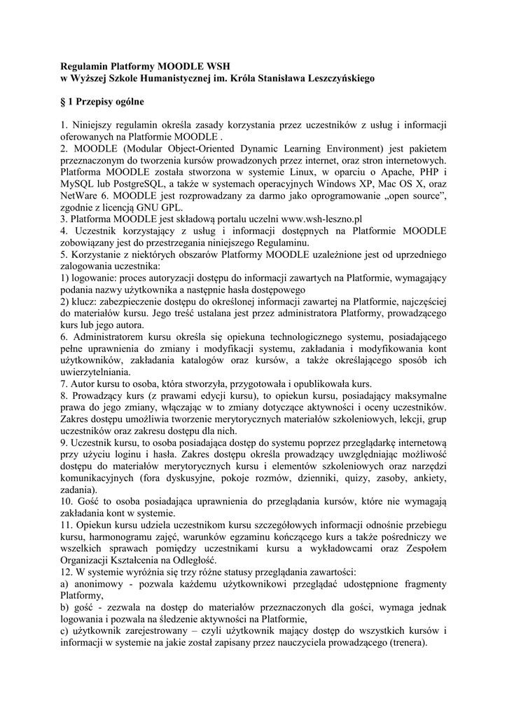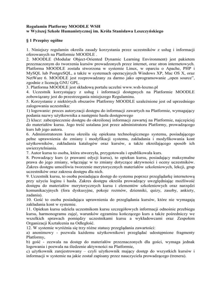 Regulamin Platformy MOODLE WSH w Wyższej Szkole Humanistycznej im. Króla Stanisława Leszczyńskiego § 1 Przepisy ogólne 1. Niniejszy regulamin określa zasady korzystania przez uczestników z usług i informacji oferowanych na Platformie MOODLE . 2. MOODLE (Modular Object-Oriented Dynamic Learning Environment) jest pakietem przeznaczonym do tworzenia kursów prowadzonych przez internet, oraz stron internetowych. Platforma MOODLE została stworzona w systemie Linux, w oparciu o Apache, PHP i MySQL lub PostgreSQL, a także w systemach operacyjnych Windows XP, Mac OS X, oraz NetWare 6. MOODLE jest rozprowadzany za darmo jako oprogramowanie „open source”, zgodnie z licencją GNU GPL. 3. Platforma MOODLE jest składową portalu uczelni www.wsh-leszno.pl 4. Uczestnik korzystający z usług i informacji dostępnych na Platformie MOODLE zobowiązany jest do przestrzegania niniejszego Regulaminu. 5. Korzystanie z niektórych obszarów Platformy MOODLE uzależnione jest od uprzedniego zalogowania uczestnika: 1) logowanie: proces autoryzacji dostępu do informacji zawartych na Platformie, wymagający podania nazwy użytkownika a następnie hasła dostępowego 2) klucz: zabezpieczenie dostępu do określonej informacji zawartej na Platformie, najczęściej do materiałów kursu. Jego treść ustalana jest przez administratora Platformy, prowadzącego kurs lub jego autora. 6. Administratorem kursu określa się opiekuna technologicznego systemu, posiadającego pełne uprawnienia do zmiany i modyfikacji systemu, zakładania i modyfikowania kont użytkowników, zakładania katalogów oraz kursów, a także określającego sposób ich uwierzytelniania. 7. Autor kursu to osoba, która stworzyła, przygotowała i opublikowała kurs. 8. Prowadzący kurs (z prawami edycji kursu), to opiekun kursu, posiadający maksymalne prawa do jego zmiany, włączając w to zmiany dotyczące aktywności i oceny uczestników. Zakres dostępu umożliwia tworzenie merytorycznych materiałów szkoleniowych, lekcji, grup uczestników oraz zakresu dostępu dla nich. 9. Uczestnik kursu, to osoba posiadająca dostęp do systemu poprzez przeglądarkę internetową przy użyciu loginu i hasła. Zakres dostępu określa prowadzący uwzględniając możliwość dostępu do materiałów merytorycznych kursu i elementów szkoleniowych oraz narzędzi komunikacyjnych (fora dyskusyjne, pokoje rozmów, dzienniki, quizy, zasoby, ankiety, zadania). 10. Gość to osoba posiadająca uprawnienia do przeglądania kursów, które nie wymagają zakładania kont w systemie. 11. Opiekun kursu udziela uczestnikom kursu szczegółowych informacji odnośnie przebiegu kursu, harmonogramu zajęć, warunków egzaminu kończącego kurs a także pośredniczy we wszelkich sprawach pomiędzy uczestnikami kursu a wykładowcami oraz Zespołem Organizacji Kształcenia na Odległość. 12. W systemie wyróżnia się trzy różne statusy przeglądania zawartości: a) anonimowy - pozwala każdemu użytkownikowi przeglądać udostępnione fragmenty Platformy, b) gość - zezwala na dostęp do materiałów przeznaczonych dla gości, wymaga jednak logowania i pozwala na śledzenie aktywności na Platformie, c) użytkownik zarejestrowany – czyli użytkownik mający dostęp do wszystkich kursów i informacji w systemie na jakie został zapisany przez nauczyciela prowadzącego (trenera). 13. Przez kurs rozumie się realizowane w jednym semestrze zajęcia dydaktyczne w formie: wykładu lub ćwiczeń: a) kursy mogą odbywać się także w językach obcych, b) kursy prowadzone są z wykorzystaniem metod i technik kształcenia na odległość. 14. Usługi na Platformie MOODLE świadczy Wyższa Szkoła Humanistyczna im. Króla Stanisława Leszczyńskiego zwana dalej usługodawcą. § 2 Prawa i obowiązki Uczestnika Kursu 1. Uczestnik kursu musi dysponować dostępem do sieci internet jak również do komputera z zainstalowaną przeglądarką internetową, włączoną obsługą Cookies oraz sprzętem i oprogramowaniem umożliwiającym przeglądanie dokumentów i prezentacji multimedialnych. Powinien także wykazać się podstawową wiedzą z zakresu obsługi przeglądarki internetowej. 2. Uczestnik zobowiązuje się do nie przekazywania osobom trzecim przyznanego przez usługodawcę identyfikatora i hasła dostępu do kursu. 3. W szczególności uczestnik zobowiązany jest do: a) nie przekazywania za pośrednictwem portalu żadnych materiałów niezgodnych z prawem, normami społecznymi i obyczajowymi, lub mogących zachęcać innych uczestników kursu do zachowania uznawanego za przestępstwo lub naruszenie prawa, b) nie podejmowania prób złamania hasła innych uczestników, czy też do uzyskania nie przysługujących mu praw dostępu, c) nie wprowadzania na Platformę MOODLE treści niezgodnych z niniejszym Regulaminem oraz innymi przepisami obowiązującymi w uczelni. 4. Uczestnik ma prawo do: a) wglądu do swoich danych, oraz możliwości ich poprawienia, b) w przypadku pytań, sugestii oraz problemów do konsultacji z opiekunem kursu, c) osobistych konsultacji w siedzibie uczelni jak również do konsultacji w postaci forum na Platformie MOODLE, d) udziału w szkoleniach przygotowujących do zajęć dydaktycznych prowadzonych z wykorzystaniem metod i technik kształcenia na odległość. §3 Zasady uczestnictwa w kursie 1. Warunkiem podstawowym przystąpienia do kursu jest wstąpienie w poczet studentów Wyższej Szkoły Humanistycznej im. Króla Stanisława Leszczyńskiego w Lesznie. 2. Uczestnicy są rejestrowani w kolejności według numeru albumu. 3. Login i hasło do systemu szkoleniowego udostępnione będzie w ciągu 14 dniu od momentu złożenia dokumentów. § 4 Kursy 1. Przez kurs rozumie się realizowane w jednym semestrze zajęcia dydaktyczne w formie: wykładu lub ćwiczeń: a. kursy mogą odbywać się także w językach obcych, b. kursy prowadzone są z wykorzystaniem metod i technik kształcenia na odległość. 2. Przez zdalny tryb nauczania