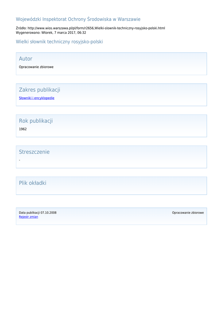 Wojewódzki Inspektorat Ochrony Środowiska w Warszawie Źródło: http://www.wios.warszawa.pl/pl/form/r2656,Wielki-slownik-techniczny-rosyjsko-polski.html Wygenerowano: Wtorek, 7 marca 2017, 06:32 Wielki słownik techniczny rosyjsko-polski Autor Opracowanie zbiorowe Zakres publikacji Słowniki i encyklopedie Rok publikacji 1962 Streszczenie - Plik okładki Data publikacji 07.10.2008 Rejestr zmian Opracowanie zbiorowe