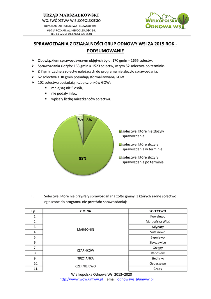 URZĄD MARSZAŁKOWSKI WOJEWÓDZTWA WIELKOPOLSKIEGO DEPARTAMENT ROLNICTWA I ROZWOJU WSI 61-714 POZNAŃ, AL. NIEPODLEGŁOŚCI 34, TEL. 61 626 65 00, FAX 61 626 65 01 SPRAWOZDANIA Z DZIAŁALNOŚCI GRUP ODNOWY WSI ZA 2015 ROK PODSUMOWANIE Obowiązkiem sprawozdawczym objętych było: 170 gmin = 1655 sołectw. Sprawozdania złożyło: 163 gmin = 1523 sołectw, w tym 52 sołectwa po terminie. Z 7 gmin żadne z sołectw należących do programu nie złożyło sprawozdania. 62 sołectwa z 30 gmin posiadają sformalizowaną GOW. 102 sołectwa posiadają liczbę członków GOW: mniejszą niż 5 osób, nie podały info., wpisały liczbę mieszkańców sołectwa. 4% 8% sołectwa, które nie złożyły sprawozdania sołectwa, które złożyły sprawozdania w terminie 88% I. l.p. 1. 2. 3. 4. 5. 6. 7. 8. 9. 10. 11. sołectwa, które złożyły sprawozdania po terminie Sołectwa, które nie przysłały sprawozdań (na żółto gminy, z których żadne sołectwo zgłoszone do programu nie przesłało sprawozdania): GMINA MARGONIN CZARNKÓW TRZCIANKA CZERNIEJEWO SOŁECTWO Kowalewo Margońska Wieś Młynary Sułaszewo Sypniewo Zbyszewice Grzępy Radosiew Siedlisko Gębarzewo Graby Wielkopolska Odnowa Wsi 2013–2020 http://www.wow.umww.pl email: [email protected] URZĄD MARSZAŁKOWSKI WOJEWÓDZTWA WIELKOPOLSKIEGO DEPARTAMENT ROLNICTWA I ROZWOJU WSI 61-714 POZNAŃ, AL. NIEPODLEGŁOŚCI 34, TEL. 61 626 65 00, FAX 61 626 65 01 12. 13. 14. 15. 16. 17. 18. 19. 20. 21. 22. 23. 24. 25. 26. 27. 28. 29. 30. 31. 32. 33. 34. 35. 36. 37. 38. 39. 40. 41. 42. 43. 44. 45. 46. 47. 48. 49. 50. 51. 52. 53. 54. 55. ŁUBOWO MIELESZYN RAKONIEWICE ŻERKÓW MYCIELIN OPATÓWEK SZCZYTNIKI KOŁO OLSZÓWKA RZGÓW KRZYWIŃ LWÓWEK RYCZYWÓŁ Kosowo Pakszyn Rakowo Imielenko Siemianowo Wierzyce Żydówko Mieleszyn Adolfowo Blinek Cegielsko Elżbieciny Gnin Kuźnica Zbąska Łąkie Nowe Narożniki Rakoniewice Wieś Stodolsko Wioska Lubinia Mała Kuszyn Chełmce Antonin Sobiesęki Drugie Kiełczew Smużny Pierwszy Krzewata Bożatki Kurów Świątniki Jurkowo Łagowo Świniec Wieszkowo Chmielinko Józefowo Krzywy Las Pawłówek Posadowo Dąbrówka Ludomska Gorzewo Gościejewko Łopiszewo Ninino Piotrowo Wielkopolska Odnowa Wsi 2013–2020 http://www.wow.umww.pl email: [email protected] URZĄD MARSZAŁKOWSKI WOJEWÓDZTWA WIELKOPOLSKIEGO DEPARTAMENT ROLNICTWA I ROZWOJU WSI 61-714 POZNAŃ, AL. NIEPODLEGŁOŚCI 34, TEL. 61 626 65 00, FAX 61 626 65 01 56. 57. 58. 59. 60. 61. 62. 63. 64. 65. 66. 67. 68. 69. 70. 71. 72. 73. 74. 75. 76. 77. 78. 79. 80. 81. 82. 83. 84. 85. 86. 87. 88. 89. 90. 91. 92. 93. 94. 95. 96. 97. 98. 99. OSTRÓW WLKP. ŁOBŻENICA WYRZYSK KÓRNIK MOSINA TARNOWO PODGÓRNE OBRZYCKO SZAMOTUŁY Skrzetusz Wiardunki Zawady Cegły Daniszyn Łobżenica Bąkowo Dąbki Karolewo-Wiernowo Konstantynowo Młotkówko Polanowo Ruda Rzęszkowo Wyrzysk Skarbowy Żuławka Runowo Babki,Kubalin,Głuszyna Leśna Czapury Dymaczewo Nowe Rogalin Tarnowo Podgórne Wysogotowo Gaj Mały Jaryszewo Koźmin Obrowo Ordzin Pęckowo Piotrowo Słopanowo Stobnicko Zielonagóra Baborowo Baborówko Brodziszewo Emilianowo Gałowo Jastrowo Lulinek Myszkowo Piaskowo Piotrkówko Przyborowo Wielkopolska Odnowa Wsi 2013–2020 http://www.wow.umww.pl email: [email protected] URZĄD MARSZAŁKOWSKI WOJEWÓDZTWA WIELKOPOLSKIEGO DEPARTAMENT ROLNICTWA I ROZWOJU WSI 61-714 POZNAŃ, AL. NIEPODLEGŁOŚCI 34, TEL. 61 626 65 00, FAX 61 626 65 01 100. 101. 102. 103. 104. 105. 106. 107. 108. 109. 110. 111. 112. 113. 114. 115. 116. 117. 118. 119. 120. 121. 122. 123. 124. 125. 126. 127. 128. 129. 130. 131. 132. II. l.p. 1. 2. 3. 4. 5. 6. WRONKI DOMINOWO ŚREM WŁADYSŁAWÓW WAPNO WĄGROWIEC KOŁACZKOWO PYZDRY KRAJENKA ZŁOTÓW Przyborówko Śmiłowo Pożarowo Zbierki Ostrowo Beznazwa Chylin Głogowa Kuny Leonia Natalia Olesin Polichno Stefania Tarnowski Młyn Władysławów i Felicjanów Wyszyna, Stawki i Przyborów Rusiec Stołężyn Wapno Wapno Południe Micharzewo Borzykowo Gorazdowo Ciemierów Kolonia Barankowo Łońsko Maryniec Pogórze Tarnówczyn Wąsoszki Żeleźnica Klukowo Sołectwa, które po terminie przesłały sprawozdania (na zielono gminy, z których wszystkie sołectwa przesłały sprawozdania po terminie): GMINA RAKONIEWICE KRAMSK WIERZBINEK SOŁECTWO Drzymałowo Łąkie Ruchocice Heleniów Drugi Kalina Łysek Wielkopolska Odnowa Wsi 2013–2020 http://www.wow.umww.pl email: [email protected] URZĄD MARSZAŁKOWSKI WOJEWÓDZTWA WIELKOPOLSKIEGO DEPARTAMENT ROLNICTWA I ROZWOJU WSI 61-714 POZNAŃ, AL. NIEPODLEGŁOŚCI 34, TEL. 61 626 65 00, FAX 61 626 65 01 7. 8. 9. 10. 11. 12. 13. 14. 15. 16. 17. 18. 19. 20. 21. 22. 23. 24. 25. 26. 27. 28. 29. 30. 31. 32. 33. 34. 35. 36. 37. 38. 39. 40. 41. 42. 43. 44. 45. 46. 47. 48. 49. 50. 51. 52. KRZYWIŃ KOBYLIN KWILCZ KÓRNIK BOJANOWO JUTROSIN WRONKI KRZYKOSY Wierzbinek Bielewo Lubiń Łuszkowo Nowy Dwór Zbęchy Zgliniec Żelazno Górka Kobylin Kuklinów Rębiechów Smolice Wyganów Daleszynek Kurnatowice Kwilcz Miłostowo Niemierzewo Prusim Czmoniec Czołowo Gądki Kamionki Gołaszyn Gościejewice Kawcze Tarchalin Bartoszewice Bielawy Grąbkowo Śląskowo Zaborowo Samołęż Garby Krzykosy Miąskowo Młodzikowo Młodzikówko Murzynowo Leśne Pięczkowo Solec Sulęcin Sulęcinek Wiosna Witowo Wielkopolska Odnowa Wsi 2013–2020 http://www.wow.umww.pl email: [email protected] URZĄD MARSZAŁKOWSKI WOJEWÓDZTWA WIELKOPOLSKIEGO DEPARTAMENT ROLNICTWA I ROZWOJU WSI 61-714 POZNAŃ, AL. NIEPODLEGŁOŚCI 34, TEL. 61 626 65 00, FAX 61 626 65 01 III. L.P. 1. 2. Sołectwa, w których GOW ma charakter sformalizowany: GMINA MARGONIN 3. SOŁECTWO Lipiny Studźce-Adolfowo Zbyszewice 4. WIELEŃ Dębogóra 5. 6. TRZEMESZNO Szydłowo Trzemżal 7. KROBIA Potarzyca 8. 9. 10. 11. 12. 13. 14. 15. 16. 17. 18. 19. 20. 21. POGORZELA Kromolice Morawin Szadek Małgów Pyczek Strzałków Kierzno Kliny Zakrzewo Modła Daleszynek Gorzyń Brody Bródki CEKÓW-KOLONIA LISKÓW KĘPNO BABIAK RZGÓW KWILCZ MIĘDZYCHÓD 22. 23. Grońsko LWÓWEK Konin 24. Linie 25.