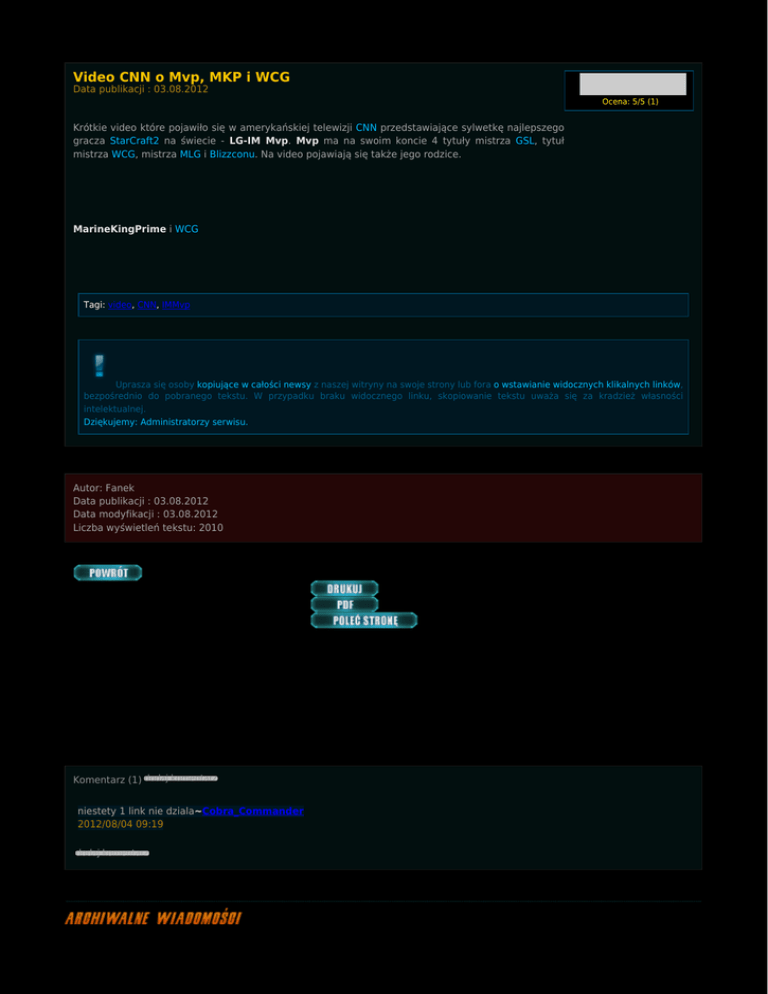Video CNN o Mvp, MKP i WCG Data publikacji : 03.08.2012 Ocena: 5/5 (1) Krótkie video które pojawiło się w amerykańskiej telewizji CNN przedstawiające sylwetkę najlepszego gracza StarCraft2 na świecie - LG-IM Mvp. Mvp ma na swoim koncie 4 tytuły mistrza GSL, tytuł mistrza WCG, mistrza MLG i Blizzconu. Na video pojawiają się także jego rodzice. MarineKingPrime i WCG Tagi: video, CNN, IMMvp Uprasza się osoby kopiujące w całości newsy z naszej witryny na swoje strony lub fora o wstawianie widocznych klikalnych linków, bezpośrednio do pobranego tekstu. W przypadku braku widocznego linku, skopiowanie tekstu uważa się za kradzież własności intelektualnej. Dziękujemy: Administratorzy serwisu. Autor: Fanek Data publikacji : 03.08.2012 Data modyfikacji : 03.08.2012 Liczba wyświetleń tekstu: 2010 Komentarz (1) dodaj komentarz niestety 1 link nie dziala~Cobra_Commander 2012/08/04 09:19 dodaj komentarz 08.10.2015 Kampania "Szepty o zagładzie" dostępna za darmo (0 komentarzy) 27.09.2015 Kolejni bohaterowie w trybie Sprzymierzonych Dowódców (0 komentarzy) 22.09.2015 Cyfrowe gadżety za udział w BlizzCon 2015 (0 komentarzy) 15.07.2015 Legacy of the Void dostępne w przedsprzedaży! (0 komentarzy) 17.06.2015 Informacje z E3 - prolog kampanii Legacy of the Void (0 komentarzy) 30.05.2015 WCS Europe - sobota (30 maja) 18.00 grupa G - MaNa! (0 komentarzy) 07.05.2015 DreamHack Open France 2015 - już 8 maja - MaNa! (0 komentarzy) 03.05.2015 Na wesoło: postacie E-sportu 50 (0 komentarzy) 03.05.2015 IEM Katowice 2015 - jeszcze raz! (0 komentarzy) 03.05.2015 KeSPA Cup 2015 Season 1 - live! (0 komentarzy) 26.04.2015 Proleague - Top5 gier miesiąca (0 komentarzy) 26.04.2015 CJ Entus wygrywa 2 runde Proleague! (0 komentarzy) 18.04.2015 Wersja beta Legacy of the Void – aktualizacja 2.5.1 (0 komentarzy) 18.04.2015 WCS finals 2015 - galeria (0 komentarzy) 18.04.2015 Omówienie zmian w balansie Legacy of the Void (0 komentarzy) 11.04.2015 WCS Europe kwalifikacje z Polakami - dziś (sobota) 18.00 (0 komentarzy) 11.04.2015 Aktualizacja balansu Heart of the Swarm – 9 kwietnia (0 komentarzy) 11.04.2015 GSL Season1 2015 - galeria (0 komentarzy) 11.04.2015 Zbanowane konta w StarCraft II (0 komentarzy) 04.04.2015 Red Bull Battle Grounds powraca jesienią 2015 (0 komentarzy) (zobacz wszystkie)