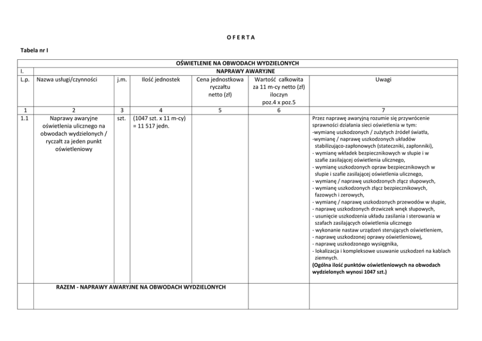 O F E R T A Tabela nr I OŚWIETLENIE NA OBWODACH