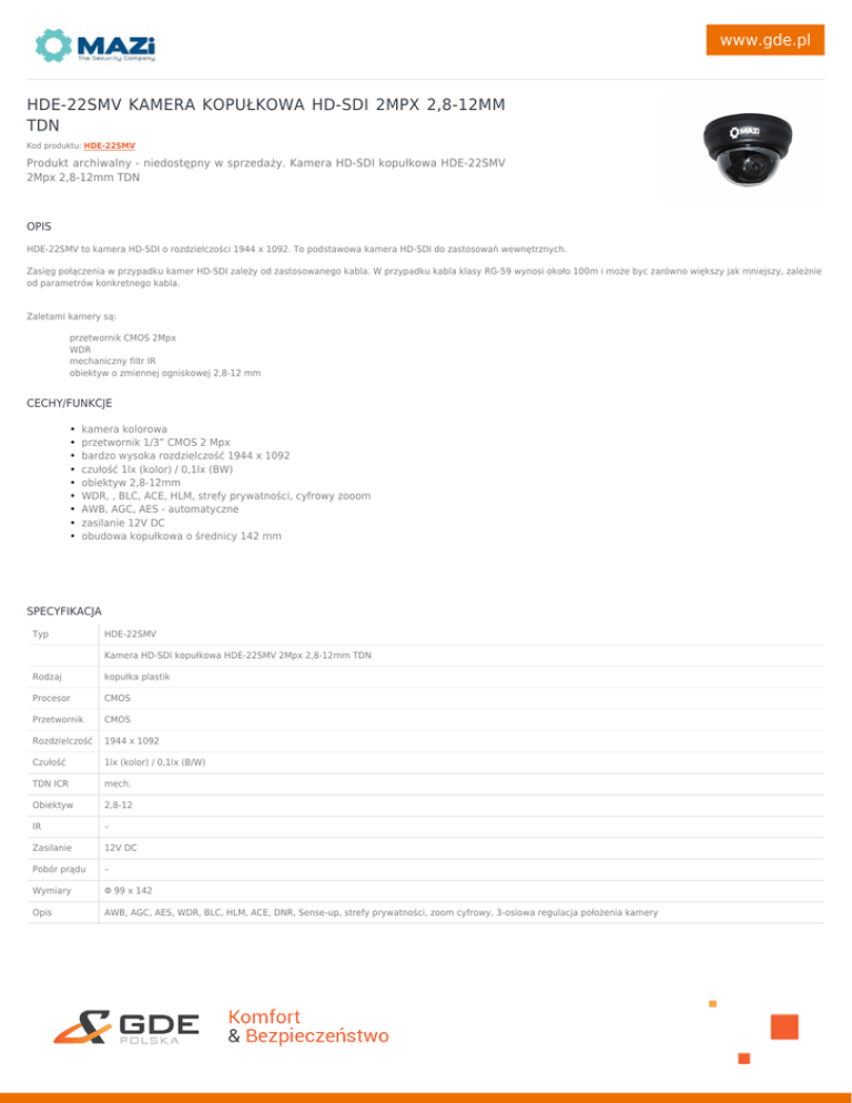 www.gde.pl HDE-22SMV KAMERA KOPUŁKOWA HD