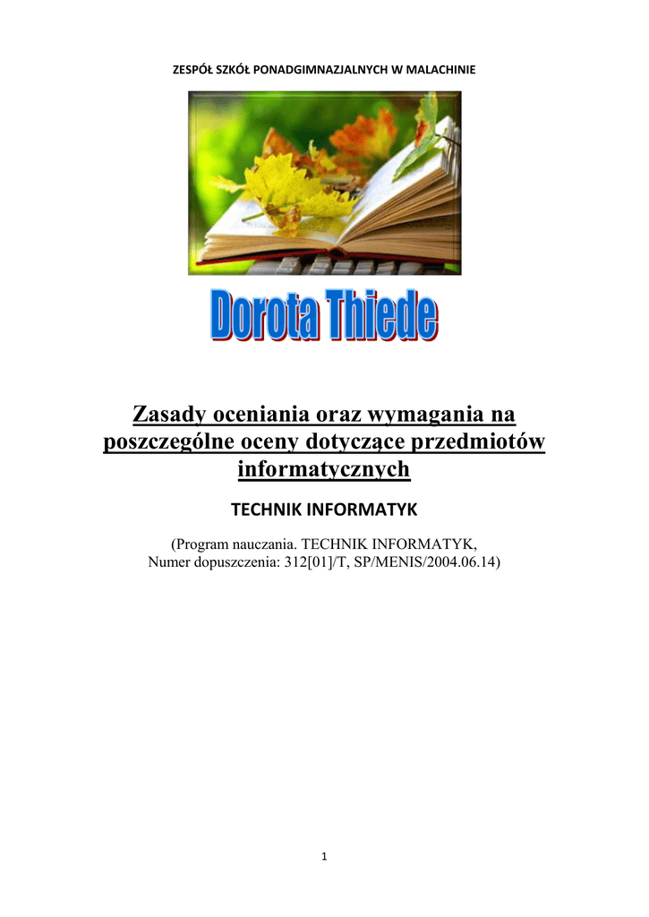 ZESPÓŁ SZKÓŁ PONADGIMNAZJALNYCH W MALACHINIE Zasady oceniania oraz wymagania na poszczególne oceny dotyczące przedmiotów informatycznych TECHNIK INFORMATYK (Program nauczania. TECHNIK INFORMATYK, Numer dopuszczenia: 312[01]/T, SP/MENIS/2004.06.14) 1 1. Ocenianiu podlegają poniższe formy aktywności. Poszczególnym formom przyporządkowane są wagi ocen: Forma aktywności Praca klasowa (z całego działu) Projekt Sprawdzian (powyżej trzech lekcji) Kartkówka (trzy ostatnie lekcje) Odpowiedź ustna (trzy ostatnie lekcje) Aktywność /ćwiczenie Pisemne prace domowe Waga 4 4 3 2 2 1 1 2. We wszystkich formach oceniania przyjmuje się następujące zasady: Od 0% do 39% Od 40% do 43% Od 44% do 46% Od 47% do 52% Od 53% do 58% Od 59% do 64% Od 65% do 70% Od 71% do 76% Od 77% do 85% Od 86% do 89% Od 90% do 94% Od 95% do 98% Od 99% do 100% - ocena niedostateczna - ocena dopuszczająca - ocena dopuszczająca+ - ocena dostateczna- ocena dostateczna - ocena dostateczna + - ocena dobra- ocena dobra - ocena dobra+ - ocena bardzo dobra- ocena bardzo dobra - ocena bardzo dobra+ - ocena celująca 3. Podstawą wystawienia oceny na koniec semestru będzie średnia ważona ocen, otrzymanych w ciągu całego semestru: czyli suma iloczynów poszczególnych ocen i ich wag podzielona przez sumę poszczególnych wag ocen np. kartkówka ocena- 3, sprawdzian oceny- 2, 4, ocena z odpowiedzi ustnej- 4 Kolorem czerwonym oznaczono wagi ocen 2 4. Zależność oceny na koniec semestru od średniej ważonej przedstawia następująca tabela: Średnia ważona (SW) SW<1,75 1,76<SW<1,95 1,96<SW<2,25 2,26<SW<2,75 2,76<SW<2,90 2,91<SW<3,25 3,26<SW<3,75 3,76<SW<3,90 3,91<SW<4,25 4,26<SW<4,75 4,76<SW<4,90 4,91<SW<5,25 5,26<SW<5,75 5,76<SW Ocena 1 1+ 2 2+ 33 3+ 44 4+ 55 5+ 6 5. Ocena na koniec roku zostaje wystawiona na podstawie dwóch ocen wystawionych na koniec obu semestrów według następującej tabeli: Isem 1 IIsem 1 1+ 2 2+ 3 3+ 4 4+ 5 5+ 6 1 1 1 1 2 2 3 3 3 3 4 1+ 2 2+ 3 3+ 4 4+ 5 5+ 6 1 1 1 2 2 3 3 3 3 4 4 1 2 2 2 3 3 3 3 4 4 4 2 2 3 3 3 3 4 4 4 4 5 2 3 3 3 3 4 4 4 5 5 5 3 3 3 4 4 4 5 5 5 6 6 1 1 2 2 3 3 3 3 4 4 4 2 2 2 3 3 3 4 4 4 4 4 3 2 3 3 3 3 4 4 4 4 5 5 3 3 3 3 4 4 4 5 5 5 6 3 4 4 4 4 5 5 5 6 6 6 6. Dodatkowe wymagania: a) Prowadzenie zeszytu przedmiotowego jest obowiązkowe i może podlegać ocenie. b) Termin pracy klasowej oraz sprawdzianu jest uzgadniany z uczniami, na co najmniej tydzień wcześniej. c) W przypadku nieusprawiedliwionej nieobecność na zapowiedzianym sprawdzianie uczeń otrzymuje ocenę niedostateczną. d) Jeżeli uczeń z przyczyn usprawiedliwionych nie był na sprawdzianie, pracy klasowej lub kartkówce ma obowiązek napisać go na pierwszej lekcji, na którą przyjdzie po nieobecności. e) Uczeń ma prawo do poprawy pracy klasowej, sprawdzianu lub odpowiedzi ustnej, w ciągu semestru, w terminie dwóch tygodni od terminu pierwotnego, ocena uzyskana z poprawy jest oceną ostateczną. f) Uczniowie „ściągający” na wszelkiego rodzaju zaliczeniach otrzymują z nich ocenę niedostateczną i tracą prawo do jej poprawy. g) Do kartkówki lub odpowiedzi z ostatnich trzech lekcji uczeń ma obowiązek być przygotowany na każdych zajęciach. h) Oceny z zadań, aktywności na lekcji, ćwiczeń itp. nie podlegają poprawie i) Zakwalifikowanie się do etapu wojewódzkiego konkursu przedmiotowego powoduje otrzymanie oceny celującej. j) Uczeń ma obowiązek uzupełniania braków wiadomości i umiejętności wskazanych przez nauczyciela i przestrzegania ustalonych w PSO reguł. k) Nieobecność na lekcji nie zwalnia ucznia z przygotowania się do zajęć i możliwości odpowiedzi a także sprawdzianu, testu czy kartkówki za wyjątkiem dłuższej usprawiedliwionej nieobecności odznaczonej w dzienniku lekcyjnym spowodowanej chorobą lub inną ważną przyczyną l) Uczeń ma prawo: do znajomości kryteriów oceniania, egzaminu sprawdzającego, otrzymania uzasadnienia oceny, zgłoszenia do dyrektora szkoły, w formie pisemnej, w ciągu 3 dni od daty wystawienia oceny, zastrzeżenia wskazując naruszoną zasadę. m) Prace klasowe, sprawdziany oraz kartkówki są do wglądu dla ucznia oraz rodzica przez cały rok szkolny, przechowywane są przez nauczyciela. 7. Kryteria przyznawania ocen semestralnych i końcoworocznych Stopień celujący otrzymuje uczeń , który: a) posiadł wiedzę i umiejętności zgodnie z programem nauczania dla zawodu technika informatyka w danej klasie, samodzielnie i twórczo rozwija własne uzdolnienia, b) biegle posługuje się zdobytymi wiadomościami w rozwiązywaniu problemów praktycznych i teoretycznych programu danej klasy, proponuje rozwiązania nietypowe i niekonwencjonalne, rozwiązuje samodzielnie trudne problemy c) osiąga sukcesy w konkursach i olimpiadach przedmiotowych. 4 Stopień bardzo dobry otrzymuje uczeń , który: a) posiadł wiedzę i umiejętności na poziomie określonym programem dla zawodu technika informatyka w danej klasie, b) sprawnie posługuje się zdobytymi wiadomościami , rozwiązuje samodzielnie problemy teoretyczne i praktyczne ujęte programem nauczania, potrafi zastosować wiedzę i umiejętności do rozwiązywania zadań i problemów w nowych sytuacjach, c) aktywnie włącza się do współzawodnictwa w konkursach i olimpiadach przedmiotowych. Stopień dobry otrzymuje uczeń , który: a) opanował wiadomości i nabył umiejętności na poziomie rozszerzającym wymagania zawarte w podstawie programowej, b) samodzielnie i poprawnie wykonuje średniotrudne zadania praktyczne i teoretyczne, c) potrafi stosować nabyte umiejętności i wiadomości w sytuacjach typowych. Stopień dostateczny otrzymuje uczeń ,który: a) opanował wiadomości i umiejętności określone w podstawie programowej na b) poziomie wymagań podstawowych stosunkowo łatwych do opanowania, absolutnie niezbędnych do kontynuowania nauki na wyższym poziomie, c) samodzielnie rozwiązuje typowe zadania praktyczne i teoretyczne o niewielkim stopniu trudności. Sto