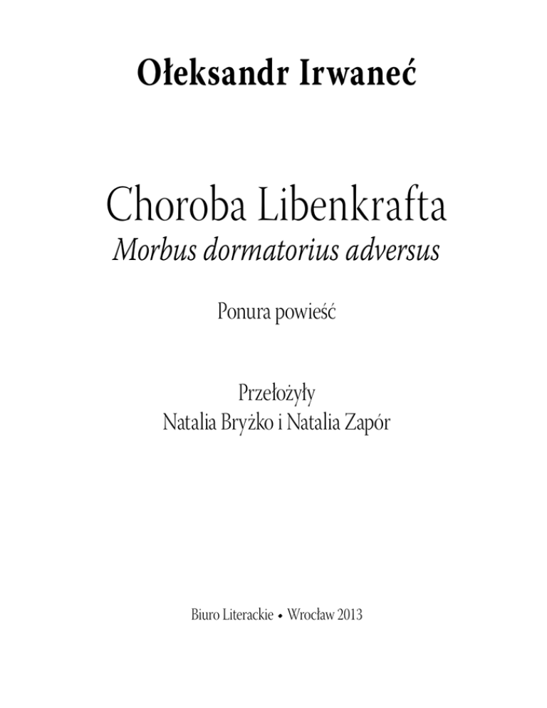 Ołeksandr Irwaneć Choroba Libenkrafta Morbus dormatorius adversus Ponura powieść Przełożyły Natalia Bryżko i Natalia Zapór Biuro Literackie • Wrocław 2013 3 N iestety nie mogło być żadnej pomyłki. Dwukrotnie dotknął powieki – plamka niczym specjalnym się nie wyróżniała. Żadnego zgrubienia, pieczenia czy swę- dzenia. Otworzył lewe oko, zamknął prawe. Na prawej powiece było to samo. Mała plamka. Ledwo widoczna. Wytarł ręce w ręcznik i wilgotnymi, chłodnymi dłońmi dokładnie przetarł oczy. Przyjrzał się im ponownie, zamykając i otwierając raz lewą, raz prawą powiekę, jak gdyby sam do siebie puszczał oczka. Plamki nie znikały. Pomyślał, że powinien się przestraszyć, ale nie czuł lęku. Czuł jedynie zdziwienie. Zamknął oczy i nadal wszystko widział. Przez zamknięte powieki. Miał wrażenie, że lustro na ścianie się rozjaśniło i ukazało odbicie jego twarzy, szyi, ramion jakoś nawet wyraźniej niż na jawie. Z jego oblicza biły spokój i równowaga. W tej samej chwili przez zamknięte drzwi zobaczył sypialnię, a w niej śpiącą Lidę, która obróciła się na drugi bok i naciągnęła kołdrę na głowę. Widział również, jak gdzieś na dole sąsiad pochylił się nad sedesem, a jeszcze głębiej i niżej, w piwnicy, szarymi, ciepłymi plamami przemknęło stadko szczurów. Igor zamyślił się. Stał oparty rękoma o umywalkę. Nadal nie odczuwał strachu. Wróciło za to poczucie rzeczywistości. Teraz nie może już wyjść na zewnątrz. Nie wie nawet, jak zareaguje Lida. Trzeba by to jakoś ukryć. Ale jak? Zaraz, zaraz. Na półeczce obok umywalki zawsze panował nieład. Puste flakony po dawno zużytych wodach kolońskich, napoczęta paczka zeschniętego kwasu bornego, inne substancje nieznanego pochodzenia 89 w opakowaniach bez etykietek i pudełkach od zapałek, połamane szczoteczki do zębów, powyginane igły i spinacze, cieniutkie, płaskie resztki mydeł i inne badziewie. Gdzieś wśród tego bałaganu, w głębi trzeciego czy czwartego jego kręgu, od dawien dawna poniewierało się okrągłe zagraniczne puzderko. Z okazji ślubu dostali je w prezencie od jakichś znajomych Lidy. To był prawdziwy, importowany puder. Igorowi przypomniało się, jak kiedyś, na początku ich wspólnego życia, lubił czasem otworzyć tę pudernicę, wtedy jeszcze pełną gęsto sprasowanego, różowego proszku i powąchać jego lekki, słodkawy zapach. Puder był cudowny, delikatny w dotyku i kolorze. Z góry, już w pudełeczku, przykrywał go jeszcze krążek cieniutkiej folii, również różowej, ozdobionej jakimiś kędzierzawymi wizerunkami. Pewnego razu uświadomił sobie, że ta pudernica jest w ich domu naprawdę jedyną zagraniczną rzeczą. Pod przykrywką była kiedyś mała gąbka – różowa, porowata i równie jak puder pachnąca. Z czasem gąbka przesiąkła pudrem і skórą, której stale dotykała, a potem pomału się zeschła. Jeszcze później Igor zauważył, jak żona nakłada rzadki kosmetyk na twarz, wybierając go kawałkiem wacika. Gąbka się gdzieś zapodziała. W końcu Lida zużyła cały puder i pojemniczek trafił między badziewie na półce tylko dlatego, że szkoda go było wyrzucić. Nadal był piękny, choć pusty. І zachował swój wcześniejszy zapach. Igor już coraz rzadziej otwierał go, żeby powdychać – jak sam to kiedyś określił w myślach – aromat „startych płatków róży”. Marynka jakoś nie chciała się nim bawić. Wolała wystrugane z drewna lalki, wśród których przeważały robotnice oraz chłopki. Tak oto pudełeczko leżało sobie i starzało się w mroku łazienkowej wnęki, a teraz nie chciało się otworzyć, bo jego brzegi nasiąkły wilgocią i zrosły się na dobre. Igor mocno pochwycił krążek, pokręcił nim na różne strony, przesuwając wreszcie połówki. Podważył jeden z brzegów paznokciem, szarpnął z całej siły i w nozdrza uderzył go zapomniany różany zapach, wciąż mocny, choć nieco przesiąknięty stęchlizną. 90 *** W teatrze okazało się, że warsztaty z ruchu scenicznego są odwołane z powodu zwołanego przez kierownictwo ponadplanowego zebrania zespołu pracowniczego, które miało odbyć się za pół godziny. Dlatego najbliższe trzydzieści minut można było spędzić w dowolny sposób i maksymalnie wykorzystać dla siebie: wyjść na dziedziniec, zapalić papierosa, a nawet wypić kawę. Wprawdzie kawa w teatralnym bufecie była tylko rozpuszczalna i bardzo lurowata, ale była to jednak kawa. Zawsze coś! Wszystkie sklepy spożywcze w mieście miewały czasem w sprzedaży wyłącznie zbożową „Rześkość” – gorzki, brązowy napój bez odrobiny nawet smaku czy zapachu kawy. A mimo to kolejki po niego bywały długie na cały sklep. Igor wziął od bufetowej plastikowy kubeczek wielorazowego użytku, a w nim chlupiącą na wysokości jednej trzeciej, lekko spienioną, czarną ciecz, po czym, trzymając napój ostrożnie przed sobą, zszedł po schodach na dziedziniec gospodarczy. Papierosy w kieszeni trochę się wygniotły (miękka paczka, nic nie poradzisz), ale jeden z nich dał się bez trudu wyprostować, a nawet podpalić. Łyk gorzkawej cieczy i smak gorzkiego dymu spowodowały, że ulżyło trochę na duszy. Nawet zimowe niebo nad głową nieco się przejaśniło. Zdawało się, że gdzieniegdzie spomiędzy chmur widać prześwity błękitu. Do pełni szczęścia brakowało tylko Wiktora. Ten zresztą zjawił się już po kilku minutach. Tak samo jak Igor niósł w prawej ręce kubek z kawą, a lewą wyjmował z miękkiej paczki zgniecionego papierosa. – Dzieńdoberek! – życzliwie przywitał go przyjaciel, chrypiąc przez ściśnięte zęby, w których tkwił wyrób rodzimego przemysłu tytoniowego. – Cześć… – burknął Igor i też zapalił papierosa, zaciągając się z całej siły. – Coś taki niewyraźny…? – Wiktor wyczuł kiepski nastrój kumpla. – Coś się stało, czy jak