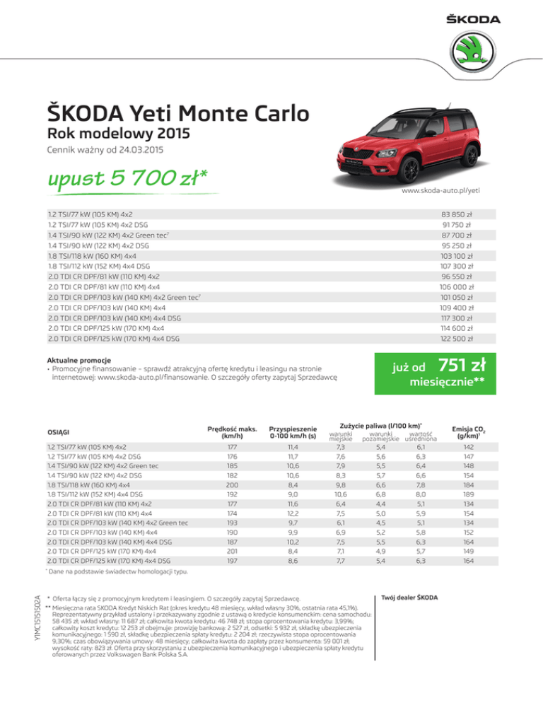 ŠKODA Yeti Monte Carlo Rok modelowy 2015 Cennik ważny od 24.03.2015 upust 5 700 zł* www.skoda-auto.pl/yeti 1.2 TSI/77 kW (105 KM) 4x2 83 850 zł 1.2 TSI/77 kW (105 KM) 4x2 DSG 91 750 zł 1.4 TSI/90 kW (122 KM) 4x2 Green tec7 87 700 zł 1.4 TSI/90 kW (122 KM) 4x2 DSG 95 250 zł 1.8 TSI/118 kW (160 KM) 4x4 103 100 zł 1.8 TSI/112 kW (152 KM) 4x4 DSG 107 300 zł 2.0 TDI CR DPF/81 kW (110 KM) 4x2 96 550 zł 2.0 TDI CR DPF/81 kW (110 KM) 4x4 106 000 zł 2.0 TDI CR DPF/103 kW (140 KM) 4x2 Green tec7 101 050 zł 2.0 TDI CR DPF/103 kW (140 KM) 4x4 109 400 zł 2.0 TDI CR DPF/103 kW (140 KM) 4x4 DSG 117 300 zł 2.0 TDI CR DPF/125 kW (170 KM) 4x4 114 600 zł 2.0 TDI CR DPF/125 kW (170 KM) 4x4 DSG 122 500 zł 751 zł Aktualne promocje • Promocyjne finansowanie – sprawdź atrakcyjną ofertę kredytu i leasingu na stronie internetowej: www.skoda-auto.pl/finansowanie. O szczegóły oferty zapytaj Sprzedawcę OSIĄGI Prędkość maks. (km/h) Przyspieszenie 0-100 km/h (s) już od miesięcznie** Zużycie paliwa (l/100 km)* warunki miejskie warunki wartość pozamiejskie uśredniona 1.2 TSI/77 kW (105 KM) 4x2 177 11,4 7,3 5,4 6,1 1.2 TSI/77 kW (105 KM) 4x2 DSG 176 11,7 7,6 5,6 6,3 147 1.4 TSI/90 kW (122 KM) 4x2 Green tec 185 10,6 7,9 5,5 6,4 148 142 1.4 TSI/90 kW (122 KM) 4x2 DSG 182 10,6 8,3 5,7 6,6 154 1.8 TSI/118 kW (160 KM) 4x4 200 8,4 9,8 6,6 7,8 184 1.8 TSI/112 kW (152 KM) 4x4 DSG 192 9,0 10,6 6,8 8,0 189 2.0 TDI CR DPF/81 kW (110 KM) 4x2 177 11,6 6,4 4,4 5,1 134 2.0 TDI CR DPF/81 kW (110 KM) 4x4 174 12,2 7,5 5,0 5,9 154 2.0 TDI CR DPF/103 kW (140 KM) 4x2 Green tec 193 9,7 6,1 4,5 5,1 134 2.0 TDI CR DPF/103 kW (140 KM) 4x4 190 9,9 6,9 5,2 5,8 152 2.0 TDI CR DPF/103 kW (140 KM) 4x4 DSG 187 10,2 7,5 5,5 6,3 164 2.0 TDI CR DPF/125 kW (170 KM) 4x4 201 8,4 7,1 4,9 5,7 149 2.0 TDI CR DPF/125 kW (170 KM) 4x4 DSG 197 8,6 7,7 5,4 6,3 164 Dane na podstawie świadectw homologacji typu. * Y1MC15151502A Emisja CO2 (g/km)1 * Oferta łączy się z promocyjnym kredytem i leasingiem. O szczegóły zapytaj Sprzedawcę. ** Miesięczna rata SKODA Kredyt Niskich Rat (okres kredytu 48 miesięcy, wkład własny 30%, ostatnia rata 45,1%). Reprezentatywny przykład ustalony i przekazywany zgodnie z ustawą o kredycie konsumenckim: cena samochodu: 58 435 zł; wkład własny: 11 687 zł; całkowita kwota kredytu: 46 748 zł; stopa oprocentowania kredytu: 3,99%; całkowity koszt kredytu: 12 253 zł obejmuje: prowizję bankową: 2 527 zł, odsetki: 5 932 zł, składkę ubezpieczenia komunikacyjnego: 1 590 zł, składkę ubezpieczenia spłaty kredytu: 2 204 zł; rzeczywista stopa oprocentowania 9,30%; czas obowiązywania umowy: 48 miesięcy; całkowita kwota do zapłaty przez konsumenta: 59 001 zł; wysokość raty: 823 zł. Oferta przy skorzystaniu z ubezpieczenia komunikacyjnego i ubezpieczenia spłaty kredytu oferowanych przez Volkswagen Bank Polska S.A. Twój dealer ŠKODA ŠKODA Yeti Monte Carlo WYBRANE ELEMENTY WYPOSAŻENIA STANDARDOWEGO PODRÓŻUJ BEZPIECZNIE • Poduszka powietrzna dla kierowcy i pasażera • Boczne poduszki powietrzne z przodu • Kurtyny powietrzne • Poduszka chroniąca kolana kierowcy • ESP (z ABS, EBV, MSR, ASR, EDS, HBA, DSR) • TPM – funkcja kontroli ciśnienia w oponach PO PIERWSZE FUNKCJONALNOŚĆ • Przednie światła przeciwmgłowe z elementami w kolorze czarnym • Elektromechaniczne wspomaganie kierownicy • Halogenowe reflektory przednie z elementami w kolorze czarnym • Tylne światła w technologii LED • Światła do jazdy dziennej • Wyświetlacz Maxi DOT z komputerem pokładowym • Konsola środkowa z podłokietnikiem Jumbo Box • Schowek na okulary • Uchwyt na kwity parkingowe • VarioFlex z funkcją stolika • Latarka w bagażniku • Zestaw siatek • Relingi dachowe – czarne PODRÓŻUJ KOMFORTOWO • Zdalnie sterowany centralny zamek (2 składane kluczyki) • Czujnik parkowania z tyłu • Trójramienna skórzana sportowa kierownica wielofunkcyjna z przeszyciami w kolorze czerwonym (pakiet skórzany, obsługa: radio, GSM) • Climatronic - dwustrefowa, automatyczna klimatyzacja • Sportowe fotele kierowcy i pasażera z przodu regulowane na wysokość • Elektrycznie sterowane szyby z przodu i z tyłu • Elektrycznie sterowane, podgrzewane, składane lusterka boczne z oświetleniem wokół drzwi AUDIO I KOMUNIKACJA • Radioodtwarzacz BOLERO (Bluetooth, USB, MP3) • Gniazdo AUX IN • Dodatkowe 4 głośniki z tyłu STYLISTYKA • SUNSET – tylne szyby o wyższym stopniu przyciemnienia • Obręcze kół ze stopu metali lekkich ORIGAMI 7J x 17” w kolorze czarnym • Zestaw naprawczy do kół • Dach, relingi, osłony lusterek zewnętrznych, spojler na zderzaku z przodu, dyfuzor z tyłu, ramka grilla oraz progi drzwi w kolorze czarnym • Klamki drzwi w kolorze nadwozia • Zderzaki w kolorze nadwozia • Listwy boczne w kolorze nadwozia • Oznaczenie Monte Carlo na błotnikach z przodu • Ochronne listwy na progi drzwi z oznaczeniem Monte Carlo • Ozdobna końcówka układu wydechowego • Tapicerka SPORT (kierownica, mieszek gałki zmiany biegów oraz dźwignia hamulca ręcznego z przeszyciami w kolorze czerwonym) • Deska rozdzielcza w kolorze czarnym z dekorem na wzór karbonu • Dywaniki z przeszyciami w kolorze czerwonym • Stalowe nakładki na pedały WYBRANE ELEMENTY WYPOSAŻENIA OPCJONALNEGO PODRÓŻUJ BEZPIECZNIE • Boczne poduszki powietrzne z tyłu z kurtynami powietrznymi . . 1 300 • Uchwyty ISOFIX na fotelu pasażera z przodu. . . . . . . . . . . . . . . . . . 150 • Offroad – tryb wspomagania jazdy w trudnym terenie (tylko dla 4x4). . . . . . . . . . . . . . . . . . . . . . . . . . . . . . . . . . . . . . . . . . . . . . . . 350 • HHC – funkcja wspomagania ruszania pod wzniesienia dla systemu ESP1. . . . . . . . . . . . . . . . . . . . . . . . . . . . . . . . . . . . . . . . . . . . . . . .600 • Alarm z funkcją monitoringu wnętrza i czujnikiem przechyłu + niezależna syrena. . . . . . . . . . . . . . . . . . . . . 