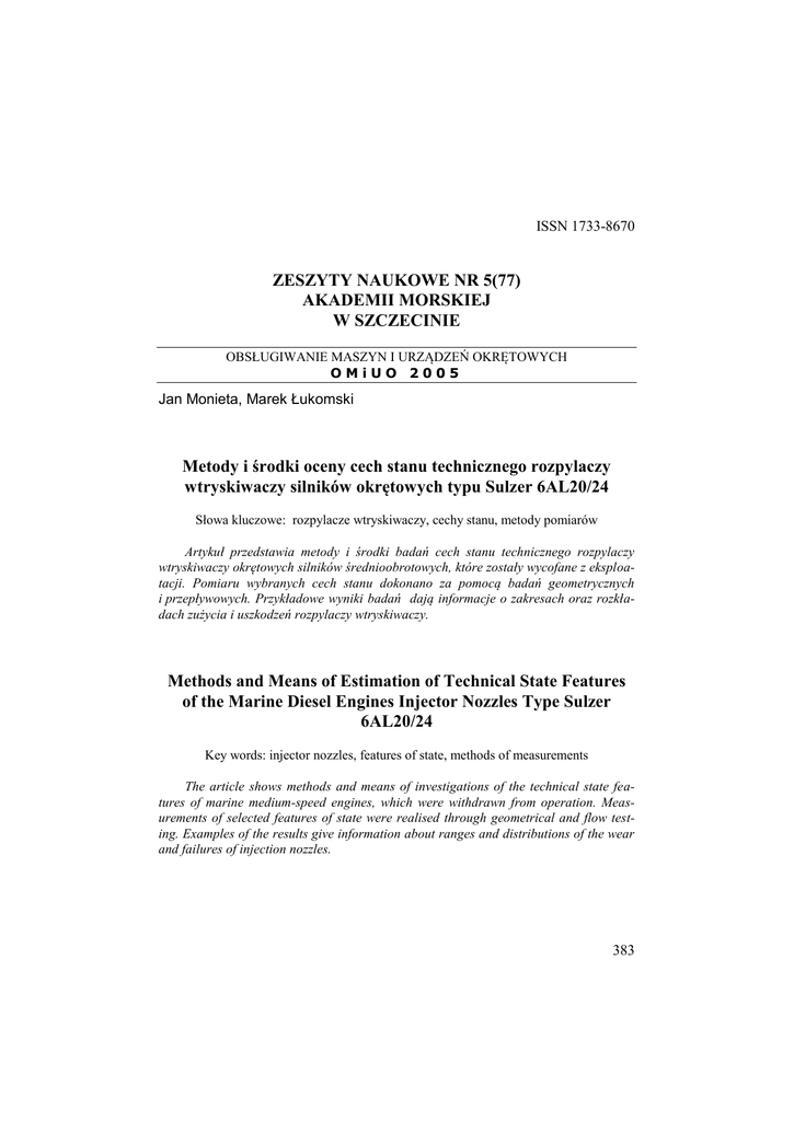 ISSN 1733-8670 ZESZYTY NAUKOWE NR 5(77) AKADEMII MORSKIEJ W SZCZECINIE OBSŁUGIWANIE MASZYN I URZĄDZEŃ OKRĘTOWYCH OMiUO 2005 Jan Monieta, Marek Łukomski Metody i środki oceny cech stanu technicznego rozpylaczy wtryskiwaczy silników okrętowych typu Sulzer 6AL20/24 Słowa kluczowe: rozpylacze wtryskiwaczy, cechy stanu, metody pomiarów Artykuł przedstawia metody i środki badań cech stanu technicznego rozpylaczy wtryskiwaczy okrętowych silników średnioobrotowych, które zostały wycofane z eksploatacji. Pomiaru wybranych cech stanu dokonano za pomocą badań geometrycznych i przepływowych. Przykładowe wyniki badań dają informacje o zakresach oraz rozkładach zużycia i uszkodzeń rozpylaczy wtryskiwaczy. Methods and Means of Estimation of Technical State Features of the Marine Diesel Engines Injector Nozzles Type Sulzer 6AL20/24 Key words: injector nozzles, features of state, methods of measurements The article shows methods and means of investigations of the technical state features of marine medium-speed engines, which were withdrawn from operation. Measurements of selected features of state were realised through geometrical and flow testing. Examples of the results give information about ranges and distributions of the wear and failures of injection nozzles. 383 Jan Monieta, Marek Łukomski Wstęp Rozpylacze wtryskiwaczy spalinowych silników wysokoprężnych posiadają wiele parametrów konstrukcyjnych, które powinny w czasie produkcji zawierać się w określonych granicach dla zapewnienia stanu zdatności. W wyniku eksploatacji rozpylaczy, przy oddziaływaniu różnych czynników wymuszających, roboczych i zewnętrznych, dochodzi do intensywnego zużycia i uszkodzeń, zmian tych parametrów oraz przejścia ze stanu zdatności do stanu dopuszczalnego lub stanu niezdatności [3, 8, 7]. Niektóre z tych parametrów zmieniają się intensywnie, inne mniej intensywnie, jednak rozpylacz znajduje się w stanie zdatności, gdy wszystkie parametry konstrukcyjne znajdują się w przedziałach stanu zdatności, co jest trudne do spełnienia przy wąskich przedziałach stanu zdatności niektórych cech [5]. Pomiary różnych cech stanu technicznego w czasie wytwarzania w specjalistycznych zakładach produkcyjnych, ze względu na trudności pomiarowe i czasochłonność, są realizowane tylko częściowo [9]. W czasie eksploatacji, przy wykonywaniu czynności obsługowych, ze względu na skromne środki użytkowników, ograniczają się oni raczej do kontroli oceny funkcjonowania [4]. Trochę lepiej wyposażone w metody i środki są zakłady odnawiające aparaturę wtryskową. Sytuacje takie mogą prowadzić do powstawania błędów zakwalifikowania rozpylaczy niezdatnych jako zdatne lub zdatnych jako niezdatne [7, 8, 9]. Uznano, więc za celowe wykonanie pomiaru wycofanych z eksploatacji rozpylaczy wtryskiwaczy i ocenę trafności podjętych decyzji eksploatacyjnych. 1. Istotne cechy stanu technicznego rozpylacza wtryskiwaczy Cechy konstrukcyjne rozpylacza w różnym stopniu wpływają na proces wtrysku paliwa. Do najważniejszych z nich należą (rys. 1) [1, 3, 7]: – – – – liczba, przekroje i stan powierzchni otworów doprowadzających paliwo; kształty i wymiary stożków korpusu i iglicy; maksymalny skok iglicy; kształty, liczba i średnice otworków rozpylających, ich rozmieszczenie i nachylenie; – wymiary studzienki rozpylacza; – luz w części korpusu rozpylacza prowadzącej iglicę. Ogólnie czynniki wpływające na niezawodne działanie rozpylaczy można podzielić na: konstrukcyjne, technologiczne, produkcyjne i eksploatacyjne [3, 6]. 384 Metody i środki oceny cech stanu technicznego rozpylaczy wtryskiwaczy silników okrętowych... 2. Obiekty badań hmax Badaniom poddano rozpylacze 9 × 0,25 R i 9 × 0,23 R układów wtryskowych okrętowych silników typu 6AL20/24 napędu prądnic, eksploatowane w rzeczywistych warunkach. Były to rozpylacze dziewięciootworkowe o średnicy nominalnej otworka 0,25 i 0,23 mm z elektroerozyjnym zaokrągleniem krawędzi otworków. Wymienione rozpylacze zostały wyłączone z eksploatacji po stwierdzeniu niewłaściwego ich działania lub wymieniano je profilaktycznie, a w czasie weryfikacji odrzucono. Przekrój rozpylacza silnika okrętowego typu AL20/24 z zaznaczonymi, istotnymi cechami konstrukcyjnymi przedstawiono na rysunku 1. Dk di dr ds g,i o Rys. 1. Przekrój rozpylacza silnika okrętowego typu AL20/24: di – średnica części prowadzącej iglicy, Dk – średnica części korpusu rozpylacza prowadzącej iglicę, dr – średnica otworka rozpylającego, ds – średnica studzienki, hmax – maksymalny skok iglicy, g – kąt stożka gniazda uszczelniającego w korpusie rozpylacza, i – kąt wierzchołkowy stożka iglicy, o – kąt rozmieszczenia otworków rozpylających Fig. 1. Cross-section of injector nozzle of marine diesel engine type 6AL20/24 Kadłuby rozpylaczy są wykonane ze stali WCLVŻ, ulepszane cieplnie do twardości 37 42 HRC oraz azotowane. Iglice wykonane są ze stali szybkotnącej SW7M o twardości 62 64 HRC. Rozpylacze te były produkowane przez różnych dostawców na licencji firmy Sulzer oraz eksploatowane na statkach o nieograniczonym zakresie pływania [8]. Przeznaczone były do wtrysku oleju napędowego pochodzącego od różnych dostawców w zależności od rejonu pływania. 385 Jan Monieta, Marek Łukomski 3. Metoda pomiaru cech makro- i mikrogeometrycznych rozpylaczy 3.1. Pomiary geometryczne Wśród pomiarów geometrycznych rozpylaczy wykonano pomiary: średnic części prowadzących iglicy, średnic części korpusu prowadzących iglicę, maksymalnego skoku iglicy i kąta wierzchołkowego stożków iglicy. Przed wykonaniem pomiarów rozpylacze umyto w benzynie ekstrakcyjnej i osuszono. Z rozpylaczy nie usuwano nierozpuszczalnych w benzynie osadów, powodujących zmiany wartości cech stanu technicznego. Do pomiarów średnic iglic zastosowany był mikrometr cyfrowy, umożliwiający od