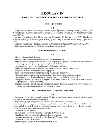 REGULAMIN KOŁA NAUKOWEGO TECHNOLOGÓW śYWNOŚCI I. Koło i jego siedziba §1 1. Stałą siedzibą Koła Naukowego Technologów śywności, zwanego dalej „Kołem”, jest Wydział Nauk o śywności Szkoły Głównej Gospodarstwa Wiejskiego w Warszawie zwanej dalej SGGW. 2. Nadzór nad działalnością Koła sprawuje Prorektor d/s Dydaktyki SGGW. Opiekę na Wydziale sprawuje pracownik powoływany przez Radę Wydziału, zwany dalej „opiekunem Koła”. 3. Organem koordynacji działalności Koła jest Uczelniana Rada Kół Naukowych SGGW. 4. Koło zrzesza studentów SGGW na zasadzie dobrowolności. II. Zadania i formy pracy Koła §2 1. Głównymi zadaniami Koła są: a) rozwijanie zainteresowań naukowych wśród studentów, b) prowadzenie programowych prac naukowych pod opieką i kierunkiem pracowników nauki, przy ścisłej współpracy z instytutami i katedrami, c) działanie na rzecz pogłębienia wiedzy fachowej studentów, d) konfrontowanie wiedzy teoretycznej zdobywanej w Uczelni z praktyką. 2. PowyŜsze zadania Koła realizowane są poprzez: a) podejmowanie indywidualnych i grupowych prac naukowych, b) współpracę z branŜowymi organizacjami, instytucjami i stowarzyszeniami, c) współpracę z kołami naukowymi Uczelni macierzystej i innych uczelni, d) organizowanie publicznych odczytów - zarówno członków Koła jak i zaproszonych specjalistów z danej dziedziny, e) organizowanie innych imprez popularyzujących dorobek naukowy i przyczyniających się do aktywizowania działalności naukowej Koła. III. Członkowie Koła - ich prawa i obowiązki §3 1. Członkiem Koła moŜe zostać student SGGW wykazujący zainteresowanie działalnością naukową w zakresie technologii Ŝywności. 2. Proponowany tryb przyjmowania członka przedstawiono w załączniku 1. 3. Członkowstwo wygasa z dniem ukończenia czy teŜ zaprzestania studiów lub nieusprawiedliwionej absencji w pełnieniu obowiązków członka Koła przez okres 3 miesięcy z wyłączeniem przerw międzysemestralnych. 4. Członek Koła ma prawo: a) wybierać i być wybieranym do wszystkich Władz Koła, b) zabierać głos na zebraniach Koła, zgłaszać wnioski, c) ustosunkować się krytycznie do działalności Zarządu i Koła. 5. Członek Koła ma obowiązek: a) brać czynny udział w pracy programowej Koła, b) uczęszczać na zebranie Koła i imprezy przez nie organizowane, c) opłacać regularnie składki Koła, o ile Walne Zebranie je ustanowi, d) znać Regulamin i stosować się do jego postanowień oraz do postanowień Władz Koła. §4 1. Walne Zebranie Koła moŜe nadać godność członka honorowego osobom szczególnie zasłuŜonym w pracy Koła oraz osobom, które w znacznym stopniu przyczyniły się do jego rozwoju. 2. Członek honorowy korzysta z uprawnień, jakie daje członkostwo Koła Naukowego, jak równieŜ ma prawo doradztwa w posiedzeniach wszelkich Władz Koła. IV. Władze Koła §5 1. NajwyŜszą władzą Koła jest Walne Zebranie zwoływane co najmniej raz w roku. 2. Walne Zebranie: a) przyjmuje sprawozdanie ustępującego Zarządu, b) określa kierunki działalności Koła, c) wybiera nowy Zarząd, d) nadaje godność członka honorowego, e) uchwala Regulamin Koła i zmiany do Regulaminu. 3. Termin i porządek dzienny Walnego Zebrania powinien ogłosić Zarząd przynajmniej na tydzień przed datą zebrania. O terminie, miejscu i porządku Walnego zebrania, Zarząd Koła zobowiązany jest powiadomić opiekuna Koła. 4. Nadzwyczajne Walne Zebranie moŜe być zwołane przez Zarząd na wniosek: a) Senatu, Prorektora d/s Dydaktyki, Uczelnianej Rady Kół Naukowych, Pełnomocnika Rektora d/s Kół Naukowych, Rady Wydziału, Dziekana, b) co najmniej 1/3 liczby członków Koła, c) z własnej inicjatywy Zarządu lub opiekuna Koła. 5. Nadzwyczajne Walne Zebranie rozstrzyga tylko sprawy, dla których zostało zwołane. §6 1. Zarząd Koła wybierany jest w składzie: a) prezes, b) sekretarz, c) skarbnik, d) członkowie Zarządu w składzie ustalonym przez Walne Zebranie. 2. Kadencja Zarządu trwa 1 rok; rozpoczyna się w dniu, w którym został on wybrany. 3. Wybory Zarządu odbywają się na Walnym Zebraniu Koła w głosowaniu jawnym lub tajnym, jeŜeli zaŜąda tego co najmniej jeden członek Koła. Tryb wyborów określa Walne Zebranie Koła. 4. Zarząd Koła moŜe zawierać umowy z róŜnymi instytucjami na wykonanie określonych prac naukowo-badawczych. 5. Zadaniami Zarządu Koła są: a) kierowanie pracą Koła, b) reprezentowanie Koła wobec władz, urzędów i instytucji, c) opracowywanie planu pracy Koła, d) podejmowanie decyzji w sprawach wynikłych z działalności Koła w okresie między zebraniami członków, e) składanie sprawozdania z działalności Koła Walnemu Zebraniu, f) bieŜące informowanie o swojej działalności członków Koła. §7 1. Walne Zebranie Koła Naukowego moŜe powołać Komisję Rewizyjną. Skład, tryb wyborów i zadania Komisji Rewizyjnej określa Walne Zebranie. §8 1. Spory między członkami Koła wynikające z pracy Koła oraz spory między Zarządem a członkami Koła rozstrzyga Walne Zebranie po konsultacji z opiekunem Koła. §9 1. Wszelkie postanowienia Walnego Zebrania podejmowane są zwykłą większością głosów przy obecności co najmniej 50% uprawnionych do głosowania. 2. Zasada ustępu 1 nie dotyczy wyborów do Władz Koła. 3. Uchwalanie Regulaminu Koła oraz zmian w Regulaminie następuje większością głosów 50% + 1 głos. V. Fundusze Koła § 10 1. Fundusze Koła mogą pochodzić z dotacji, składek i innych źródeł. 2. Formy gromadzenia funduszy ustala Walne Zebranie Koła. 3. Za gospodarkę finansową Koła odpowiedzialni są: skarbnik, prezes i opiekun Koła. 4. KaŜde podjęcie funduszy wymaga zatwierdzenia przez skarbnika Koła oraz akceptacji opiekuna Koła. VI. Obieg informacji § 11 1. Proponowany schemat obiegu informacji wraz z wyszczególnieniem stopnia decyzyjności poszczególnych szczebli przedstawiono w załączniku 2.
