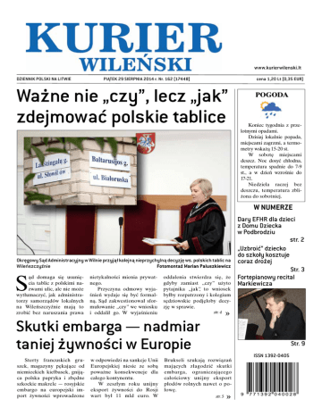 www.kurierwilenski.lt DZIENNIK POLSKI NA LITWIE PIĄTEK 29 SIERPNIA 2014 r. Nr. 162 (17448) cena 1,20 Lt (0,35 EUR) Ważne nie „czy”, lecz „jak” zdejmować polskie tablice POGODA Koniec tygodnia z przelotnymi opadami. Dzisiaj lokalnie popada, miejscami zagrzmi, a termometry wskażą 15-20 st. W sobotę miejscami deszcz. Noc dosyć chłodna, temperatura spadnie do 7-9 st., a w dzień wzrośnie do 17-21. Niedziela raczej bez deszczu, temperatura zbliżona do sobotniej. W NUMERZE Okręgowy Sąd Administracyjny w Wilnie przyjął kolejną nieprzychylną decyzję ws. polskich tablic na Wileńszczyźnie Fotomontaż Marian Paluszkiewicz S ąd domaga się usunięcia tablic z polskimi nazwami ulic, ale nie może wytłumaczyć, jak administratorzy samorządów lokalnych na Wileńszczyźnie mają to zrobić bez naruszania prawa nietykalności mienia prywatnego. Przyczyna odmowy wyjaśnień wydaje się być formalną. Sąd zakwestionował sformułowanie „czy” we wniosku i oddalił go. W wyjaśnieniu oddalenia stwierdza się, że gdyby zamiast „czy” użyto pytajnika „jak”, to wniosek byłby rozpatrzony i kolegium sędziowskie podjęłoby decyzję w sprawie. str. 4 Skutki embarga — nadmiar taniej żywności w Europie Sterty francuskich gruszek, magazyny pękające od niemieckich kiełbasek, gnijąca polska papryka i zbędne szkockie makrele — rosyjskie embargo na europejski import żywności wprowadzone w odpowiedzi na sankcje Unii Europejskiej niesie ze sobą poważne konsekwencje dla całego kontynentu. W zeszłym roku unijny eksport żywności do Rosji wart był 11 mld euro. W Dary EFHR dla dzieci z Domu Dziecka w Podbrodziu str. 2 „Uzbroić” dziecko do szkoły kosztuje coraz drożej Str. 3 Fortepianowy recital Markiewicza » Str. 9 Brukseli szukają rozwiązań mających złagodzić skutki embarga, ograniczającego całościowy unijny eksport płodów rolnych nawet o połowę. str. 5 » ISSN 1392-0405 2 WYDARZENIA KURIER WILEŃSKI • Piątek, 29 sierpnia 2014 r. Dary EFHR dla dzieci z Domu Dziecka w Podbrodziu Piątek Sierpień 2014 29 W Imieniny: Beatrycze, Flory, Hipacego, Jana, Krescencjusza, Krescensa, Krescentego, Mederyka, Michała, Racibora, Sabiny i Świętosława TRZY PYTANIA DO... ...Živilė Matulionienė, kinezyterapeuty prywatnej przychodni w Wilnie Już za kilka dni rozpocznie się nowy rok szkolny. Rodzicom warto więc zająć się prawidłowym urządzeniem miejsca pracy dziecka, aby nie garbiło się. Na co należy zwrócić uwagę? Podstawą dobrego i wygodnego miejsca pracy dla dzieci są odpowiednie meble. Dobrze, jeżeli ich wysokość można regulować i dostosowywać w ten sposób do rosnącego dziecięcego organizmu. Stół należy uruchomić w taki sposób, aby podczas pracy ręce nie były zbyt nisko albo wysoko — nadgarstki i łokcie mają być w neutralnym położeniu. 1. 2. Jak dobrać odpowiednie krzesło biurkowe? Nasze mięśnie pracują nawet podczas siedzenia. Siedząc w nieprawidłowej pozycji zwiększa się napięcie, a to może doprowadzić do bólów i schorzeń kręgosłupa czy mięśni. Wysokość krzesła więc powinna być uregulowana tak, aby nogi były schylone pod kątem 90 stopni, a stopy przylegały do podłogi. Krzesło powinno mieć podłokietniki i miękkie oparcie, które ma całkowicie przylegać do pleców. Oparcie krzesła nie musi być ani zbyt wysokie, ani zbyt niskie — najlepiej, jeżeli kończy się tam, gdzie się zaczyna szyja siedzącego. Także radzę wybierać krzesła wyposażone w samohamowane kółka — są najbardziej bezpieczne. 3. Jakie ma być oświetlanie miejsca pracy? Podstawowy strumień światła powinien padać z lewej strony, jeżeli dziecko jest praworęczne. Z prawej — jeżeli dziecko leworęczne. Podczas czytania odległość od książki czy zeszytu powinna wynosić 35-40 cm. Natomiast odległość oczu do monitora komputera ma być około 70 cm, a do klawiatury — 30-40 cm. Oświecenie powinno być dobre, ale niezbyt jaskrawe, aby nie nadwyrężyć oczu. Rozmawiała Brygita Łapszewicz KURIER WILEŃSKI Ukazuje się od 1 lipca 1953 roku Birbynių g. 4a, 02121-30 Vilnius, Lietuvos Respublika, tel./fax 260 84 44 DZIENNIK NALEŻY DO EUROPEJSKIEGO STOWARZYSZENIA GAZET CODZIENNYCH MNIEJSZOŚCI NARODOWYCH końcu lipca br. do dzieci z Domu Dziecka w Podbrodziu dotarły kolejne już dary przekazane przez Europejską Fundację Praw Człowieka (EFHR). Więcej o dotychczasowych wyjazdach można znaleźć na stronie internetowej Fundacji (www.efhr.eu). W czasie lipcowej wizyty przedstawiciele Fundacji wręczyli wychowankom m. in. kredki, mazaki, bloki rysunkowe, książeczki, zabawki oraz puzzle, zakupione ze środków przekazanych EFHR przez prywatnych darczyńców. Przeprowadzając takie inicjatywy Fundacja stara się umilić dzieciom czas i wywołać u nich jeszcze większą radość i szerszy uśmiech. Pozostajemy więc w stałym kontakcie z domami dziecka na Litwie, starając się na bieżąco reagować na pojawiające się potrzeby. W ten sposób narodziła się również inicjatywa EFHR — wolontariat w domach dziecka na Litwie, w ramach którego wolontariusze pomagają wychowawcom w organizowaniu zajęć dla dzieci. Tym samym w domu dziecka w Podbrodziu gościło już kilka wolontariuszek, których wrażenia wkrótce przedstawimy. EFHR wierzy, że każdy gest w stronę dzieci będzie przez nie i społeczeństwo doceniony. Dlatego też zapraszamy osoby, pragnące dołączyć się do akcji i wesprzeć domy dziecka, do nawiązania współpracy z EFHR. Inf. EFHR Jeszcze 400 milionów na wojsko litewskie W następnym roku budżet litewskiego wojska ma wzrosnąć o dodatkowe 400 mln litów, obiecał minister ochrony kraju Juozas Olekas. „Uzgodniliśmy z sejmową większością, rządem i prezydent, że sukcesywnie będziemy zwiększali finansowanie. Naszym celem jest, aby w 2020 r. osiągnąć finansowanie w wysokości 2 proc. PKB. Żeby to zrealizować, potrzebujemy każdego roku zwiększ