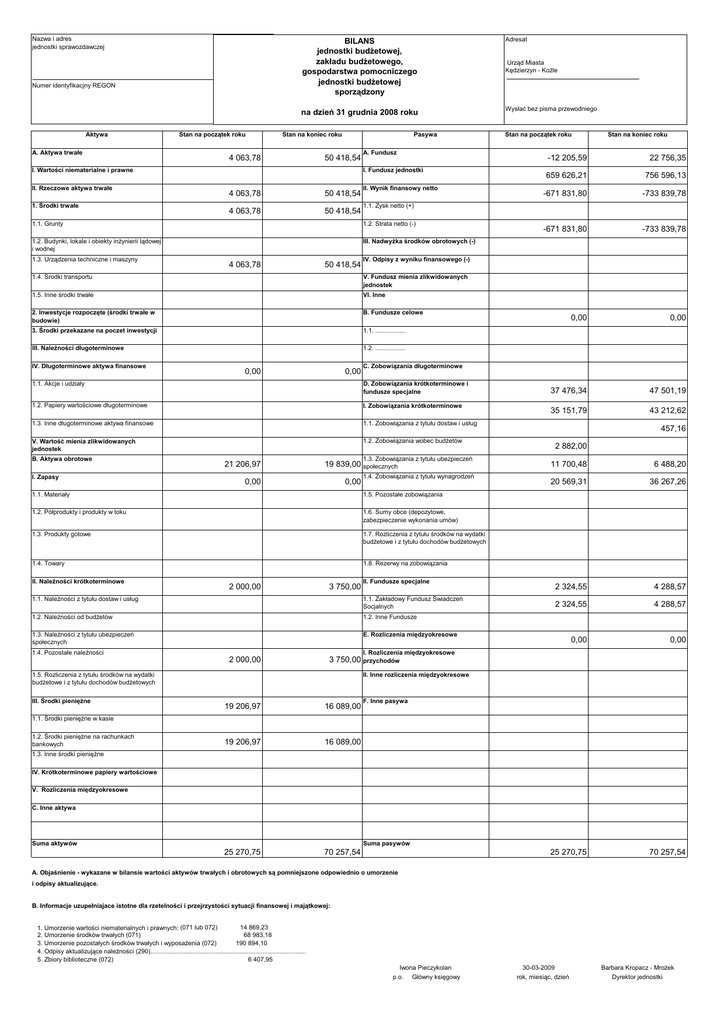 Nazwa i adres jednostki sprawozdawczej BILANS jednostki budŜetowej, zakładu budŜetowego, gospodarstwa pomocniczego jednostki budŜetowej sporządzony Numer identyfikacjny REGON na dzień 31 grudnia 2008 roku Aktywa A. Aktywa trwałe Stan na początek roku Stan na koniec roku 4 063,78 Pasywa 50 418,54 I. Wartości niematerialne i prawne II. Rzeczowe aktywa trwałe 1. Środki trwałe A. Fundusz I. Fundusz jednostki 4 063,78 50 418,54 4 063,78 50 418,54 II. Wynik finansowy netto 1.2. Strata netto (-) 1.2. Budynki, lokale i obiekty inŜynierii lądowej i wodnej III. NadwyŜka środków obrotowych (-) 4 063,78 50 418,54 V. Fundusz mienia zlikwidowanych jednostek 1.5. Inne środki trwałe VI. Inne 2. Inwestycje rozpoczęte (środki trwałe w budowie) B. Fundusze celowe 3. Środki przekazane na poczet inwestycji 1.1. ................. III. NaleŜności długoterminowe 1.2. ................. 0,00 0,00 D. Zobowiązania krótkoterminowe i fundusze specjalne 1.2. Papiery wartościowe długoterminowe I. Zobowiązania krótkoterminowe 1.3. Inne długoterminowe aktywa finansowe 1.1. Zobowiązania z tytułu dostaw i usług V. Wartość mienia zlikwidowanych jednostek 1.2. Zobowiązania wobec budŜetów B. Aktywa obrotowe 1.3. Zobowiązania z tytułu ubezpieczeń społecznych 21 206,97 19 839,00 0,00 0,00 1.4. Zobowiązania z tytułu wynagrodzeń 1.1. Materiały 1.5. Pozostałe zobowiązania 1.2. Półprodukty i produkty w toku 1.6. Sumy obce (depozytowe, zabezpieczenie wykonania umów) 1.3. Produkty gotowe 1.7. Rozliczenia z tytułu środków na wydatki budŜetowe i z tytułu dochodów budŜetowych 1.4. Towary 1.8. Rezerwy na zobowiązania II. NaleŜności krótkoterminowe 2 000,00 3 750,00 II. Fundusze specjalne 1.1. NaleŜności z tytułu dostaw i usług 1.1. Zakładowy Fundusz Świadczeń Socjalnych 1.2. NaleŜności od budŜetów 1.2. Inne Fundusze 1.3. NaleŜności z tytułu ubezpieczeń społecznych E. Rozliczenia międzyokresowe 1.4. Pozostałe naleŜności I. Rozliczenia międzyokresowe przychodów 2 000,00 3 750,00 1.5. Rozliczenia z tytułu środków na wydatki budŜetowe i z tytułu dochodów budŜetowych III. Środki pienięŜne Stan na początek roku Stan na koniec roku -12 205,59 22 756,35 659 626,21 756 596,13 -671 831,80 -733 839,78 -671 831,80 -733 839,78 0,00 0,00 37 476,34 47 501,19 35 151,79 43 212,62 C. Zobowiązania długoterminowe 1.1. Akcje i udziały I. Zapasy Wysłać bez pisma przewodniego IV. Odpisy z wyniku finansowego (-) 1.4. Środki transportu IV. Długoterminowe aktywa finansowe Urząd Miasta Kędzierzyn - Koźle 1.1. Zysk netto (+) 1.1. Grunty 1.3. Urządzenia techniczne i maszyny Adresat 457,16 2 882,00 11 700,48 6 488,20 20 569,31 36 267,26 2 324,55 4 288,57 2 324,55 4 288,57 0,00 0,00 25 270,75 70 257,54 II. Inne rozliczenia międzyokresowe 19 206,97 16 089,00 19 206,97 16 089,00 25 270,75 70 257,54 F. Inne pasywa 1.1. Środki pienięŜne w kasie 1.2. Środki pienięŜne na rachunkach bankowych 1.3. Inne środki pienięŜne IV. Krótkoterminowe papiery wartościowe V. Rozliczenia międzyokresowe C. Inne aktywa Suma aktywów Suma pasywów A. Objaśnienie - wykazane w bilansie wartości aktywów trwałych i obrotowych są pomniejszone odpowiednio o umorzenie i odpisy aktualizujące. B. Informacje uzupełniajace istotne dla rzetelności i przejrzystości sytuacji finansowej i majątkowej: 14 869,23 1. Umorzenie wartości niematerialnych i prawnych: (071 lub 072) 2. Umorzenie środków trwałych (071) 68 983,18 3. Umorzenie pozostałych środków trwałych i wyposaŜenia (072) 190 894,10 4. Odpisy aktualizujące naleŜności (290)......................................................................................... 5. Zbiory biblioteczne (072) 6 407,95 Iwona Pieczykolan p.o. Główny księgowy 30-03-2009 rok, miesiąc, dzień Barbara Kropacz - MroŜek Dyrektor jednostki