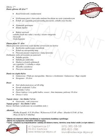 Oferta I * Danie główne 40 zł/os** Rosół królewski z makaronem Grillowana pierś z kurczaka otulona boczkiem na sosie tymiankowym Schab po cygańsku pod pierzynką pieczarek, cebulki oraz boczku Ziemniaki gotowane Kluski śląskie Bukiet surówek -sałatka fresh mix sałat z rucolą z sosem vinegrette -buraczki -biała kapusta Zimna płyta 35 zł/os Mięsa pieczone autorstwa szefa kuchni serwowane na lustrze Karkówka szpikowana czosnkiem Schab na staropolską nutę Puszysty pasztet wieprzowy z nutą żurawiny Delikatesy stołu serwowane na paterach Sałatka grecka Sałatka po żydowsku Sledzie w dwóch odsłonach -po cygańsku / z cebulką w oleju Masełko czosnkowe Pieczywo mieszane Danie na ciepło:8zł/os Gulaszowa / Flaki po staropolsku / Barszcz z krokietem / Gulaszowa / Bigo wiejski Strogonov 10 zł/os Deser Tort okolicznościowy od 40 zł/kg Sernik wiedeński 5 zł/os Szarlotka 5 zł/os Deser lodowy ( trzy gałki lodów, owoce , bita śmietana, polewa) 10 zł/os Owoce 5 zł/os Napoje zimne – bez limitu 5 zł /os Gazowane , soki owocowe Napoje gorące – bez limitu 5 zł/os Kawa i herbata ( podawane na szwedzkim stole ) Alkohole -Wódka Krupnik 0.5l 30 zł/but / Wyborowa 0.5l 40 zł/but / Absolut 0.5l 60 zł/ but -Wino El Sol 0,7l 40zł/but *Oferta nie stanowi oferty handlowej w rozumieniu kodeksu cywilnego Oferta ma wyłącznie charakter informacyjny. **Ceny ustalane są indywidualnie i zależą od doboru menu, terminu oraz ilości osób ( w tym dzieci ) Oferta II * Danie główne 50 zł/os** Żur wiejski Wieżyczki drobiowe nadziewane szpinakiem i serem feta na sosie kremowym Grillowanie polędwiczki wieprzowe podawane na sosie borowikowo- podgrzybkowym Schab po cygańsku pod pierzynką pieczarek, cebulki oraz boczku Ziemniaki gotowane Ziemniaczki pieczone po chłopsku Kluseczki śląskie z masełkiem Bukiet surówek -sałatka fresh mix sałat z rucolą z sosem vinegrette -buraczki -biała kapusta Zimna płyta 45 zł/os Mięsa pieczone autorstwa szefa kuchni serwowane na lustrze Karkówka szpikowana czosnkiem Schab na staropolską nutę Rolada z boczku Puszyty pasztecik wieprzowy z sosem żurawinowym Delikatesy stołu serwowane na paterach Sałatka caparesse z mozarellą, pomidorami i świeżą bazylią Sałatka jarzynowa Sledzie w dwóch odsłonach -po cygańsku / z cebulką w oleju Jaka z musem -z wędzonego łososia -z pieczarkowym Masełko czosnkowe Pieczywo mieszane Danie na ciepło:8zł/os Gulaszowa / Flaki po staropolsku / Barszcz z krokietem / Gulaszowa / Bigo wiejski Strogonov 10 zł/os Deser Tort okolicznościowy od 40 zł/kg Sernik wiedeński 5 zł/os / Szarlotka 5 zł/os Deser lodowy ( trzy gałki lodów, owoce , bita śmietana, polewa) 10 zł/os Owoce 5 zł/os Napoje zimne – bez limitu 5 zł /os Gazowane , soki) Napoje gorące – bez limitu 5 zł/os Kawa i herbata ( podawane na szwedzkim stole ) Alkohole -Wódka Krupnik 0.5l 30 zł/but / Wyborowa 0.5l 40 zł/but / Absolut 0.5l 60 zł/ but -Wino El Sol 0,7l 40zł/but *Oferta nie stanowi oferty handlowej w rozumieniu kodeksu cywilnego Oferta ma wyłącznie charakter informacyjny. **Ceny ustalane są indywidualnie i zależą od doboru menu, terminu oraz ilości osób ( w tym dzieci )