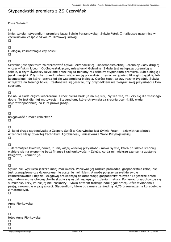 Płońszczak - Gazeta lokalna - Płońsk, Raciąż, Baboszewo, Czerwińsk, Dzierzążnia, Joniec, Naruszewo Stypendystki premiera z ZS Czerwińsk Dwie Sylwie Imię, szkoła i stypendium premiera łączą Sylwię Perzanowską i Sylwię Fotek najlepsze uczennice w czerwińskim Zespole Szkół im. Królowej Jadwigi. Filologia, kosmetologia czy boks? Szerokie jest spektrum zainteresowań Sylwii Perzanowskiej - siedemnastoletniej uczennicy klasy drugiej w czerwińskim Liceum Ogólnokształcącym, mieszkanki Goławina. Sylwia jest najlepszą uczennicą w szkole, o czym świadczy uzyskane przez nią za miniony rok szkolny stypendium premiera. Lubi biologię i język rosyjski. Z tymi też przedmiotami wiąże swoją przyszłość, myśląc wstępnie o filologii rosyjskiej lub kosmetologii, do której przyda jej się wspomniana biologia. Oprócz tego, aż trzy razy w tygodniu Sylwia uczęszcza na treningi boksu i zastanawia się jeszcze, czy przypadkiem nie związać swej przyszłości z tym sportem. Do nauki siada często wieczorami. I choć nieraz brakuje na nią siły, Sylwia wie, że uczy się dla własnego dobra. To jest dla niej motywacją. Stypendium, które otrzymała za średnią ocen 4,85, wyda najprawdopodobniej na kurs prawa jazdy. Księgowość a może rolnictwo? Z kolei drugą stypendystką z Zespołu Szkół w Czerwińsku jest Sylwia Fotek - dziewiętnastoletnia uczennica klasy czwartej Technikum Agrobiznesu, mieszkanka Wólki Przybojewskiej. - Matematyka królową nauką. Z nią wiążę wszelką przyszłość - mówi Sylwia, która po szkole średniej wybiera się na ekonomię bądź finanse i rachunkowość. - Zależy, co da mi większe szanse na zostanie księgową - komentuje. Sylwia nie wyklucza jeszcze innej możliwości. Ponieważ jej rodzice prowadzą gospodarstwo rolne, nie jest przesądzone czy dziewczyna nie zostanie rolnikiem. A może połączy wszystkie swoje zainteresowania i będzie księgową prowadzącą dokumentację gospodarstw rolnych? To jeszcze przed nią, natomiast na obecną chwilę skupia się na jak najlepszym zdaniu matury. Ponieważ przygotowuje się sumiennie, liczy, że nic jej nie zaskoczy. Sylwia bowiem traktuje naukę jak pracę, która wykonana z pasją, zaowocuje w przyszłości. Stypendium, które otrzymała za średnią 4,76 przeznacza na korepetycje z matematyki. Anna Piórkowska foto: Anna Piórkowska http://www.plonszczak.pl Kreator PDF Utworzono 7 March, 2017, 04:32 Płońszczak - Gazeta lokalna - Płońsk, Raciąż, Baboszewo, Czerwińsk, Dzierzążnia, Joniec, Naruszewo Dwie stypendystki z ZS Czerwińsk: Sylwia Perzanowska (z lewej) i Sylwia Fotek. http://www.plonszczak.pl Kreator PDF Utworzono 7 March, 2017, 04:32