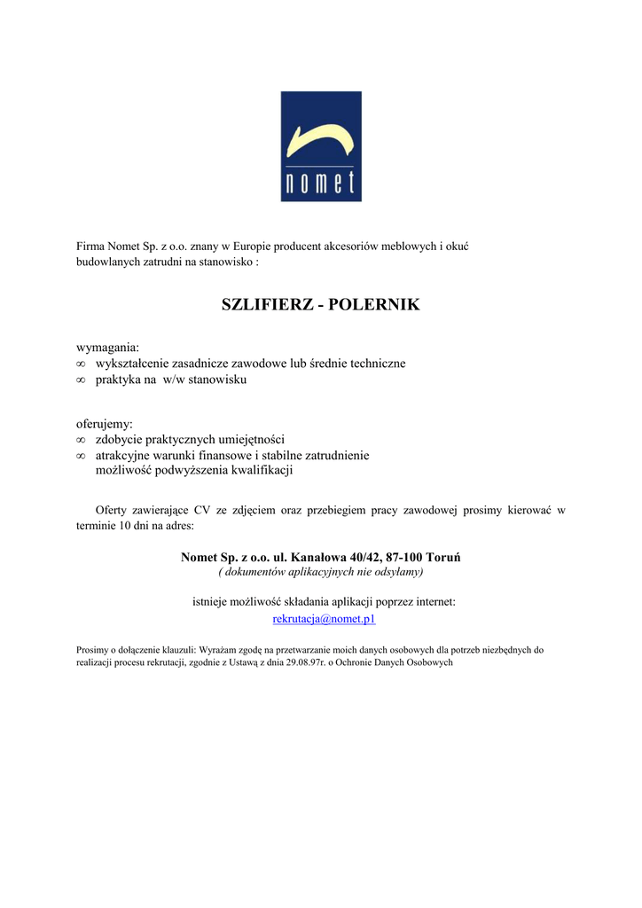 Firma Nomet Sp. z o.o. znany w Europie producent akcesoriów meblowych i okuć budowlanych zatrudni na stanowisko : SZLIFIERZ - POLERNIK wymagania: • wykształcenie zasadnicze zawodowe lub średnie techniczne • praktyka na w/w stanowisku oferujemy: • zdobycie praktycznych umiejętności • atrakcyjne warunki finansowe i stabilne zatrudnienie możliwość podwyższenia kwalifikacji Oferty zawierające CV ze zdjęciem oraz przebiegiem pracy zawodowej prosimy kierować w terminie 10 dni na adres: Nomet Sp. z o.o. ul. Kanałowa 40/42, 87-100 Toruń ( dokumentów aplikacyjnych nie odsyłamy) istnieje możliwość składania aplikacji poprzez internet: [email protected] Prosimy o dołączenie klauzuli: Wyrażam zgodę na przetwarzanie moich danych osobowych dla potrzeb niezbędnych do realizacji procesu rekrutacji, zgodnie z Ustawą z dnia 29.08.97r. o Ochronie Danych Osobowych