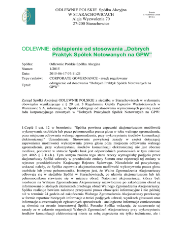 ODLEWNIE POLSKIE Spółka Akcyjna W STARACHOWICACH Aleja Wyzwolenia 70 27-200 Starachowice Środa 17 czerwca 2015 07:11 ODLEWNIE: odstąpienie od stosowania „Dobrych Praktyk Spółek Notowanych na GPW” Spółka: Numer: Data: Typy rynków: Tytuł: Odlewnie Polskie Spółka Akcyjna 1/2015 2015-06-17 07:11:21 CORPORATE GOVERNANCE - rynek regulowany odstąpienie od stosowania "Dobrych Praktyk Spółek Notowanych na GPW” Zarząd Spółki Akcyjnej ODLEWNIE POLSKIE z siedzibą w Starachowicach w wykonaniu obowiązku wynikającego z § 29 ust. 3 Regulaminu Giełdy Papierów Wartościowych w Warszawie S.A. informuje, że Spółka odstępuje od stosowania wymienionych poniżej zasad ładu korporacyjnego zawartych w "Dobrych Praktykach Spółek Notowanych na GPW: 1.Część I ust. 12 w brzmieniu: "Spółka powinna zapewnić akcjonariuszom możliwość wykonywania osobiście lub przez pełnomocnika prawa głosu w toku walnego zgromadzenia, poza miejscem odbywania walnego zgromadzenia, przy wykorzystaniu środków komunikacji elektronicznej." Uzasadnienie: Stosowanie powyższej zasady w części dotyczącej zapewnienia możliwości wykonywania prawa głosu poza miejscem odbywania walnego zgromadzenia, przy wykorzystaniu środków komunikacji elektronicznej nie jest obecnie możliwe, ponieważ w statucie Spółki brak jest odpowiednich postanowień w tym zakresie (art. 4065 § 2 k.s.h.). Tym samym zmiana tego stanu rzeczy wymagałaby podjęcia przez akcjonariuszy Spółki uchwały w przedmiocie zmiany Statutu oraz rejestracji tej zmiany w rejestrze przedsiębiorców Krajowego Rejestru Sądowego. Niezależnie od powyższego, wskazać należy, że Spółka zapewnia akcjonariuszom możliwość wykonywania prawa głosu osobiście lub przez pełnomocnika. Istotnym jest, że Walne Zgromadzenia Akcjonariuszy odbywają się w siedzibie Spółki w Starachowicach, co ułatwia akcjonariuszom lub ich pełnomocnikom stawienie się w miejscu obrad. Natomiast akcjonariusze, którzy byli nieobecni na Walnym Zgromadzeniu Akcjonariuszy niezwłocznie po zakończeniu obrad są informowani o istotnych elementach przebiegu obrad Walnego Zgromadzenia Akcjonariuszy. Spółka realizuje bowiem nałożone przepisami prawa obowiązki informacyjne i nie później niż w terminie 24 godzin od zakończenia Walnego Zgromadzenia Akcjonariuszy przekazuje w formie raportów bieżących informacje o treści podjętych uchwał, wynikach głosowań oraz informacje o ewentualnych zgłoszonych sprzeciwach - analogiczne informacje zamieszczane są również na stronie internetowej Spółki. Ponadto Spółka wskazuje, że stosowanie tej zasady ze w zakresie organizacji Walnych Zgromadzeń Akcjonariuszy przy wykorzystaniu środków komunikacji elektronicznej niesie za sobą zagrożenia nie tylko techniczne, ale i ODLEWNIE POLSKIE Spółka Akcyjna W STARACHOWICACH Aleja Wyzwolenia 70 27-200 Starachowice Środa 17 czerwca 2015 07:11 prawne. Spółka nie wyklucza jednak możliwości stosowania w przyszłości tej zasady, 2.Część II ust. 1 pkt 9a) w brzmieniu: "Spółka prowadzi korporacyjną stronę internetową i zamieszcza na niej, oprócz informacji wymaganych przez przepisy prawa (...) zapis przebiegu obrad walnego zgromadzenia, w formie audio lub wideo". Uzasadnienie: Zasada ta nie będzie przez Spółkę stosowana, albowiem dotychczasowe doświadczenie Spółki nie wskazuje na potrzebę utrwalania przebiegu obrad Walnego Zgromadzenia Akcjonariuszy w formie audio czy wideo. W ocenie Spółki realizacja nałożonych obowiązującymi przepisami prawa obowiązków informacyjnych poprzez przekazywanie raportów bieżących, zawierających treść podjętych uchwał, wyniki głosowań oraz informację o ewentualnych zgłoszonych sprzeciwach, i zamieszczanie na stronie internetowej Spółki tych informacji umożliwia inwestorom zapoznanie się z istotnymi elementami przebiegu obrad Walnego Zgromadzenia Akcjonariuszy. Ponadto, odstąpienie przez Spółkę od realizacji tej zasady zabezpiecza Spółkę przed ewentualnymi roszczeniami akcjonariuszy, którzy mogą nie wyrażać zgody na publikację swojego wizerunku, czy też prezentowanie ich wypowiedzi. Spółka nie wyklucza stosowanie powyższej zasady w przyszłości. 3.Część IV ust. 10 w brzmieniu: "Spółka powinna zapewnić akcjonariuszom możliwość udziału w walnym zgromadzeniu przy wykorzystaniu środków komunikacji elektronicznej, polegającego na: 1) transmisji obrad walnego zgromadzenia w czasie rzeczywistym, 2) dwustronnej komunikacji w czasie rzeczywistym, w ramach której akcjonariusze mogą wypowiadać się w toku obrad walnego zgromadzenia przebywając w miejscu innym niż miejsce obrad." Uzasadnienie: Stosowanie powyższej zasady nie jest obecnie możliwe, ponieważ w statucie Spółki brak jest odpowiednich postanowień w tym zakresie. Z przepisu art. 4065 § 1 k.s.h. wynika, że transmisja obrad walnego zgromadzenia w czasie rzeczywistym oraz dwustronna komunikacja w czasie rzeczywistym, w ramach której akcjonariusze mogą wypowiadać się w toku obrad walnego zgromadzenia, przebywając w miejscu innym niż miejsce obrad walnego zgromadzenia, są możliwe, jeżeli w statucie Spółki znajdują się postanowienia na to zezwalające. Tym samym zmiana obecnego stanu rzeczy wymagałaby podjęcia przez akcjonariuszy Spółki uchwały w przedmiocie zmiany Statutu oraz rejestracji tej zmiany w rejestrze przedsiębiorców Krajowego Rejestru Sądowego. Niezależnie od powyższego, wskazać należy, że Spółka zapewnia akcjonariuszom możliwość uczestniczenia w Walnym Zgromadzeniu Akcjonariuszy osobiście lub przez pełnomocnika. Istotnym jest, że Walne Zgromadzenia Akcjonariuszy odbywają się w siedzibie Spółki w Starachowicach, co ułatwia akcjonariuszom lub ich pełnomocnikom stawienie się w miejscu obrad. Natomiast akcjonariusze, którzy byli nieobecni na Walnym Zgromadzeniu Akcjonariuszy niezwłocznie po zakończeniu obrad są informowani o istotnych elementach