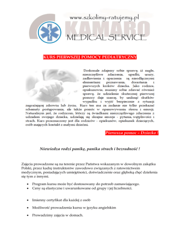 KURS PIERWSZEJ POMOCY PEDIATRYCZNY Pierwsza pomoc – Dziecko ! Niewiedza rodzi panikę, panika strach i bezradność ! Zajęcia prowadzone są na terenie przez Państwa wskazanym w dowolnym zakątku Polski, przez kadrę instruktorów zawodowo związanych z ratownictwem medycznym, posiadających umiejętności, doświadczenie oraz głęboką chęć dzielenia się tym z innymi. Program kursu może być dostosowany do potrzeb zamawiającego. Ceny są elastyczne i uwarunkowane od grupy i jej liczebności. Imienny certyfikat dla każdej z osób Możliwość prowadzenia kursu w języku angielskim Prowadzimy zajęcia w domach. Kurs zgodny z wytycznymi Europejskiej Rady Resuscytacji (ERC). Pierwsza pomoc – Dziecko Kurs Pediatryczny - program Czas trwania: około 6 godzin. (wykłady, dyskusje i ćwiczenia praktyczne i pozoracje) Terminy dostosujemy do Państwa możliwości. Cena kursu – prosimy o kontakt telefoniczny Nasi konsultanci z przyjemnością odpowiedzą na każde pytanie. tel: 605 654 676 fsx: 63 276 43 05 e:mail: [email protected] www.szkolimy-ratujemy.pl z ratowniczym pozdrowieniem Kamaro Medical Service