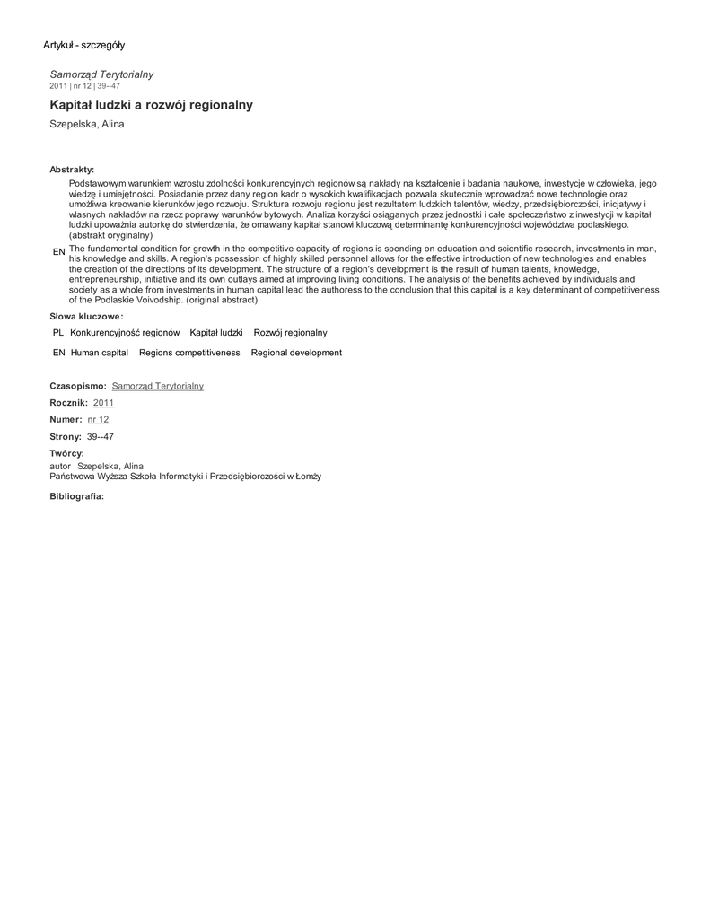 Artykuł - szczegóły Samorząd Terytorialny 2011 | nr 12 | 39--47 Kapitał ludzki a rozwój regionalny Szepelska, Alina Abstrakty: Podstawowym warunkiem wzrostu zdolności konkurencyjnych regionów są nakłady na kształcenie i badania naukowe, inwestycje w człowieka, jego wiedzę i umiejętności. Posiadanie przez dany region kadr o wysokich kwalifikacjach pozwala skutecznie wprowadzać nowe technologie oraz umożliwia kreowanie kierunków jego rozwoju. Struktura rozwoju regionu jest rezultatem ludzkich talentów, wiedzy, przedsiębiorczości, inicjatywy i własnych nakładów na rzecz poprawy warunków bytowych. Analiza korzyści osiąganych przez jednostki i całe społeczeństwo z inwestycji w kapitał ludzki upoważnia autorkę do stwierdzenia, że omawiany kapitał stanowi kluczową determinantę konkurencyjności województwa podlaskiego. (abstrakt oryginalny) EN The fundamental condition for growth in the competitive capacity of regions is spending on education and scientific research, investments in man, his knowledge and skills. A region's possession of highly skilled personnel allows for the effective introduction of new technologies and enables the creation of the directions of its development. The structure of a region's development is the result of human talents, knowledge, entrepreneurship, initiative and its own outlays aimed at improving living conditions. The analysis of the benefits achieved by individuals and society as a whole from investments in human capital lead the authoress to the conclusion that this capital is a key determinant of competitiveness of the Podlaskie Voivodship. (original abstract) Słowa kluczowe: PL Konkurencyjność regionów EN Human capital Kapitał ludzki Regions competitiveness Rozwój regionalny Regional development Czasopismo: Samorząd Terytorialny Rocznik: 2011 Numer: nr 12 Strony: 39--47 Twórcy: autor Szepelska, Alina Państwowa Wyższa Szkoła Informatyki i Przedsiębiorczości w Łomży Bibliografia: Bończak-Kucharczyk E., Herberst K., Chmura K., Jak władze lokalne mogą wspierać przedsiębiorczość, Warszawa 1998, s. 7-8. Chądzyński J., Nowakowska A., Przygodzki Z., Region i jego rozwój w warunkach globalizacji, Warszawa 2007, 43-44. Collect Consulting S.A., Raport z badania ewaluacyjnego pn. Identyfikacja potrzeb w obszarze kształcenia ustawicznego osób dorosłych w formach szkolnych i pozaszkolnych w województwie podlaskim, Katowice 2011, s.20. Dobija D., Pomiar i sprawozdawczość kapitału intelektualnego przedsiębiorstwa, Warszawa 2003, s. 28. Domański S.R., Kapitał ludzki, podział pracy i konkurencyjność, "Gospodarka Narodowa" 2000/7-8, s. 32. Dorozik L., Frajerski S., Globalizacja gospodarki a rozwój regionalny i współpraca transgraniczna (ze szczególnym uwzględnieniem regionu Pomorza Zachodniego), w: J. Brdulak (red.), Problemy rozwoju regionalnego, Warszawa 2001, s. 294-295. Edvinsson L., Malone M.S., Kapitał intelektualny, Warszawa 2001, s. 16. Główny Urząd Statystyczny, Ogólnopolskie badanie wynagrodzeń według zawodów w październiku 2009 г., Warszawa 2010. Główny Urząd Statystyczny, Rocznik statystyczny województw, Warszawa 2010. Horodeński R.Cz., Sadowska-Snarska C. (red.), Poziom i struktura popytu na pracę w świetle badań podlaskich pracodawców, Warszawa 2010, s. 134139. Instytut Badań Strukturalnych, Diagnoza kapitału ludzkiego miasta stołecznego Warszawa, Warszawa 2008, http://strategia.um.warszawa.pl. Jaki A., Kapitał intelektualny jako składnik kapitału przedsiębiorstwa, w: R. Borowiecki (red.), Zarządzanie wiedzą a procesy restrukturyzacji i rozwoju przedsiębiorstw. VII Międzynarodowa Konferencja Naukowa Krynica 2000, Kraków 2000, s. 78. Jarecki W., Koncepcja kapitału ludzkiego, w: D. Kopycińska (red.), Kapitał ludzki, Szczecin 2003, s. 32. Kociszewski J., Krzemień R., Wpływ edukacji na tworzenie kapitału ludzkiego w Polsce w warunkach transformacji gospodarczej, w: M. Dudek (red.), Polityki unijne dwa lata po akcesji. Wybrane problemy, Zielona Góra 2007, s. 8. Kukulak-Dolata I. (red.), Arendt Ł., Profile migracji zarobkowych mieszkańców województwa podlaskiego, Białystok 2009, s. 43. Majowska M., Problemy badania wpływu kapitału ludzkiego na zachowania przedsiębiorcze, w: M. Juchnowicz (red.), Kapitał ludzki a kształtowanie przedsiębiorczości, Warszawa 2004, s. 35. Makuch M., Kapitał ludzki-próba definicji, w: D. Moroń, (red.), Kapitał ludzki i społeczny. Wybrane problemy teorii i praktyki, Wrocław 2009, s. 13-23. Nazarko J., Kędzior Z. (red.), Uwarunkowania rozwoju nanotechnologii w województwie podlaskim. Wyniki analiz STEEPVL i SWOT, Białystok 2010, s. 76. Podlaski regionalny plan działań na rzecz zatrudnienia na 2011 rok, Białystok 2010, s. 7. Program rozwoju edukacji województwa podlaskiego do 2013 г., Białystok 2010, s. 56. Regionalny Ośrodek Polityki Społecznej w Białymstoku, Wojewódzka strategia polityki społecznej na lata 2010-2018, Białystok 2010, s. 56-61. Rybak M., Kapitał ludzki a konkurencyjność przedsiębiorstw, Warszawa 2003, s. 40. Ministerstwo Rozwoju Regionalnego, Krajowa Strategia Rozwoju Regionalnego 2010-2020. Regiony, miasta, obszary wiejskie, Warszawa 2009, s. 910. Szacunek PKB per capita i bezpośrednich inwestycji zagranicznych w województwach oraz wskaźniki wyprzedzające koniunktury. Ekspertyza wykonana na zlecenie Ministerstwa Rozwoju Regionalnego, Warszawa 2011, s. 4. Urząd Statystyczny w Białymstoku, Aktywność ekonomiczna ludności w województwie podlaskim w III kwartale 2010 r., Białystok 2010, s.2-3. Urząd Statystyczny w Białymstoku, Komunikat o sytuacji społeczno-gospodarczej województwa podlaskiego 12/2010, Białystok 2010, s. 2. Woźniak M.G., Kapitał ludzki i intelektualny w strategii prowzrostowej ograniczającej nierówności społeczne, w: Nierówności społeczne a wzrost gospodarczy. Rola kapitału ludzkiego i intelektualnego, Rzeszów 2005, s. 174. Zróżnicow