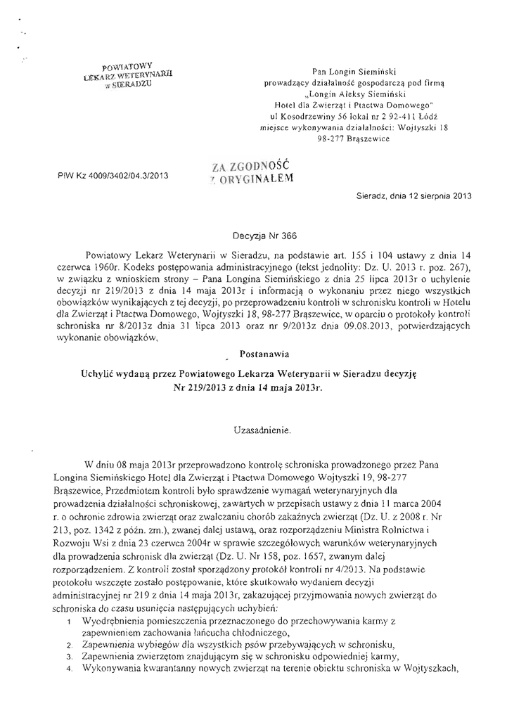 POWIATOWY LEKARZ WETERYNARM w SIERADZU PIW Kz 4009/3402/04.3/2013 Pan Longm Slemmski prowadzący działalność gospodarczą pod firmą „Longin Aleksy Siemiński Hotel dla Zwierząt i Ptactwa Domowego" ul Kosodrzewiny 56 lokal nr 2 92-411 Łódź miejsce wykonywania działalności: Wojtyszki 18 98-277 Brąszewice ZA ZGODNOŚĆ 7 ORYGINAŁEM Sieradz, dnia 12 sierpnia 2013 Decyzja Nr 366 Powiatowy Lekarz Weterynarii w Sieradzu, na podstawie art. 155 i 104 ustawy z dnia 14 czerwca 1960r. Kodeks postępowania administracyjnego (tekst jednolity: Dz. U. 2013 r. póz. 267), w związku z wnioskiem strony - Pana Longina Siemińskiego z dnia 25 lipca 2013r o uchylenie decyzji nr 219/2013 z dnia 14 maja 2013r i informacją o wykonaniu przez niego wszystkich obowiązków wynikających z tej decyzji, po przeprowadzeniu kontroli w schronisku kontroli w Hotelu dla Zwierząt i Ptactwa Domowego, Wojtyszki 18, 98-277 Brąszewice, w oparciu o protokoły kontroli schroniska nr 8/2013z dnia 31 lipca 2013 oraz nr 9/2013z dnia 09.08.2013, potwierdzających wykonanie obowiązków, Postanawia Uchylić wydaną przez Powiatowego Lekarza Weterynarii w Sieradzu decyzję Nr 219/2013 z dnia 14 maja 2013r. Uzasadnienie. W dniu 08 maja 2013r przeprowadzono kontrolę schroniska prowadzonego przez Pana Longina Siemińskiego Hotel dla Zwierząt i Ptactwa Domowego Wojtyszki 19, 98-277 Brąszewice, Przedmiotem kontroli było sprawdzenie wymagań weterynaryjnych dla prowadzenia działalności schroniskowej, zawartych w przepisach ustawy z dnia 11 marca 2004 r. o ochronie zdrowia zwierząt oraz zwalczaniu chorób zakaźnych zwierząt (Dz. U. z 2008 r. Nr 213, póz. 1342 z późn. zm.), zwanej dalej ustawą, oraz rozporządzeniu Ministra Rolnictwa i Rozwoju Wsi z dnia 23 czerwca 2004r w sprawie szczegółowych warunków weterynaryjnych dla prowadzenia schronisk dla zwierząt (Dz. U. Nr 158, póz. 1657, zwanym dalej rozporządzeniem. Z kontroli został sporządzony protokół kontroli nr 4/2013. Na podstawie protokołu wszczęte zostało postępowanie, które skutkowało wydaniem decyzji administracyjnej nr 219 z dnia 14 maja 2013r, zakazującej przyjmowania nowych zwierząt do schroniska do czasu usunięcia następujących uchybień: 1. Wyodrębnienia pomieszczenia przeznaczonego do przechowywania karmy z zapewnieniem zachowania łańcucha chłodniczego, 2. Zapewnienia wybiegów dla wszystkich psów przebywających w schronisku, 3. Zapewnienia zwierzętom znajdującym się w schronisku odpowiedniej karmy, 4. Wykonywania kwarantanny nowych zwierząt na terenie obiektu schroniska w Wojtyszkach, 5. Wykonania pomieszczeń na terenie tzw. boksów" X", zapewniających schronienie przed niekorzystnymi warunkami atmosferycznymi. Termin usunięcia uchybień ustalono na dzień 30 czerwca 2013 r. Od wydanej decyzji strona w dniu 17 maja 2013r (wpłynęło 23 maja 2013r) złożyła odwołanie do Łódzkiego Wojewódzkiego Lekarza Weterynarii za pośrednictwem PLW w Sieradzu. Powiatowy Lekarz Weterynarii w Sieradzu, w wyniku samokontroli własnej decyzji, przeprowadzonej w trybie art. 132 Kodeksu postępowania administracyjnego nie znalazł podstaw do uwzględnienia odwołania. Odwołanie przekazano w dnu 28 maja2013r. Łódzki Wojewódzki Lekarz Weterynarii w Łodzi w dniu 01 lipca 2013r uchylił zaskarżoną decyzję nr 219 w części dotyczącej terminu wykonania obowiązków i orzekł w tym zakresie, że termin usunięcia uchybień upływa 19 lipca 2013r, w pozostałym zakresie utrzymał zaskarżoną decyzję w mocy. Przeprowadzona prze inspektorów PIW Sieradz kontrola wykazała całkowite wykonanie części obowiązków określonych w decyzji m 219 z 14 maja 2013r. Na podstawie protokołu nr7/2013 z dnia 23 lipca 2013r, potwierdzono wykonanie odpowiedniego pomieszczenia chłodniczego do przechowywania karmy, zapewnieniem zachowania łańcucha chłodniczego, wykonano na terenie boksów tzw. „X" zabudowania zapewniające schronienie zwierzętom przed niekorzystnymi warunkami atmosferycznymi, od 02 lipca stosowana była karma kupowana od producentazatwierdzonego przez PLW w Tomaszowie Mazowieckim, WNI10168306. Dokonano również zmian w procedurach karmienia, karma podawana w pojemnikach plastikowych, mytych i dezynfekowanych u producenta karmy. Przedstawiono wykonany wybieg dla zwierząt tzw. „dwudziestek". Stwierdzono jednak w części boksów zbyt duże zagęszczenie zwierząt, które miały zostać przeniesione do nowych tzw. „dwudziestek". Ponadto pomieszczenia przewidziane do przeprowadzenia kwarantanny dla nowych zwierząt zlokalizowano w bezpośrednio w otoczeniu zwierząt przebywających w schronisku, nie przedstawiono procedur prowadzenia kwarantanny w schronisku. W dniu 25 lipca 2013r strona Pan Longin Siemiński złożył do Powiateogo Lekarza Weterynarii w Sieradzu infomację o wykonaniu wszystkich obowiązków nałożonych decyzją wraz z wnioskiem o uchylenie wydanej decyzji. W związku ze złożonym wnioskiem w dniach 29-31 lipca przeprowadzono kontrolę sprawdzającą wykonanie obowiązków. Wyniki kontroli zawarte są w protokole kontroli nr 8/2013z dnia 31 lipca 2013. Załącznikami do protokołu kontroli są: decyzja zatwierdzająca zakład producenta stosowanej karmy dla psów - WNI 10148303, specyfikacja dostarczanej karmy, procedura karmienia z dnia 30.07.2013. W protokole stwierdzono dodatkowo potrzebę opracowania procedury przeprowadzania kwarantanyy przyjmowanych do schroniska psów z uwzględnieniem zasad bioasekuracji, przeszkolenia pracowników do opieki nad zwierzętami w trakcie kwarantanny oraz przygotowania mat przed boksami kwarantanny. W dniach kontroli dokonano przeliczenia powierzchni boksów tzw „X", „XF, „V", „VII" pod kątem ilości przebywających tam psów i przypadających na pojedyncze psy powierzchni legowisk i wybiegów. W trakcie kontroli wskazano pojedyncze boksy w których zagęszczenie zwierząt było zbyt duże i wymagało przeniesienia niektórych zwierząt w sektorach 