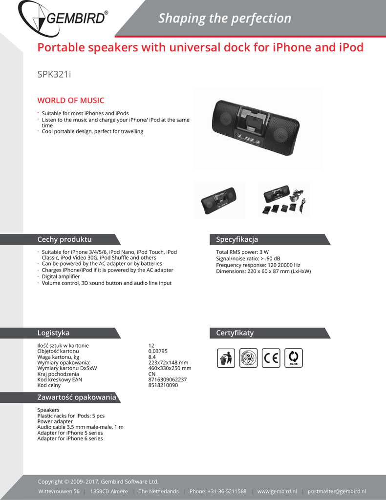 Portable speakers with universal dock for iPhone and iPod SPK321i WORLD OF MUSIC - Suitable for most iPhones and iPods - Listen to the music and charge your iPhone/ iPod at the same time - Cool portable design, perfect for travelling Cechy produktu Specyfikacja - Suitable for iPhone 3/4/5/6, iPod Nano, iPod Touch, iPod Classic, iPod Video 30G, iPod Shuffle and others - Can be powered by the AC adapter or by batteries - Charges iPhone/iPod if it is powered by the AC adapter - Digital amplifier - Volume control, 3D sound button and audio line input Total RMS power: 3 W Signal/noise ratio: >=60 dB Frequency response: 120 20000 Hz Dimensions: 220 x 60 x 87 mm (LxHxW) Logistyka Certyfikaty Ilość sztuk w kartonie Objętość kartonu Waga kartonu, kg Wymiary opakowania: Wymiary kartonu DxSxW Kraj pochodzenia Kod kreskowy EAN Kod celny 12 0.03795 8.4 223x72x148 mm 460x330x250 mm CN 8716309062237 8518210090 Zawartość opakowania Speakers Plastic racks for iPods: 5 pcs Power adapter Audio cable 3.5 mm male-male, 1 m Adapter for iPhone 5 series Adapter for iPhone 6 series Copyright © 2009–2017, Gembird Software Ltd. ! " # $ ! "