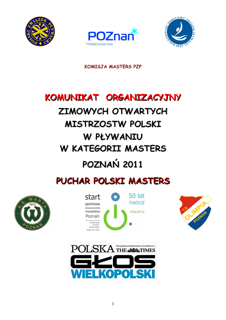 KOMISJA MASTERS PZP KOMUNIKAT ORGANIZACYJNY ZIMOWYCH OTWARTYCH MISTRZOSTW POLSKI W PŁYWANIU W KATEGORII MASTERS POZNAŃ 2011 PUCHAR POLSKI MASTERS 1 1. ORGANIZATORZY: Wielkopolski Okręgowy Związek Pływacki ul. Rybaki 18 a, tel. 61 639 70 49, faks 61 639 47 32 [email protected], www.wozp.poznan.pl Komisja Masters PZP 2. WSPÓŁORGANIZATORZY: KS Warta Poznań, SSI Start Poznań, TS Olimpia Poznań 3. PATRONAT: Prezydent Miasta Poznania 4. PATRONAT MEDIALNY: Polska Głos Wielkopolski 5. PRZEWODNICZĄCY KOMITETU ORGANIZACYJNEGO: Janusz Rajewski Prezes WOZP 6. TERMIN: 18-20.11.2011 7. MIEJSCE: Basen kryty Termy Maltańskie ul. Termalna 1 Długość 25 m, Ilość torów 10 Temperatura wody 27°C, Basen do rozgrzewki 8. POMIAR CZASU: Elektroniczny 9. UCZESTNICTWO: Prawo startu w zawodach mają zawodnicy i zawodniczki w wieku od 20 lat (urodzeni w 1991 roku i starsi). Bieg osób niepełnosprawnych bez ograniczeń wiekowych (open). Zawodnicy i zawodniczki muszą złożyć pisemne oświadczenie, że są zdrowi i startują na własną odpowiedzialność. Zawodnicy reprezentujący kluby i sekcje posiadające licencje PZP oraz kluby i sekcje nie posiadające licencji PZP muszą zgłaszać się do zawodów tylko w ramach zgłoszenia klubowego. Zawodnicy niezrzeszeni zgłaszają się indywidualnie. 2 10. ZGŁOSZENIA: 10.1. Zgłoszenia w formie LENEX FILE(w programie Splash Entry Editor) należy przesłać na adres: [email protected], tel. 501 648 415. Zgłoszenie w tej formie do pobrania na stronie internetowej Masters Polska: . http://www.masters.kania.opole.pl/. 10.2. Zgłoszenie w formacie Excell powinno zawierać listę zawodników z podaniem roku urodzenia, kategorii wiekowej, nazwy klubu, wybranych konkurencji (z podaniem aktualnych czasów) – wzór w załączeniu. 10.3. Zgłoszenia należy przesłać w nieprzekraczalnym terminie do dnia 12.11.2011. W CELU USPRAWNIENIA PRACY BIURA ZAWODÓW PROSIMY O KORZYSTANIE Z ZAŁĄCZONYCH WZORÓW ZGŁOSZEŃ. ZACHĘCAMY DO ZGŁASZANIA SIĘ W FORMIE SPLASH ENTRY EDITOR. 11. KATEGORIE WIEKOWE: „0” – 0 – 24 „G” – 55 - 59 „A” – 25 – 29 „H” – 60 - 64 „B” – 30 – 34 „I” – 65 - 69 „C” – 35 – 39 „J” – 70 - 74 „D” – 40 – 44 „K” – 75 - 79 „E” – 45 – 49 „L” – 80 - 84 „F” – 50 – 54 i ewentualnie dalej co 5 lat 12. SZTAFETY KLUBOWE: Prawo startu w sztafecie mają wyłącznie zawodnicy z jednego klubu. Łączny wiek (suma lat) czterech zawodników: „0” – do 96 lat „A” – 100 – 119 „D” – 200 - 239 „B” – 120 – 159 „E” – 240 - 279 „C” – 160 – 199 „F” – 280 + Nie dopuszcza się udziału zawodników z grupy 0 w sztafetach w kategoriach Masters. 13. PRZEPISY TECHNICZNE: Zawody przeprowadzone zostaną seriami na czas. Serie zostaną ustalone wg zgłoszonych aktualnych czasów. Brak wyniku na karcie zgłoszenia powoduje umieszczenie zawodnika w najsłabszej serii. Podczas zawodów obowiązują przepisy FINA i PZP. Zawodnicy i zawodniczki startują w kategoriach wiekowych wynikających z zasad zawodów Masters. Zawodnicy rywalizujący w grupie „0” nie mogą startować w sztafetach klasyfikowanych w kategoriach Masters (od 100 lat wzwyż). Uczestnicy Mistrzostw w ramach wpisowego mają prawo startu w następującej liczbie konkurencji: a) Blok Pierwszy – 1 konkurencja indywidualnie, 1 start w sztafecie 3 b) Blok Drugi - 2 konkurencje indywidualne, 1 start w sztafecie c) Blok Trzeci - 2 konkurencje indywidualnie, 1 start w sztafecie d) Blok Czwarty - 2 konkurencje indywidualnie, 1 start w sztafecie Konkurencje 800m stylem dowolnym, oraz 1500m stylem dowolnym w zależności od liczby zgłoszeń, mogą zostać przeprowadzone w formule dwie osoby na torze. W tym przypadku pomiar czasu zostanie przeprowadzony ręcznie. Organizator w razie dużej liczby zgłoszeń pozostawia sobie prawo do wprowadzenia limitów czasowych w następujących konkurencjach: a) 400 metrów stylem dowolnym kobiet i mężczyzn b) 400 metrów stylem zmiennym kobiet i mężczyzn c) 800 metrów stylem dowolnym kobiet i mężczyzn d) 1500 metrów stylem dowolnym kobiet i mężczyzn Organizator zapewnia sobie możliwość weryfikacji zgłoszeń pod kątem limitów i niedopuszczenie zawodników których najlepsze wyniki nie mieszczą się w limitach. 14. PROGRAM ZAWODÓW: BLOK I – PIĄTEK 18.11.2011 GODZ. 16:30 ROZGRZEWKA GODZ. 16:00 KOBIETY MĘŻCZYŹNI 14.1 800 m st. dowolnym 14.2 800 m st. dowolnym 14.3 100 m st. zmiennym 14.4 100 m st. zmiennym 14.5 1500 m st. dowolnym 14.6 1500 m st. dowolnym 14.7 4 x 50 m st. dowolnym 14.8 4 x 50 m st. dowolnym Dekoracje 800 m stylem dowolnym kobiet i mężczyzn podczas konkurencji 1500 m stylem dowolnym Dekoracje 100 m stylem zmiennym kobiet i mężczyzn podczas konkurencji 1500 m stylem dowolnym BLOK II – SOBOTA 19.11.2011 GODZ. 9:30 ROZGRZEWKA GODZ. 9:00 KOBIETY 14.9 100 m st. dowolnym MĘŻCZYŹNI 14.10 100 m st. dowolnym Dekoracje 1500 m stylem dowolnym kobiet i mężczyzn Dekoracje 4x50 m stylem dowolnym kobiet i mężczyzn 14.11 50 m st. klasycznym 14.12 50 m st. klasycznym 14.13 200 m st. motylkowym 14.14 200 m st. motylkowym 14.15 200 m st. grzbietowym 14.16 200 m st. grzbietowym 14.17 4 x 50 st. zmiennym 14.18 4 x 50 st. zmiennym Dekoracje 100 m stylem dowolnym, 50 m stylem klasycznym kobiet i mężczyzn 14.19 400 m st. dowolnym 14.20 400 m st. dowolnym Dekoracje 200 m stylem motylkowym, 200 m stylem grzbietowym i 4 x50 stylem zmiennym, podczas trwania konkurencji nr 17,18 4 BLOK III – SOBOTA 19.11.2011 UROCZYSTE OTWARCIE GODZ. 15:00 ROZGRZEWKA GODZ. 14:30 WYŚCIG VIP-ÓW 50 M ST. DOWOLNYM GODZ. 15:10 ROZPOCZĘCIE ZAWODÓW GODZ. 15:30 Dekoracje 400 m stylem dowolnym kobiet i mężczyzn Dekoracje wyścigu VIP-ów KOBIETY MĘŻCZYŹNI 14.21 200 m st. klasycznym 14.22 200 m st. klasycznym 14.23 100 m st. motylkowym 14.24 100 m st. motylkowym Dekoracje 200 m stylem klasycznym kobiet i mężczyzn 14.25 50 m st. grzbietow