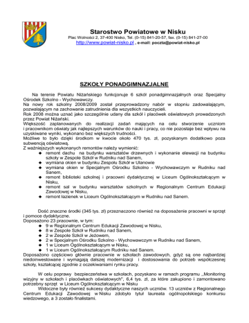 Starostwo Powiatowe w Nisku Plac Wolności 2, 37-400 Nisko, Tel. (0-15) 841-20-57, fax. (0-15) 841-27-00 http://www.powiat-nisko.pl , e-mail: [email protected] SZKOŁY PONADGIMNAZJALNE Na terenie Powiatu NiŜańskiego funkcjonuje 6 szkół ponadgimnazjalnych oraz Specjalny Ośrodek Szkolno - Wychowawczy. Na nowy rok szkolny 2008/2009 został przeprowadzony nabór w stopniu zadowalającym, pozwalającym na zachowanie zatrudnienia dla wszystkich nauczycieli. Rok 2008 moŜna uznać jako szczególnie udany dla szkół i placówek oświatowych prowadzonych przez Powiat NiŜański. Większość zaplanowanych do realizacji zadań mających na celu stworzenie uczniom i pracownikom oświaty jak najlepszych warunków do nauki i pracy, co nie pozostaje bez wpływu na uzyskiwane wyniki, wykonano bez większych trudności. MoŜliwe to było dzięki środkom w kwocie około 470 tys. zł, pozyskanym dodatkowo poza subwencją oświatową. Z waŜniejszych wykonanych remontów naleŜy wymienić: remont dachu na budynku warsztatów drzewnych i wykonanie elewacji na budynku szkoły w Zespole Szkół w Rudniku nad Sanem, wymiana okien w budynku Zespołu Szkół w Ulanowie wymiana okien w Specjalnym Ośrodku Szkolno - Wychowawczym w Rudniku nad Sanem, remont biblioteki szkolnej i pracowni dydaktycznej w Liceum Ogólnokształcącym w Nisku, remont sal w budynku warsztatów szkolnych w Regionalnym Centrum Edukacji Zawodowej w Nisku, remont łazienek w Liceum Ogólnokształcącym w Rudniku nad Sanem. Dość znaczne środki (345 tys. zł) przeznaczono równieŜ na doposaŜenie pracowni w sprzęt i pomoce dydaktyczne. DoposaŜono 23 pracownie, w tym: 9 w Regionalnym Centrum Edukacji Zawodowej w Nisku, 8 w Zespole Szkół w Rudniku nad Sanem, 2 w Zespole Szkól w JeŜowem, 2 w Specjalnym Ośrodku Szkolno - Wychowawczym w Rudniku nad Sanem, 1 w Liceum Ogólnokształcącym w Nisku, 1 w Liceum Ogólnokształcącym Rudniku nad Sanem. DoposaŜono częściowo głównie pracownie w szkołach zawodowych, gdyŜ są one najbardziej niedoinwestowane i wymagają dalszej modernizacji i dostosowania do potrzeb współczesnej szkoły, kształcącej zgodnie z oczekiwaniami rynku pracy. W celu poprawy bezpieczeństwa w szkołach, pozyskano w ramach programu ,,Monitoring wizyjny w szkołach i placówkach oświatowych'', 6,4 tys. zł, za które zakupiono i zamontowano potrzebny sprzęt w Liceum Ogólnokształcącym w Nisku Widoczne były równieŜ sukcesy dydaktyczne naszych uczniów. 13 uczniów z Regionalnego Centrum Edukacji Zawodowej w Nisku zdobyło tytuł laureata ogólnopolskiego konkursu wiedzowego, a 3 zostało finalistami. Uczniowie Zespołu Szkół w JeŜowem, wraz ze swoim opiekunem, odnieśli po raz kolejny sukces w XV Ogólnopolskim Konkursie Gazetek Szkolnych ,,Pałuckie Pióro 2008”. Do waŜniejszych wydarzeń, które odbyły się w szkołach w 2008 r. naleŜy zaliczyć: obchody 100lecia Zespołu Szkół w Rudniku nad Sanem oraz Uroczystość Poświęcenia i Wręczenia Odnowionego Sztandaru Liceum Ogólnokształcącego w Nisku . Bardzo duŜy nacisk jest połoŜony na poprawę poziomu i wizerunku istniejących szkół. Dwuletnia rzetelna praca w tym względzie, przyniosła bardzo dobre efekty w Regionalnym Centrum Edukacji Zawodowej w Nisku. Na początku 2009 roku ,, Rzeczpospolita “ i ,,Perspektywy” przeprowadziły Ogólnopolski Ranking Szkół Ponadgimnazjalnych. Kapituła po raz 11 wyłoniła najlepsze szkoły ponadgimnazjalne w Polsce. Przy układaniu zestawienia brano pod uwagę sukcesy uzyskiwane przez uczniów w ogólnopolskich konkursach wiedzy. Sukcesy szkół były mierzone proporcjonalnie do liczby uczniów. W tegorocznym Rankingu Regionalne Centrum Edukacji Zawodowej w Nisku uplasowało się na 92 miejscu. Jest to bardzo duŜy sukces szkoły, biorąc pod uwagę fakt, Ŝe w tym samym rankingu w 2008 r. RCEZ znalazło się na 372 miejscu. W poprzednich 9 edycjach rankingu RCEZ nie był w ogóle klasyfikowany. Po roku dobrej, spokojnej pracy, zanotował olbrzymi skok i znalazł się w 1 - szej setce wyróŜnionych 384 szkół, jako jedyna szkoła z Powiatu NiŜańskiego. W kategorii „Najlepszych szkół w województwach”, RCEZ zajęło wysokie 6 miejsce, na 19 szkół sklasyfikowanych w Rankingu Szkół Województwa Podkarpackiego, i odnotowało awans z 26 miejsca w 2008 r. W tym Rankingu jest równieŜ jedyną sklasyfikowaną szkołą z Powiatu NiŜańskiego. JeŜeli rozpatrywać wyniki rankingu w kategorii szkół technicznych to sukces RCEZ w Nisku jest jeszcze większy - RCEZ zajął 4 miejsce w skali kraju oraz pierwsze miejsce w Województwie Podkarpackim. Jest to znakomita reklama szkoły i informacja dla gimnazjalistów przy wyborze szkoły średniej w 2009 r. Tak duŜe osiągnięcia uczniów były moŜliwe dzięki dobrej współpracy i duŜemu zaangaŜowaniu dyrekcji szkoły, nauczycieli i uczniów. BieŜące inwestycje i remonty szkół 1. „Budowa sali gimnastycznej przy Zespole Szkół w JeŜowem”. Wartość kosztorysowa inwestycji: 2.425.725,00 zł. Wartość robót wykonanych w 2008 r. stanowi kwotę 400.000,00 zł. Inwestycja dofinansowana w kwocie 800.000 zł ze środków Ministerstwa Sportu. Planowane zakończenie budowy – 31 lipiec 2009 r. Po oddaniu do uŜytkowania sali gimnastycznej przy Zespole Szkół w JeŜowem, wszystkie szkoły średnie Powiatu NiŜańskiego będą posiadać własne sale gimnastyczne. 2. Regionalne Centrum Edukacji Zawodowej w Nisku Wykonano roboty remontowe na kwotę 57.819,61 zł w zakresie remontu kan., wymiany okien i remontu sal lekcyjnych. instalacji wod. - 3. Liceum Ogólnokształcące w Nisku: Wykonano roboty remontowe na kwotę 73.822,14 zł, w tym: remont sali komputerowej , roboty malarskie, remont sali 17 i biblioteki szkolnej oraz róŜne drobne naprawy. 4. Poradnia Psychologiczno-Pedagogiczna w Nisku Wykonano drobne roboty remontowe na wartość 3.500,00 zł. 5. Liceum Ogólnokształcące w Rudniku nad Sanem Wykonano remont łazienki i drob