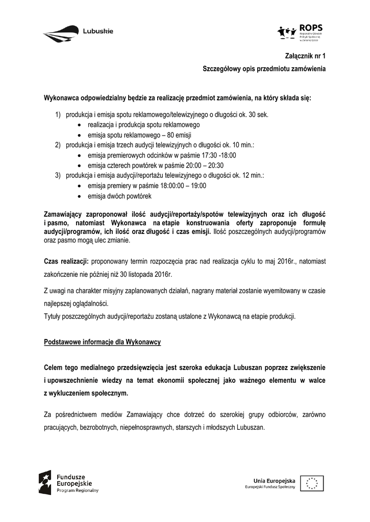 Załącznik nr 1 Szczegółowy opis przedmiotu zamówienia Wykonawca odpowiedzialny będzie za realizację przedmiot zamówienia, na który składa się: 1) produkcja i emisja spotu reklamowego/telewizyjnego o długości ok. 30 sek. realizacja i produkcja spotu reklamowego emisja spotu reklamowego – 80 emisji 2) produkcja i emisja trzech audycji telewizyjnych o długości ok. 10 min.: emisja premierowych odcinków w paśmie 17:30 -18:00 emisja czterech powtórek w paśmie 20:00 – 20:30 3) produkcja i emisja audycji/reportażu telewizyjnego o długości ok. 12 min.: emisja premiery w paśmie 18:00:00 – 19:00 emisja dwóch powtórek Zamawiający zaproponował ilość audycji/reportaży/spotów telewizyjnych oraz ich długość i pasmo, natomiast Wykonawca na etapie konstruowania oferty zaproponuje formułę audycji/programów, ich ilość oraz długość i czas emisji. Ilość poszczególnych audycji/programów oraz pasmo mogą ulec zmianie. Czas realizacji: proponowany termin rozpoczęcia prac nad realizacja cyklu to maj 2016r., natomiast zakończenie nie później niż 30 listopada 2016r. Z uwagi na charakter misyjny zaplanowanych działań, nagrany materiał zostanie wyemitowany w czasie najlepszej oglądalności. Tytuły poszczególnych audycji/reportażu zostaną ustalone z Wykonawcą na etapie produkcji. Podstawowe informacje dla Wykonawcy Celem tego medialnego przedsięwzięcia jest szeroka edukacja Lubuszan poprzez zwiększenie i upowszechnienie wiedzy na temat ekonomii społecznej jako ważnego elementu w walce z wykluczeniem społecznym. Za pośrednictwem mediów Zamawiający chce dotrzeć do szerokiej grupy odbiorców, zarówno pracujących, bezrobotnych, niepełnosprawnych, starszych i młodszych Lubuszan. Dotychczas w przeważającej części w mediach można było usłyszeć: czym jest ekonomia społeczna, czy jakie są podmioty ekonomii społecznej? Ci, którzy coś o niej słyszeli, mają często fałszywe wyobrażenia na jej temat, kojarząc ją najczęściej z formą pomocy społecznej czy też zatrudnienia socjalnego. Dlatego też niezbędne jest upowszechnienie ekonomii społecznej w zbiorowej świadomości oraz zbudowanie jej silnej, pozytywnej marki. W zaplanowanych audycjach/reportażach/spotach telewizyjnych Zamawiający za pośrednictwem mediów chce prezentować funkcjonujące podmioty ekonomii społecznej, ludzi, którzy w sposób jasny i zrozumiały przedstawią jak można założyć taki podmiot. Zostanie postawione pytanie: czy w ogóle warto się nad tym zastanowić? Podmioty ekonomii społecznej: spółdzielnie socjalne, kluby integracji społecznej, centra integracji społecznej zostaną przedstawione jako pomysł na bezrobocie, ubóstwo, bezdomność, alkoholizm. Ukazane zostaną podmioty, które stanowią tzw. dobre praktyki, prezentowanie usług i produktów zwiększających ich szanse na wolnym rynku. Dodatkowo ważne: Z uwagi na to, że Zamawiający przewiduje kontynuacje cyklu audycji i reportaży o podobnej tematyce w kolejnych latach 2017-2018, Wykonawca wytypuje jedną osobę, która wejdzie w skład grupy roboczej Regionalnego Komitetu Ekonomii Społecznej ds. współpracy z mediami. Spotkania takie odbywać się będą dwa razy w roku. W skład grupy wejdą przedstawiciele mediów, pracownicy Regionalnego Ośrodka Polityki Społecznej w Zielonej Górze, członkowie Regionalnego Komitetu Rozwoju Ekonomii Społecznej. Grupa ta będzie pełnić funkcję doradczą, rekomendować najskuteczniejsze działania ukierunkowane na to, aby podmioty ekonomii społecznej stały się widoczne. Do zadań Wykonawcy należeć będzie: 1. Zaproponowanie tytułu całego przedsięwzięcia. 2. Współpraca z Zamawiającym na każdym etapie realizacji przedmiotu zamówienia. 3. Przygotowanie (opracowanie treści spotu) nagranie i emisję spotu telewizyjnego związanego z realizowaną kampanią: spot o długości ok. 30 sek. ilość emisji – 80 emisji 4. Przygotowanie i emisję cyklu audycji i reportażu: Wykonawca przedstawi szczegółowy projekt dot. przygotowania i emisji cyklu min. audycji i reportażu, ilość oraz czas i długość emisji audycji i reportażu. Plan emisji zostanie ustalony z Zamawiającym w terminie późniejszym; na 5 dni przed rozpoczęciem cyklu audycji pojawią się zwiastuny zapowiadające ich emisje; w tygodniu w którym zostanie wyemitowany reportaż pojawiać się będą na antenie TV zwiastuny/zapowiedzi lub inne informacje (5 razy dziennie, trzy dni przed emisją reportażu) zapraszające do jego oglądnięcia. 5. Konkurs – Wykonawca zaproponuje koncepcję przeprowadzenia konkursu na antenie TV z zakresu tworzenia i funkcjonowania podmiotów ekonomii społecznej. 6. Nagrody w konkursie: Wykonawca zapewni drobne upominki dla zwycięzców konkursu (o ile będą). 7. Promocja na stronie TV …. wyemitowane audycje oraz reportaż zostaną zamieszczone na stronie internetowej Wykonawcy, wraz z ich krótkim opisem; w trakcie realizacji cyklu antenowego na stronie TV. pojawi się link do strony projektu Zamawiającego. 8. Wyemitowania nagranego materiału w czasie najlepszej oglądalności. 9. Wykonawca będzie informował przed i po emisji audycji i reportażu o finansowaniu cyklu antenowego ze środków Europejskiego Funduszu Społecznego w ramach Regionalnego Programu Operacyjnego Lubuskie 2020 na zlecenie Regionalnego Ośrodka Polityki Społecznej w Zielonej Górze.