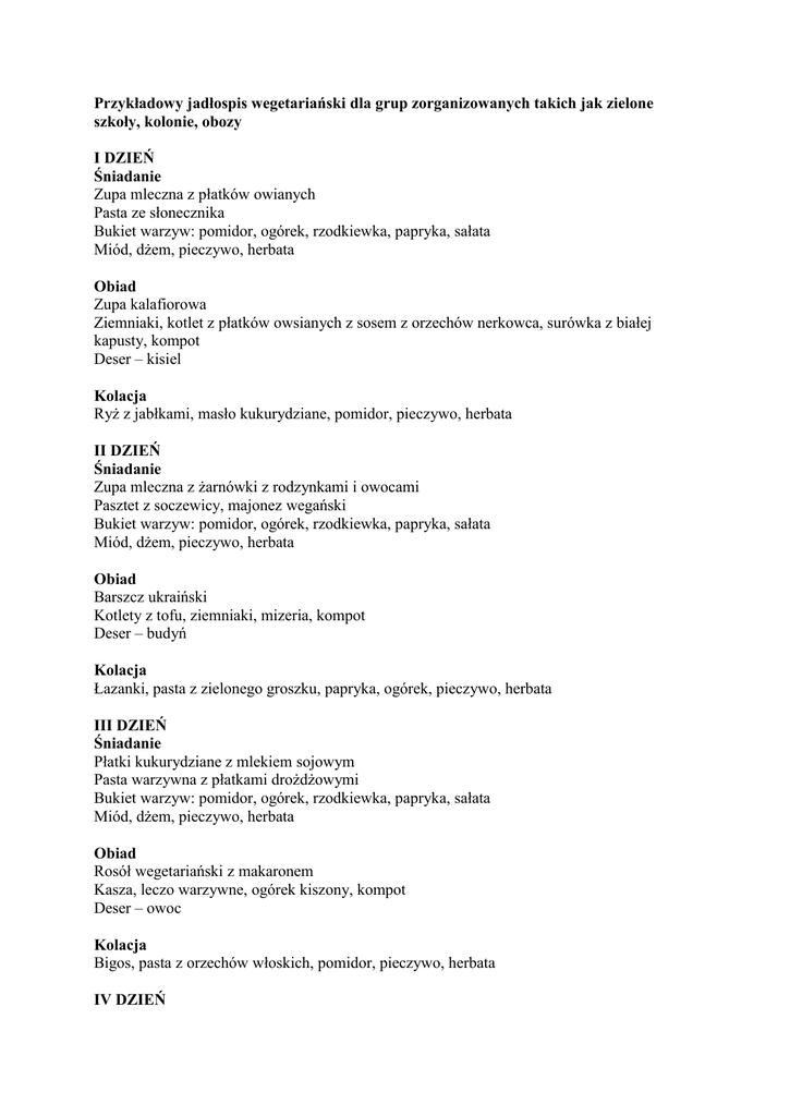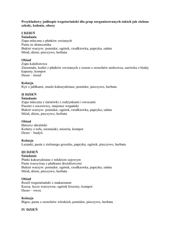 Przykładowy jadłospis wegetariański dla grup zorganizowanych takich jak zielone szkoły, kolonie, obozy I DZIEŃ Śniadanie Zupa mleczna z płatków owianych Pasta ze słonecznika Bukiet warzyw: pomidor, ogórek, rzodkiewka, papryka, sałata Miód, dżem, pieczywo, herbata Obiad Zupa kalafiorowa Ziemniaki, kotlet z płatków owsianych z sosem z orzechów nerkowca, surówka z białej kapusty, kompot Deser – kisiel Kolacja Ryż z jabłkami, masło kukurydziane, pomidor, pieczywo, herbata II DZIEŃ Śniadanie Zupa mleczna z żarnówki z rodzynkami i owocami Pasztet z soczewicy, majonez wegański Bukiet warzyw: pomidor, ogórek, rzodkiewka, papryka, sałata Miód, dżem, pieczywo, herbata Obiad Barszcz ukraiński Kotlety z tofu, ziemniaki, mizeria, kompot Deser – budyń Kolacja Łazanki, pasta z zielonego groszku, papryka, ogórek, pieczywo, herbata III DZIEŃ Śniadanie Płatki kukurydziane z mlekiem sojowym Pasta warzywna z płatkami drożdżowymi Bukiet warzyw: pomidor, ogórek, rzodkiewka, papryka, sałata Miód, dżem, pieczywo, herbata Obiad Rosół wegetariański z makaronem Kasza, leczo warzywne, ogórek kiszony, kompot Deser – owoc Kolacja Bigos, pasta z orzechów włoskich, pomidor, pieczywo, herbata IV DZIEŃ Śniadanie Kasza jaglana z rodzynkami i ananasem Serek tofu ze szczypiorkiem Bukiet warzyw: pomidor, ogórek, rzodkiewka, papryka, sałata Miód, dżem, pieczywo, herbata Obiad Zupa pomidorowa z ryżem Kotlety z kaszy jaglanej z orzechami włoskimi, sałatka makaronowa Deser – mus truskawkowy Kolacja Naleśniki z owocami, smalczyk wegetariański, ogórek kiszony, pieczywo, herbata V DZIEŃ Śniadanie Müsli z mlekiem sojowym Pasta z cieciorki Bukiet warzyw: pomidor, ogórek, rzodkiewka , papryka, sałata Miód, dżem, pieczywo, herbata Obiad Krem z brokułów z groszkiem ptysiowym Pierogi ruskie z cebulką Deser – sałatka owocowa Kolacja Sałatka jarzynowa, pasztet z soczewicy, pomidor, pieczywo, herbata