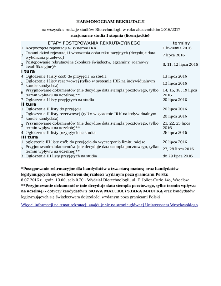 HARMONOGRAM REKRUTACJI na wszystkie rodzaje studiów Biotechnologii w roku akademickim 2016/2017 stacjonarne studia I stopnia (licencjackie) ETAPY POSTĘPOWANIA REKRUTACYJNEGO 1 Rozpoczęcie rejestracji w systemie IRK Ostatni dzień rejestracji i wnoszenia opłat rekrutacyjnych (decyduje data 2 wykonania przelewu) Postępowanie rekrutacyjne (konkurs świadectw, egzaminy, rozmowy 3 kwalifikacyjne)* I tura 4 Ogłoszenie I listy osób do przyjęcia na studia Ogłoszenie I listy rezerwowej (tylko w systemie IRK na indywidualnym 5 koncie kandydata) Przyjmowanie dokumentów (nie decyduje data stempla pocztowego, tylko 6 termin wpływu na uczelnię)** 7 Ogłoszenie I listy przyjętych na studia II tura 1 Ogłoszenie II listy do przyjęcia Ogłoszenie II listy rezerwowej (tylko w systemie IRK na indywidualnym 2 koncie kandydata) Przyjmowanie dokumentów (nie decyduje data stempla pocztowego, tylko 3 termin wpływu na uczelnię)** 4 Ogłoszenie II listy przyjętych na studia III tura 1 ogłoszenie III listy osób do przyjęcia do wyczerpania limitu miejsc Przyjmowanie dokumentów (nie decyduje data stempla pocztowego, tylko 2 termin wpływu na uczelnię)** 3 Ogłoszenie III listy przyjętych na studia terminy 1 kwietnia 2016 7 lipca 2016 8, 11, 12 lipca 2016 13 lipca 2016 13 lipca 2016 14, 15, 18, 19 lipca 2016 20 lipca 2016 20 lipca 2016 20 lipca 2016 21, 22, 25 lipca 2016 26 lipca 2016 26 lipca 2016 27, 28 lipca 2016 do 29 lipca 2016 *Postępowanie rekrutacyjne dla kandydatów z tzw. starą maturą oraz kandydatów legitymujących się świadectwem dojrzałości wydanym poza granicami Polski: 8.07.2016 r., godz. 10.00, sala 0.30 - Wydział Biotechnologii, ul. F. Joliot-Curie 14a, Wrocław **Przyjmowanie dokumentów (nie decyduje data stempla pocztowego, tylko termin wpływu na uczelnię) - dotyczy kandydatów z NOWĄ MATURĄ i STARĄ MATURĄ oraz kandydatów legitymujących się świadectwem dojrzałości wydanym poza granicami Polski Więcej informacji na temat rekrutacji znajduje się na stronie głównej Uniwersytetu Wrocławskiego