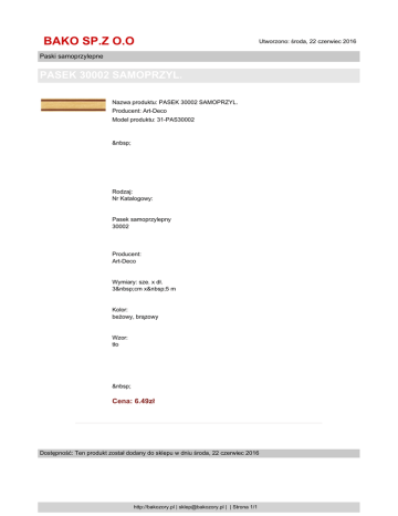 BAKO SP.Z O.O Paski samoprzylepne PASEK 30002 SAMOPRZYL. Nazwa produktu: PASEK 30002 SAMOPRZYL. Producent: Art-Deco Model produktu: 31-PAS30002 Rodzaj: Nr Katalogowy: Pasek samoprzylepny 30002 Producent: Art-Deco Wymiary: sze. x dł. 3 cm x 5 m Kolor: beżowy, brązowy Wzor: tło Cena: 6.49zł Dostępność: Ten produkt został dodany do sklepu w dniu środa, 22 czerwiec 2016 http://bakozory.pl | [email protected] | | Strona 1/1 Utworzono: środa, 22 czerwiec 2016
