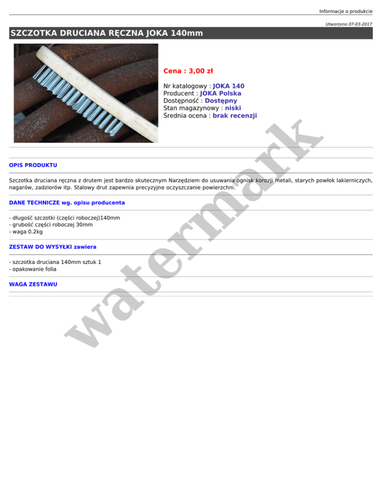 Informacje o produkcie Utworzono 07-03-2017 SZCZOTKA DRUCIANA RĘCZNA JOKA 140mm Cena : 3,00 zł OPIS PRODUKTU er m ar k Nr katalogowy : JOKA 140 Producent : JOKA Polska Dostępność : Dostępny Stan magazynowy : niski Średnia ocena : brak recenzji Szczotka druciana ręczna z drutem jest bardzo skutecznym Narzędziem do usuwania ognisk korozji metali, starych powłok lakierniczych, nagarów, zadziorów itp. Stalowy drut zapewnia precyzyjne oczyszczanie powierzchni. DANE TECHNICZE wg. opisu producenta - długość szczotki (części roboczej)140mm - grubość części roboczej 30mm - waga 0.2kg ZESTAW DO WYSYŁKI zawiera w WAGA ZESTAWU at - szczotka druciana 140mm sztuk 1 - opakowanie folia