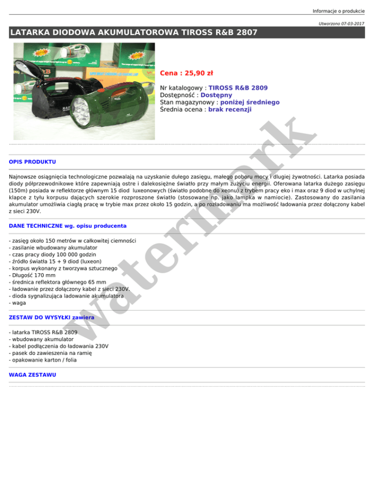 Informacje o produkcie Utworzono 07-03-2017 LATARKA DIODOWA AKUMULATOROWA TIROSS R&B 2807 Cena : 25,90 zł er m ar k Nr katalogowy : TIROSS R&B 2809 Dostępność : Dostępny Stan magazynowy : poniżej średniego Średnia ocena : brak recenzji OPIS PRODUKTU Najnowsze osiągnięcia technologiczne pozwalają na uzyskanie dułego zasięgu, małego poboru mocy i dlugiej żywotności. Latarka posiada diody półprzewodnikowe które zapewniają ostre i dalekosiężne światło przy małym zużyciu energii. Oferowana latarka dużego zasięgu (150m) posiada w reflektorze głównym 15 diod luxeonowych (światło podobne do xeonu) z trybem pracy eko i max oraz 9 diod w uchylnej klapce z tyłu korpusu dających szerokie rozproszone światło (stosowane np. jako lampka w namiocie). Zastosowany do zasilania akumulator umożliwia ciagłą pracę w trybie max przez około 15 godzin, a po rozładowaniu ma możliwość ładowania przez dołączony kabel z sieci 230V. DANE TECHNICZNE wg. opisu producenta at - zasięg około 150 metrów w całkowitej ciemności - zasilanie wbudowany akumulator - czas pracy diody 100 000 godzin - źródło światła 15 + 9 diod (luxeon) - korpus wykonany z tworzywa sztucznego - Długość 170 mm - średnica reflektora głównego 65 mm - ładowanie przez dołączony kabel z sieci 230V. - dioda sygnalizująca ladowanie akumulatora - waga w ZESTAW DO WYSYŁKI zawiera - latarka TIROSS R&B 2809 - wbudowany akumulator - kabel podłączenia do ładowania 230V - pasek do zawieszenia na ramię - opakowanie karton / folia WAGA ZESTAWU