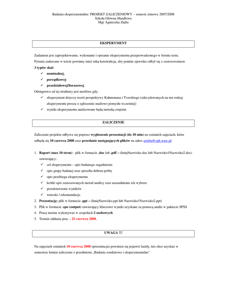 Badania eksperymentalne: PROJEKT ZALICZENIOWY – semestr zimowy 2007/2008 Szkoła Główna Handlowa Mgr Agnieszka Zięba EKSPERYMENT Zadaniem jest zaprojektowanie, wykonanie i opisanie eksperymentu przeprowadzonego w formie testu. Pytania zadawane w teście powinny mieć taką konstrukcję, aby pomiar zjawiska odbył się z zastosowaniem 3 typów skal: nominalnej, porządkowej przedziałowej/ilorazowej. Odstępstwo od tej struktury jest możliwe gdy: eksperyment dotyczy teorii perspektywy Kahnemana i Tverskiego (zdecydowanych na ten rodzaj eksperymentu proszę o zgłoszenie mailowo pomysłu wcześniej) wyniki eksperymentu analizowane będą metodą conjoint. ZALICZENIE Zaliczenie projektu odbywa się poprzez wygłoszenie prezentacji (do 10 min) na ostatnich zajęciach, które odbędą się 10 czerwca 2008 oraz przesłanie następujących plików na adres [email protected]: 1. Raport (max 10 stron) - plik w formacie .doc lub .pdf – (ImięNazwisko.doc lub Nazwisko1Nazwisko2.doc) zawierający: cel eksperymentu – opis badanego zagadnienia opis grupy badanej oraz sposobu doboru próby opis przebiegu eksperymentu krótki opis zastosowanych metod analizy oraz uzasadnienie ich wyboru przedstawienie wyników wnioski / rekomendacje. 2. Prezentację: plik w formacie .ppt – (ImięNazwisko.ppt lub Nazwisko1Nazwisko2.ppt) 3. Plik w formacie .spo (output) zawierający kluczowe wyniki uzyskane za pomocą analiz w pakiecie SPSS 4. Pracę można wykonywać w zespołach 2 osobowych. 5. Termin oddania prac – 25 czerwca 2008. UWAGA !!! Na zajęciach ostatnich 10 czerwca 2008 (prezentacja) powinien się pojawić każdy, kto chce uzyskać w semestrze letnim zaliczenie z przedmiotu „Badania sondażowe i eksperymentalne”.