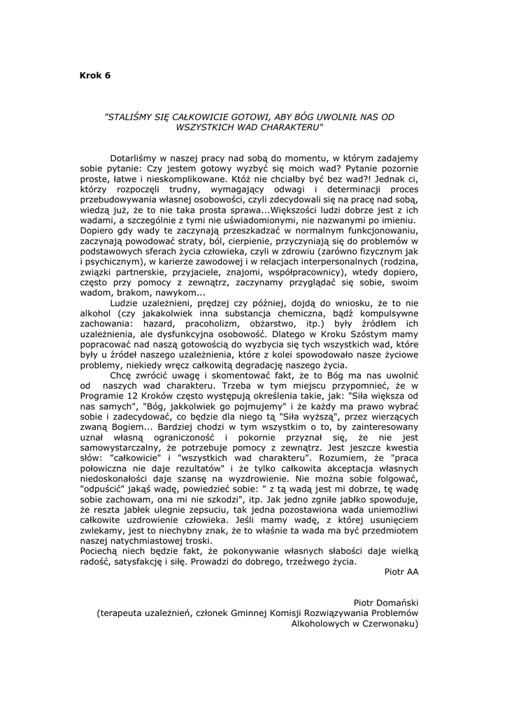 Krok 6 "STALIŚMY SIĘ CAŁKOWICIE GOTOWI, ABY BÓG UWOLNIŁ NAS OD WSZYSTKICH WAD CHARAKTERU" Dotarliśmy w naszej pracy nad sobą do momentu, w którym zadajemy sobie pytanie: Czy jestem gotowy wyzbyć się moich wad? Pytanie pozornie proste, łatwe i nieskomplikowane. Któż nie chciałby być bez wad?! Jednak ci, którzy rozpoczęli trudny, wymagający odwagi i determinacji proces przebudowywania własnej osobowości, czyli zdecydowali się na pracę nad sobą, wiedzą już, że to nie taka prosta sprawa...Większości ludzi dobrze jest z ich wadami, a szczególnie z tymi nie uświadomionymi, nie nazwanymi po imieniu. Dopiero gdy wady te zaczynają przeszkadzać w normalnym funkcjonowaniu, zaczynają powodować straty, ból, cierpienie, przyczyniają się do problemów w podstawowych sferach życia człowieka, czyli w zdrowiu (zarówno fizycznym jak i psychicznym), w karierze zawodowej i w relacjach interpersonalnych (rodzina, związki partnerskie, przyjaciele, znajomi, współpracownicy), wtedy dopiero, często przy pomocy z zewnątrz, zaczynamy przyglądać się sobie, swoim wadom, brakom, nawykom... Ludzie uzależnieni, prędzej czy później, dojdą do wniosku, że to nie alkohol (czy jakakolwiek inna substancja chemiczna, bądź kompulsywne zachowania: hazard, pracoholizm, obżarstwo, itp.) były źródłem ich uzależnienia, ale dysfunkcyjna osobowość. Dlatego w Kroku Szóstym mamy popracować nad naszą gotowością do wyzbycia się tych wszystkich wad, które były u źródeł naszego uzależnienia, które z kolei spowodowało nasze życiowe problemy, niekiedy wręcz całkowitą degradację naszego życia. Chcę zwrócić uwagę i skomentować fakt, że to Bóg ma nas uwolnić od naszych wad charakteru. Trzeba w tym miejscu przypomnieć, że w Programie 12 Kroków często występują określenia takie, jak: "Siła większa od nas samych", "Bóg, jakkolwiek go pojmujemy" i że każdy ma prawo wybrać sobie i zadecydować, co będzie dla niego tą "Siła wyższą", przez wierzących zwaną Bogiem... Bardziej chodzi w tym wszystkim o to, by zainteresowany uznał własną ograniczoność i pokornie przyznał się, że nie jest samowystarczalny, że potrzebuje pomocy z zewnątrz. Jest jeszcze kwestia słów: "całkowicie" i "wszystkich wad charakteru". Rozumiem, że "praca połowiczna nie daje rezultatów" i że tylko całkowita akceptacja własnych niedoskonałości daje szansę na wyzdrowienie. Nie można sobie folgować, "odpuścić" jakąś wadę, powiedzieć sobie: " z tą wadą jest mi dobrze, tę wadę sobie zachowam, ona mi nie szkodzi", itp. Jak jedno zgniłe jabłko spowoduje, że reszta jabłek ulegnie zepsuciu, tak jedna pozostawiona wada uniemożliwi całkowite uzdrowienie człowieka. Jeśli mamy wadę, z której usunięciem zwlekamy, jest to niechybny znak, że to właśnie ta wada ma być przedmiotem naszej natychmiastowej troski. Pociechą niech będzie fakt, że pokonywanie własnych słabości daje wielką radość, satysfakcję i siłę. Prowadzi do dobrego, trzeźwego życia. Piotr AA Piotr Domański (terapeuta uzależnień, członek Gminnej Komisji Rozwiązywania Problemów Alkoholowych w Czerwonaku)