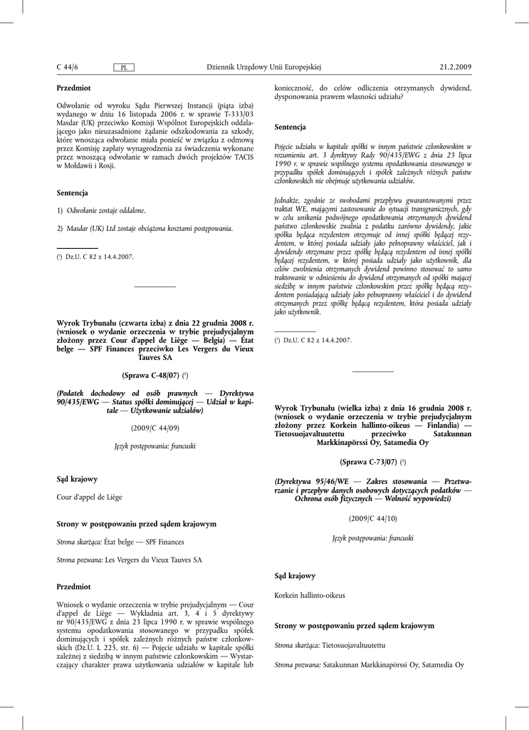 C 44/6 Dziennik Urzędowy Unii Europejskiej PL 21.2.2009 konieczność, do celów odliczenia otrzymanych dywidend, dysponowania prawem własności udziału? Przedmiot Odwołanie od wyroku Sądu Pierwszej Instancji (piąta izba) wydanego w dniu 16 listopada 2006 r. w sprawie T-333/03 Masdar (UK) przeciwko Komisji Wspólnot Europejskich oddalającego jako nieuzasadnione żądanie odszkodowania za szkody, które wnosząca odwołanie miała ponieść w związku z odmową przez Komisję zapłaty wynagrodzenia za świadczenia wykonane przez wnoszącą odwołanie w ramach dwóch projektów TACIS w Mołdawii i Rosji. Sentencja Sentencja Pojęcie udziału w kapitale spółki w innym państwie członkowskim w rozumieniu art. 3 dyrektywy Rady 90/435/EWG z dnia 23 lipca 1990 r. w sprawie wspólnego systemu opodatkowania stosowanego w przypadku spółek dominujących i spółek zależnych różnych państw członkowskich nie obejmuje użytkowania udziałów. (1) Dz.U. C 82 z 14.4.2007. Jednakże, zgodnie ze swobodami przepływu gwarantowanymi przez traktat WE, mającymi zastosowanie do sytuacji transgranicznych, gdy w celu unikania podwójnego opodatkowania otrzymanych dywidend państwo członkowskie zwalnia z podatku zarówno dywidendy, jakie spółka będąca rezydentem otrzymuje od innej spółki będącej rezydentem, w której posiada udziały jako pełnoprawny właściciel, jak i dywidendy otrzymane przez spółkę będącą rezydentem od innej spółki będącej rezydentem, w której posiada udziały jako użytkownik, dla celów zwolnienia otrzymanych dywidend powinno stosować to samo traktowanie w odniesieniu do dywidend otrzymanych od spółki mającej siedzibę w innym państwie członkowskim przez spółkę będącą rezydentem posiadającą udziały jako pełnoprawny właściciel i do dywidend otrzymanych przez spółkę będącą rezydentem, która posiada udziały jako użytkownik. Wyrok Trybunału (czwarta izba) z dnia 22 grudnia 2008 r. (wniosek o wydanie orzeczenia w trybie prejudycjalnym złożony przez Cour d'appel de Liège — Belgia) — État belge — SPF Finances przeciwko Les Vergers du Vieux Tauves SA (1) Dz.U. C 82 z 14.4.2007. 1) Odwołanie zostaje oddalone. 2) Masdar (UK) Ltd zostaje obciążona kosztami postępowania. (Sprawa C-48/07) (1) (Podatek dochodowy od osób prawnych — Dyrektywa 90/435/EWG — Status spółki dominującej — Udział w kapitale — Użytkowanie udziałów) (2009/C 44/09) Język postępowania: francuski Wyrok Trybunału (wielka izba) z dnia 16 grudnia 2008 r. (wniosek o wydanie orzeczenia w trybie prejudycjalnym złożony przez Korkein hallinto-oikeus — Finlandia) — Tietosuojavaltuutettu przeciwko Satakunnan Markkinapörssi Oy, Satamedia Oy (Sprawa C-73/07) (1) Sąd krajowy Cour d'appel de Liège (Dyrektywa 95/46/WE — Zakres stosowania — Przetwarzanie i przepływ danych osobowych dotyczących podatków — Ochrona osób fizycznych — Wolność wypowiedzi) (2009/C 44/10) Strony w postępowaniu przed sądem krajowym Język postępowania: francuski Strona skarżąca: État belge — SPF Finances Strona pozwana: Les Vergers du Vieux Tauves SA Sąd krajowy Przedmiot Korkein hallinto-oikeus Wniosek o wydanie orzeczenia w trybie prejudycjalnym — Cour d'appel de Liège — Wykładnia art. 3, 4 i 5 dyrektywy nr 90/435/EWG z dnia 23 lipca 1990 r. w sprawie wspólnego systemu opodatkowania stosowanego w przypadku spółek dominujących i spółek zależnych różnych państw członkowskich (Dz.U. L 225, str. 6) — Pojęcie udziału w kapitale spółki zależnej z siedzibą w innym państwie członkowskim — Wystarczający charakter prawa użytkowania udziałów w kapitale lub Strony w postępowaniu przed sądem krajowym Strona skarżąca: Tietosuojavaltuutettu Strona pozwana: Satakunnan Markkinapörssi Oy, Satamedia Oy