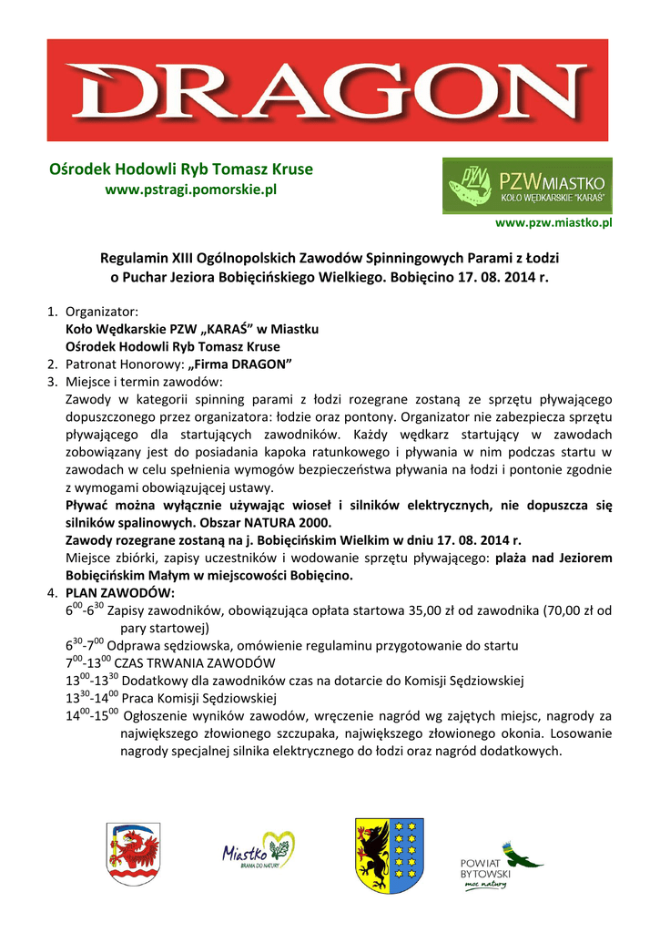 Ośrodek Hodowli Ryb Tomasz Kruse www.pstragi.pomorskie.pl www.pzw.miastko.pl Regulamin XIII Ogólnopolskich Zawodów Spinningowych Parami z Łodzi o Puchar Jeziora Bobięcioskiego Wielkiego. Bobięcino 17. 08. 2014 r. 1. Organizator: Koło Wędkarskie PZW „KARAŚ” w Miastku Ośrodek Hodowli Ryb Tomasz Kruse 2. Patronat Honorowy: „Firma DRAGON” 3. Miejsce i termin zawodów: Zawody w kategorii spinning parami z łodzi rozegrane zostaną ze sprzętu pływającego dopuszczonego przez organizatora: łodzie oraz pontony. Organizator nie zabezpiecza sprzętu pływającego dla startujących zawodników. Każdy wędkarz startujący w zawodach zobowiązany jest do posiadania kapoka ratunkowego i pływania w nim podczas startu w zawodach w celu spełnienia wymogów bezpieczeostwa pływania na łodzi i pontonie zgodnie z wymogami obowiązującej ustawy. Pływad można wyłącznie używając wioseł i silników elektrycznych, nie dopuszcza się silników spalinowych. Obszar NATURA 2000. Zawody rozegrane zostaną na j. Bobięcioskim Wielkim w dniu 17. 08. 2014 r. Miejsce zbiórki, zapisy uczestników i wodowanie sprzętu pływającego: plaża nad Jeziorem Bobięcioskim Małym w miejscowości Bobięcino. 4. PLAN ZAWODÓW: 600-630 Zapisy zawodników, obowiązująca opłata startowa 35,00 zł od zawodnika (70,00 zł od pary startowej) 30 00 6 -7 Odprawa sędziowska, omówienie regulaminu przygotowanie do startu 700-1300 CZAS TRWANIA ZAWODÓW 1300-1330 Dodatkowy dla zawodników czas na dotarcie do Komisji Sędziowskiej 1330-1400 Praca Komisji Sędziowskiej 1400-1500 Ogłoszenie wyników zawodów, wręczenie nagród wg zajętych miejsc, nagrody za największego złowionego szczupaka, największego złowionego okonia. Losowanie nagrody specjalnej silnika elektrycznego do łodzi oraz nagród dodatkowych. Ośrodek Hodowli Ryb Tomasz Kruse www.pstragi.pomorskie.pl www.pzw.miastko.pl 5. Zasady uczestnictwa: Czas trwania zawodów wynosi 6 godz. łowienia plus 30 minut na dopłynięcie i stawianie się do Komisji Sędziowskiej celem zważenia i zmierzenia złowionych ryb. W trakcie 30 min. na dopłynięcie zawodnik nie ma prawa łowid ryb. W zawodach mogą uczestniczyd osoby pełnoletnie i posiadające kartę wędkarską Zawodnicy mogą udzielad sobie pomocy w sytuacji zagrożenia zdrowia i życia, Dopuszczone jest holowanie pary przez parę wędkujących zawodników tylko i wyłącznie w czasie dodatkowych 30 minut na dopłynięcie po regulaminowym zakooczeniu wędkowania. Zabrania się przekazywania złowionych ryb pomiędzy wędkującymi parami Zawody zostaną rozegrane na martwej rybie. Po zakooczeniu zawodów złowione ryby pozostają do dyspozycji organizatora. Obowiązuje opłata startowa w wysokości 35,00 zł od zawodnika płatna przy zapisywaniu w dniu zawodów W zawodach obowiązują następujące limity złowionych ryb: szczupak 2 szt., okoo 10 szt. na jednego zawodnika (para łącznie szczupak 4 szt. okoo 20 szt.) Używane w zawodach wędki i przynęty sztuczne muszą spełniad warunki określone w Regulaminie Amatorskiego Połowu Ryb. Ze sprzętu pomocniczego zabrania się używania osęki Zaleca się stosowanie kotwic i haków bezzadziorowych, lub pozbawionych zadziorów Każdy zawodnik musi byd wyposażony w siatkę do przechowywania ryb Minimalna odległośd pomiędzy łowiącymi załogami powinna wynosid min. 50 m. W czasie odprawy sędziowskiej podane będą metody komunikowania się z Komisją Sędziowską Zawody zostaną rozegrane, jako jednoturowe z jednostek pływających. Organizator dopuszcza wyłącznie łodzie i pontony. Dopuszcza się łowienie metodą spinningową, boczny trok, drop shot. Zabrania się trolingu w trakcie zawodów W zawodach dopuszcza się korzystanie z echosondy. 6. Zawodnik może zostad zdyskwalifikowany za: Okazanie Komisji Sędziowskiej do ważenia ryb niewymiarowych oraz niespełniających wymogów określonych przez organizatora, ilości ryb większej niż obowiązujący w regulaminie limit Ośrodek Hodowli Ryb Tomasz Kruse www.pstragi.pomorskie.pl www.pzw.miastko.pl Stawienie się na zawody w niepełnej dyspozycji psychofizycznej lub spożywanie środków zmniejszających tą dyspozycję w trakcie trwania zawodów Używanie niedozwolonych metod połowu Przekazywanie ryb innemu zawodnikowi Zgłoszenie się do Komisji Sędziowskiej po regulaminowym czasie zakooczenia zawodów 7. Do punktacji zaliczane będą tylko następujące gatunki ryb drapieżnych: Szczupak, wymiar ochronny do 50 cm Okoo, wymiar ochronny do 18 cm 8. Punktacja: Za każdy 1 gram złowionych ryb przyznaje się 1 pkt. Przy równej ilości punktów decyduje największa złowiona ryba mierzona w cm. Wygrywa para z największą ilością punktów. Następnie do szóstego miejsca kolejne pary wg największej ilości zdobytych punktów. 9. W kategorii największy szczupak i okoo wygrywa zawodnik, który złowił najdłuższego szczupaka i okonia mierzonego w cm. Długośd ryby mierzymy od nasady pyszczka do maksymalnej długości płetwy ogonowej. 10. Postanowienia koocowe: W trakcie zawodów obowiązuje tylko i wyłącznie regulamin zawodów W kwestiach spornych ostateczną decyzję podejmuje Sędzia Główny.