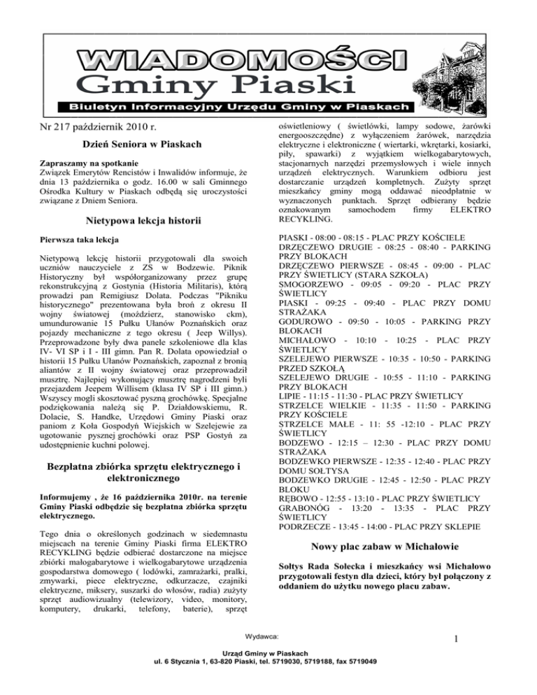 Nr 217 październik 2010 r. Dzień Seniora w Piaskach Zapraszamy na spotkanie Związek Emerytów Rencistów i Inwalidów informuje, że dnia 13 października o godz. 16.00 w sali Gminnego Ośrodka Kultury w Piaskach odbędą się uroczystości związane z Dniem Seniora. Nietypowa lekcja historii Pierwsza taka lekcja Nietypową lekcję historii przygotowali dla swoich uczniów nauczyciele z ZS w Bodzewie. Piknik Historyczny był współorganizowany przez grupę rekonstrukcyjną z Gostynia (Historia Militaris), którą prowadzi pan Remigiusz Dolata. Podczas "Pikniku historycznego" prezentowana była broń z okresu II wojny światowej (moździerz, stanowisko ckm), umundurowanie 15 Pułku Ułanów Poznańskich oraz pojazdy mechaniczne z tego okresu ( Jeep Willys). Przeprowadzone były dwa panele szkoleniowe dla klas IV- VI SP i I - III gimn. Pan R. Dolata opowiedział o historii 15 Pułku Ułanów Poznańskich, zapoznał z bronią aliantów z II wojny światowej oraz przeprowadził musztrę. Najlepiej wykonujący musztrę nagrodzeni byli przejazdem Jeepem Willisem (klasa IV SP i III gimn.) Wszyscy mogli skosztować pyszną grochówkę. Specjalne podziękowania należą się P. Działdowskiemu, R. Dolacie, S. Handke, Urzędowi Gminy Piaski oraz paniom z Koła Gospodyń Wiejskich w Szelejewie za ugotowanie pysznej grochówki oraz PSP Gostyń za udostępnienie kuchni polowej. Bezpłatna zbiórka sprzętu elektrycznego i elektronicznego Informujemy , że 16 października 2010r. na terenie Gminy Piaski odbędzie się bezpłatna zbiórka sprzętu elektrycznego. Tego dnia o określonych godzinach w siedemnastu miejscach na terenie Gminy Piaski firma ELEKTRO RECYKLING będzie odbierać dostarczone na miejsce zbiórki małogabarytowe i wielkogabarytowe urządzenia gospodarstwa domowego ( lodówki, zamrażarki, pralki, zmywarki, piece elektryczne, odkurzacze, czajniki elektryczne, miksery, suszarki do włosów, radia) zużyty sprzęt audiowizualny (telewizory, video, monitory, komputery, drukarki, telefony, baterie), sprzęt oświetleniowy ( świetlówki, lampy sodowe, żarówki energooszczędne) z wyłączeniem żarówek, narzędzia elektryczne i elektroniczne ( wiertarki, wkrętarki, kosiarki, piły, spawarki) z wyjątkiem wielkogabarytowych, stacjonarnych narzędzi przemysłowych i wiele innych urządzeń elektrycznych. Warunkiem odbioru jest dostarczanie urządzeń kompletnych. Zużyty sprzęt mieszkańcy gminy mogą oddawać nieodpłatnie w wyznaczonych punktach. Sprzęt odbierany będzie oznakowanym samochodem firmy ELEKTRO RECYKLING. PIASKI - 08:00 - 08:15 - PLAC PRZY KOŚCIELE DRZĘCZEWO DRUGIE - 08:25 - 08:40 - PARKING PRZY BLOKACH DRZĘCZEWO PIERWSZE - 08:45 - 09:00 - PLAC PRZY ŚWIETLICY (STARA SZKOŁA) SMOGORZEWO - 09:05 - 09:20 - PLAC PRZY ŚWIETLICY PIASKI - 09:25 - 09:40 - PLAC PRZY DOMU STRAŻAKA GODUROWO - 09:50 - 10:05 - PARKING PRZY BLOKACH MICHAŁOWO - 10:10 - 10:25 - PLAC PRZY ŚWIETLICY SZELEJEWO PIERWSZE - 10:35 - 10:50 - PARKING PRZED SZKOŁĄ SZELEJEWO DRUGIE - 10:55 - 11:10 - PARKING PRZY BLOKACH LIPIE - 11:15 - 11:30 - PLAC PRZY ŚWIETLICY STRZELCE WIELKIE - 11:35 - 11:50 - PARKING PRZY KOŚCIELE STRZELCE MAŁE - 11: 55 -12:10 - PLAC PRZY ŚWIETLICY BODZEWO - 12:15 – 12:30 - PLAC PRZY DOMU STRAŻAKA BODZEWKO PIERWSZE - 12:35 - 12:40 - PLAC PRZY DOMU SOŁTYSA BODZEWKO DRUGIE - 12:45 - 12:50 - PLAC PRZY BLOKU RĘBOWO - 12:55 - 13:10 - PLAC PRZY ŚWIETLICY GRABONÓG - 13:20 - 13:35 - PLAC PRZY ŚWIETLICY PODRZECZE - 13:45 - 14:00 - PLAC PRZY SKLEPIE Nowy plac zabaw w Michałowie Sołtys Rada Sołecka i mieszkańcy wsi Michałowo przygotowali festyn dla dzieci, który był połączony z oddaniem do użytku nowego placu zabaw. Wydawca: Urząd Gminy w Piaskach ul. 6 Stycznia 1, 63-820 Piaski, tel. 5719030, 5719188, fax 5719049 1 3 października Wójt Gminy Piaski - Zenon Norman, Radny Rady Gminy Piaski - Ignacy Urbaniak i Sołtys Wsi Michałowo - Henryk Janicki i dzieci dokonali uroczystego otwarcia nowego placu zabaw w Michałowie. Inwestycja została dofinansowana ze środków Programu Działaj Lokalnie VII Polsko Amerykańskiej Fundacji Wolności realizowanego przez Akademię Rozwoju Filantropii w Polsce oraz Lokalnej Organizacji Grantowej Stowarzyszenie Dziecko. W programie przygotowanym przez Sołtysa, Radę Sołecką i mieszkańców wsi Michałowo znalazły się między innymi konkursy i zabawy dla dzieci, przejażdżki bryczką. Najmłodsi mogli również zasiąść w wozie strażackim, a dla wszystkich przygotowano ciasto i poczęstunek. Koncert z okazji 20 – lecia samorządu Ostatniego dnia festiwalu Musica Sacromontana koncert muzyki Szopenowskiej poświęcono gminie Piaski W niedzielę 3 października zakończył się tegoroczny Festiwal Muzyki Oratoryjnej Musica Sacromontana. Był to szczególny dzień dla mieszkańców gminy Piaski, gdyż koncert muzyki Fryderyka Szopena w wykonaniu Janusza Olejniczaka oraz Royal String Quartet z okazji Roku Chopinowskiego dedykowany został mieszkańcom naszej gminy z okazji 20 - lecia samorządu. Około 1500 osób przybyło na ostatni koncert piatej edycji festiwalu. Na wstępie głos zabrał Wójt Gminy Piaski – Zenon Norman, który powiedział m. in. „Muzyka ma koronę w niebie, ale korzenie w ziemi” – słowami Marii Kuncewiczowej, które doskonale potwierdzają to, czego doświadczamy na Świętej Górze, chciałbym w imieniu władz samorządowych Gminy Piaski powitać Państwa i podziękować za zaproszenie na tegoroczny Festiwal Muzyki Oratoryjnej. Dzisiejszy koncert poświęcony śladom Fryderyka Szopena w Wielkopolsce z okazji Roku Szopenowskiego dedykowany został mieszkańcom Gminy Piaski w dwudziestą rocznicę samorządu. Jubileusz zawsze skłania do wspomnień, nie chciałbym jednak w tym miejscu dokonywać kolejnej rekapitulacji naszych działań. Pragnę jedynie podkreślić, że już od wielu lat nasz samorząd wspiera zarówno prace renowacyjne na Świętej Górze jaki i wszelkie inicjatywy prowadzone prz
