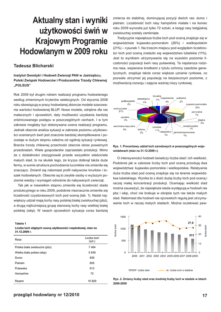 Aktualny stan i wyniki użytkowości świń w Krajowym Programie Hodowlanym w 2009 roku Tadeusz Blicharski Instytut Genetyki i Hodowli Zwierząt PAN w Jastrzębcu, Polski Związek Hodowców i Producentów Trzody Chlewnej „POLSUS” zmierza do stabilnej, dominującej pozycji dwóch ras: duroc i pietrain. Liczebność loch rasy hampshire malała i na koniec roku 2009 wynosiła już tylko 72 sztuki, a księgi rasy belgijskiej zwisłouchej zostały zamknięte. Tradycyjnie największa liczba loch pod oceną znajduje się w województwie kujawsko-pomorskim (26%) i wielkopolskim (21%) – rysunek 1. Na trzecim miejscu pod względem liczebności loch pod oceną znalazło się województwo lubelskie (11%). Jest to wynikiem utrzymywania się na wysokim poziomie liczebności populacji świń rasy puławskiej. Ta najstarsza rodzima rasa, wspierana środkami z tytułu ochrony zasobów genetycznych, znajduje także coraz większe uznanie rynkowe, co pozwala utrzymać jej populację na bezpiecznym poziomie, z możliwością rozwoju i zajęcia ważnej niszy rynkowej. Rok 2009 był drugim rokiem realizacji programu hodowlanego według zmienionych kryteriów selekcyjnych. Od stycznia 2008 roku obowiązują w pracy hodowlanej zbiorcze modele szacowania wartości hodowlanej BLUP. Nowe modele, odrębne dla ras matecznych i ojcowskich, dały możliwości uzyskania bardziej zróżnicowanego postępu w poszczególnych cechach. I w tym zakresie mogłaby być dokonywana ocena realizacji programu. Jednak obecnie analiza sytuacji w zakresie poziomu użytkowości ocenianych świń jest znacznie bardziej skomplikowana i pozostaje w dużym stopniu zależna od ogólnej sytuacji rynkowej. Branża trzody chlewnej przechodzi obecnie okres poważnych przeobrażeń. Wiele gospodarstw zaprzestało produkcji. Mimo że z działalności zrezygnowali przede wszystkim właściciele małych stad, to na skutek tego, że kryzys dotknął także duże fermy, w sumie struktura pochodzenia tuczników nie zmieniła się znacząco. Zmienił się natomiast profil nabywców knurków i loszek hodowlanych. Obecnie są to zwykle osoby o wyższym poziomie wiedzy i wymagań odnośnie do nabywanych zwierząt. Tak jak w niewielkim stopniu zmieniła się liczebność stada produkcyjnego w roku 2009, podobnie nieznacznie zmieniła się liczebność czystorasowych loch pod oceną (tab. 1). Nadal największy udział mają lochy rasy polskiej białej zwisłouchej (pbz), a drugą najliczniejszą grupę stanowią lochy rasy wielkiej białej Rys. 1. Procentowy udział loch zarodowych w poszczególnych województwach (stan na 31.12.2009 r.) O intensywności hodowli świadczy liczba stad i ich wielkość. Podobnie jak w zakresie liczby loch pod oceną przodują dwa województwa: kujawsko-pomorskie i wielkopolskie. Relatywnie duża liczba stad pod oceną znajduje się na terenie województwa lubelskiego. Wynika to z dość dużej liczby loch pod oceną i raczej małej koncentracji produkcji. Oceniając wielkość stad można zauważyć, że największe stada występują w hodowli ras pbz i wbp, choć nie brakuje w obrębie tych ras także małych stad. Natomiast dla hodowli ras ojcowskich regułą jest utrzymywanie loch w raczej małych stadach. Można oczekiwać pew- polskiej (wbp). W rasach ojcowskich sytuacja coraz bardziej Tabela 1 Liczba loch objętych oceną użytkowości rozpłodowej, stan na 31.12.2009 r. Rasa Liczba loch (szt.) Polska biała zwisłoucha (pbz) 7 464 Wielka biała polska (wbp) 5 939 Duroc 836 Pietrain 605 Puławska 913 Hampshire 72 Razem przegląd hodowlany nr 12/2010 15 829 Rys. 2. Zmiany liczby stad oraz średniej liczby loch w stadzie w latach 2000-2009 17 Tabela 2 Średnie wyniki oceny użytkowości rozpłodowej loch poszczególnych ras w okresie 1.01.-31.12.2009 r. Rasa Średnia liczba loch pod oceną (szt.) Liczba ocenianych miotów (szt.) ogółem pierwszych Liczba prosiąt żywo urodz. (szt.) Liczba prosiąt w 21. dniu (szt.) Liczba sutków lochy (szt.) Wiek pierwszego oproszenia (dni) Okres międzymiotu (dni) Wbp 6646,6 13 052 2814 11,54 10,74 14,49 347 169 Pbz 9011,6 17 306 3548 11,61 10,70 14,62 340 172 Puławska 971,2 1730 437 10,86 10,05 14,34 343 183 Duroc 961,7 1840 501 10,69 9,86 13,32 353 169 Hampshire 82,4 156 42 11,00 10,12 13,44 378 165 Pietrain 664,1 1235 328 11,04 10,35 14,09 364 178 nych zależności między wielkością stad a wynikami hodowlanygramach hodowlanych specjalnie selekcjonowane linie tej rasy mi. Jednak w większym stopniu niż koncentracja oddziałują znajdują zastosowanie jako komponenty mateczne w krzyżowaumiejętności i zaangażowanie hodowcy, poziom genetyczny niu. Świnie rasy pietrain używane są rzadziej niż duroc jako rozpłodników i status zdrowotny stada. Na rysunku 2 przedstakomponent mateczny, jednak w programach hodowlanych ukiewiono zmiany liczby stad oraz średniej liczby loch w stadzie na runkowanych na wybitną mięsność również mają zastosowanie. przestrzeni lat 2000-2009. Najlepsze wyniki użytkowości rozpłodowej nie są w specjalJak już wspomniano, zmiana modeli BLUP, stanowiących nym zakresie przypisane ani do poszczególnych województw, ważne narzędzie selekcyjne, powinna wpływać na uzyskany ani do stad o określonej liczebności loch. Należy przyjąć, mając postęp w poziomie cech i zróżnicowanie użytkowości poszczena uwadze niską odziedziczalność cech rozrodu, znaczący gólnych ras. Średnia użytkowość rozpłodowa loch ras mateczwpływ organizacji pracy w stadzie na wyniki użytkowości. Jednych utrzymuje się na poziomie, który można określić jako donocześnie zwraca uwagę, że w wielu stadach liczebność miobry, lecz nie wybitny. W porównaniu do wyników z roku 2008 nie tów w dniu urodzenia i odsadzenia jest na tyle duża, że daje uzyskano poprawy liczby prosiąt urodzonych i odsadzonych. możliwości prowadzenia intensywniejszej pracy hodowlanej w Skróceniu uległ okres międzymiotu i wiek pierwszego oproszetym zakresie. nia