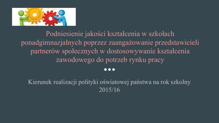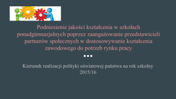 Podniesienie jakości kształcenia w szkołach ponadgimnazjalnych poprzez zaangażowanie przedstawicieli partnerów społecznych w dostosowywanie kształcenia zawodowego do potrzeb rynku pracy Kierunek realizacji polityki oświatowej państwa na rok szkolny 2015/16 Podstawa programowa kształcenia w zawodach: Kształcenie zawodowe w zawodach wpisanych do Klasyfikacji zawodów szkolnictwa zawodowego prowadzone jest w oparciu o Podstawę programową kształcenia w zawodach. Podstawa prawna Ustawa z dnia 20 lutego 2015 r. o zmianie ustawy o systemie oświaty oraz niektórych innych ustaw Rozporządzenie Ministra Edukacji Narodowej z dnia 23 grudnia 2011 r. w sprawie klasyfikacji zawodów szkolnictwa zawodowego Rozporządzenie Ministra Edukacji Narodowej z dnia 7 lutego 2012 r. w sprawie podstawy programowej kształcenia w zawodach Rozporządzenie Ministra Edukacji Narodowej z dnia 16 stycznia 2015 r.zmieniające rozporządzenie w sprawie podstawy programowej kształcenia w zawodach Nowelizacja rozporządzenia w sprawie podstawy programowej kształcenia w zawodach z dnia 10 lipca 2015 r. O co chodzi? Podniesienie jakości kształcenia w szkołach ponadgimnazjalnych jest wyzwaniem dla współczesnego szkolnictwa. Poprzez zaangażowanie szkoły i przedstawicieli środowiska lokalnego, a tym samym partnerów społecznych w dostosowywanie kształcenia zawodowego do potrzeb rynku pracy można wypracować wspólnie określone mechanizmy kształcenia, które zaowocują w przyszłości obustronnymi korzyściami. Partnerzy społeczni w kształceniu zawodowym: - stowarzyszenia zawodowe organizacje pracodawców związki zawodowe właściwe dla poszczególnych grup zawodów organizacje branżowe stowarzyszenia pracodawców izby gospodarcze, handlowe, rzemieślnicze agencje rozwoju itp. Współpraca placówek edukacyjnych z partnerami społecznymi może obejmować: ● ● ● ● projektowanie innowacyjnych programów kształcenia i treści szkoleniowych odpowiadających na potrzeby, identyfikowanie potrzeb i wypełnianie luk w zakresie umiejętności w poszczególnych branżach , zbliżanie kształcenia do potrzeb rynku pracy, upowszechnianie idei współpracy na rzecz kształcenia i szkolenia zawodowego skierowane do władz odpowiedzialnych za kształcenie i szkolenie zawodowe, przedsiębiorców oraz doradców zawodowych. Zestawienia bibliograficzne opracowane na podstawie zbiorów CDN PBP w Turku - Edukacja a rynek pracy: http://cdnkonin.pl/pbp/images/Edukacja_a_rynek_pracy% 20.pdf - Kształcenie zawodowe: http://cdnkonin.pl/pbp/images/Ksztalcenie_zawodowe%20. pdf Więcej informacji: - http://www.dialogspoleczny.pl/tabs/index/84/ Informacje na temat partnerstwa na rzecz lokalnych rynków pracy - http://www.fundusze.uj.edu.pl/documents/31275205/4f0697b0-3a87-4df9-87a94dfa31cdb00c Przegląd europejskich środków na edukację - perspektywa finansowa 2014 - 2020. M.in. priorytet inwestycyjny Kształcenie zawodowe - https://men.gov.pl/ministerstwo/informacje/ruszyl-portal-doradztwa-edukacyjnozawodowego.html Informacja MEN na temat portalu doradztwa edukacyjno-zawodowego - http://men.gov.pl/ministerstwo/informacje/wyklikaj-swoja-szkole-zawodowa.html Uruchomiona w 2015 roku mapa szkół zawodowych obejmująca cały kraj. Informacje zawierają m.in. opis projektu i sposób poruszania się po mapie - https://men.gov.pl/dodatki/mapazawodowe/ Bezpośredni link do mapy szkół zawodowych - http://www.koweziu.edu.pl/kziu-ppkwz Podstawa programowa kształcenia w zawodach - http://www.edukator.koweziu.edu.pl/dualny-system-ksztalcenia/ Informacje na temat dualnego systemu kształcenia w szkolnictwie zawodowym - https://men.gov.pl/pl/ksztalcenie-zawodowe/rok-szkoly-zawodowcow/publikacjeksztalcenie-zawodowe-i-ustawiczne Zbiór publikacji na temat kształcenia zawodowego i ustawicznego oraz doradztwa edukacyjno - zawodowego - http://www.zielonysztandar.com.pl/2013/07/ksztalceniezawodowe-odpowiada-na-potrzeby-rynku-pracy/ Wywiad z Tadeuszem Sławeckim na temat kształcenia zawodowego w odniesieniu do potrzeb rynku pracy Dostęp do każdej ze stron sprawdzono 19.10.2015 r.