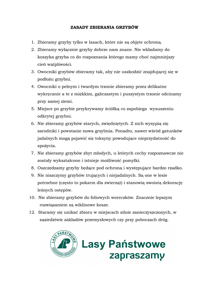 ZASADY ZBIERANIA GRZYBÓW 1. Zbieramy grzyby tylko w lasach, które nie są objęte ochroną. 2. Zbieramy wyłącznie grzyby dobrze nam znane. Nie wkładamy do koszyka grzyba co do rozpoznania którego mamy choć najmniejszy cień wątpliwości. 3. Owocniki grzybów zbieramy tak, aby nie uszkodzić znajdującej się w podłożu grzybni. 4. Owocniki o pełnym i twardym trzonie zbieramy przez delikatne wykręcanie a te z miękkim, gąbczastym i puszystym trzonie odcinamy przy samej ziemi. 5. Miejsce po grzybie przykrywamy ściółką co zapobiega wysuszeniu odkrytej grzybni. 6. Nie zbieramy grzybów starych, zwiędniętych. Z nich wysypią się zarodniki i powstanie nowa grzybnia. Ponadto, nawet wśród gatunków jadalnych mogą pojawić się toksyny powodujące nieprzydatność do spożycia. 7. Nie zbieramy grzybów zbyt młodych, u których cechy rozpoznawcze nie zostały wykształcone i istnieje możliwość pomyłki. 8. Oszczędzamy grzyby będące pod ochroną i występujące bardzo rzadko. 9. Nie niszczymy grzybów trujących i niejadalnych. Są one w lesie potrzebne (często to pokarm dla zwierząt) i stanowią swoistą dekorację leśnych ostępów. 10. Nie zbieramy grzybów do foliowych woreczków. Znacznie lepszym rozwiązaniem są wiklinowe kosze. 12. Staramy się unikać zbioru w miejscach silnie zanieczyszczonych, w sąsiedztwie zakładów przemysłowych czy przy poboczach dróg.