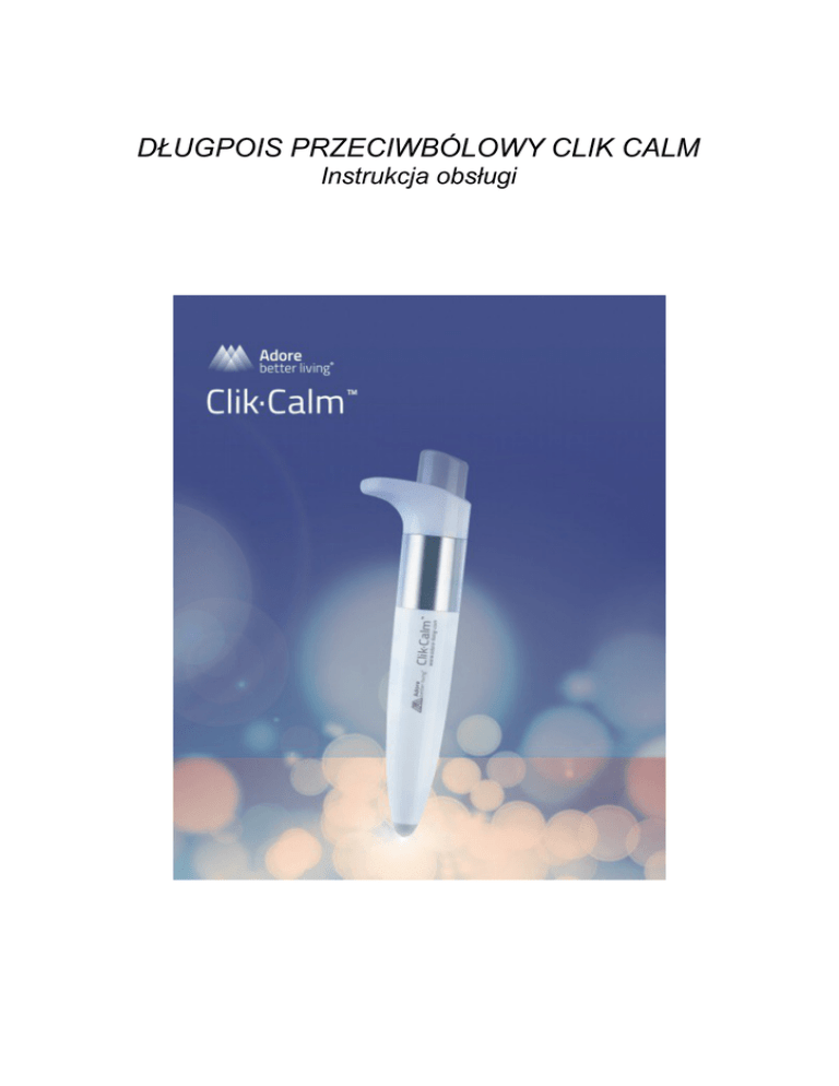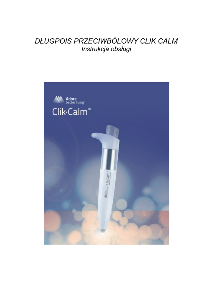 DŁUGPOIS PRZECIWBÓLOWY CLIK CALM Instrukcja obsługi Urządzenie Clik Calm pomaga złagodzić bólu, jednak nie jest to urządzenie medyczne! Sposób użycia: 1. Przytrzymać urządzenie Clik Calm w dłoni i mocno objąć palcem wskazującym metalowy pierścień znajdujący się na "długopisie". 2. Umieścić Clik Calm bezpośrednio w punkcie występowania bólu i nacisnąć przycisk od 15 do 20 razy – w tym momencie będą odczuwalne delikatne impulsy. 3. Urządzenie sprawdzać na trzech punktach akupresurowych na ciele występujących w miejscu bólu, do momentu wybrania najlepszego z nich. Uwagi: 1. Zazwyczaj uczucie ulgi w bólu przychodzi w ciągu kilku minut, jednak jest to kwestia indywidualna. 2. Powtarzać proces co 1-2 godziny, do momentu ustania bólu. 3. W przypadku stosowania urządzenia na ból głowy lub migrenę, należy wybrać akupunkt po przeciwnej stronie ciała (jeśli ból jest odczuwalny na lewej stronie wybierz akupunkt na po prawej stronie i na odwrót). 4. Urządzenie jest skutecznie w promieniu do 15 cm, może być stosowana przez cienką odzież. 5. Długopis Clik Calm jest bezpieczny, nie posiada skutków ubocznych oraz nie daje niebezpieczeństwa przedawkowania. 6. W razie wątpliwości przed rozpoczęciem użytkowania należy skonsultować się z lekarzem. 7. Urządzenie Clik Calm nie może być stosowane przez osoby z rozrusznikiem serca lub chorujących na epilepsję (padaczkę). 8. Urządzenie nie może być stosowane przez kobiety w ciąży. 9. Nie stosować urządzenia w pobliży metalowych elementów (biżuteria, zegarek, itp.). 10. Nie stosować urządzenia na otwarte rany, wilgotną skórę lub szyję (oprócz karku) i w miejscach przy sercu. 11. Nie stosować w trakcie prowadzenia pojazdu.