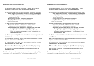 Regulamin uczestnika imprezy połowinkowej Regulamin uczestnika imprezy połowinkowej (1) Osoby przebywające na imprezie zobowiązane są zachowywać się w sposób niezagrażający bezpieczeństwu innych osób obecnych na połowinkach. (1) Osoby przebywające na imprezie zobowiązane są zachowywać się w sposób niezagrażający bezpieczeństwu innych osób obecnych na połowinkach. (2) Osobom przebywającym na połowinkach zabrania się wnoszenia na teren lokalu: broni lub innych niebezpiecznych przedmiotów (narzędzi) oraz materiałów wybuchowych, pirotechnicznych, które mogą zagrażać bezpieczeństwu osób przebywających na terenie lokalu, napojów alkoholowych, środków odurzających lub substancji psychotropowych, innych przedmiotów mogących stanowić zagrożenie, a także z nich korzystania. (2) Osobom przebywającym na połowinkach zabrania się wnoszenia na teren lokalu: broni lub innych niebezpiecznych przedmiotów (narzędzi) oraz materiałów wybuchowych, pirotechnicznych, które mogą zagrażać bezpieczeństwu osób przebywających na terenie lokalu, napojów alkoholowych, środków odurzających lub substancji psychotropowych, innych przedmiotów mogących stanowić zagrożenie, a także z nich korzystania. (3) Służby porządkowe imprezy, pracownicy ochrony uprawnieni są do: sprawdzania uprawnień do przebywania na terenie połowinek, legitymowania osób w celu ustalenia ich tożsamości, przeglądania zawartości bagażu, odzieży osób w przypadku podejrzenia, że osoby te wnoszą wymienione w punkcie 2 przedmioty, w przypadku stwierdzenia braku uprawnień osób do przebywania na terenie połowinek albo zakłócania przez te osoby porządku, wezwania ich do opuszczenia lokalu. (3) Służby porządkowe imprezy, pracownicy ochrony uprawnieni są do: sprawdzania uprawnień do przebywania na terenie połowinek, legitymowania osób w celu ustalenia ich tożsamości, przeglądania zawartości bagażu, odzieży osób w przypadku podejrzenia, że osoby te wnoszą wymienione w punkcie 2 przedmioty, w przypadku stwierdzenia braku uprawnień osób do przebywania na terenie połowinek albo zakłócania przez te osoby porządku, wezwania ich do opuszczenia lokalu. (4) W razie spowodowania jakichkolwiek zniszczeń przez uczestnika odpowiedzialność ponosi sprawca. (4) W razie spowodowania jakichkolwiek zniszczeń przez uczestnika odpowiedzialność ponosi sprawca. (5) Uczestnik może być narażony na ciągłe przebywanie w strefie natężenia dźwięków mogących spowodować uszkodzenie słuchu. (5) Uczestnik może być narażony na ciągłe przebywanie w strefie natężenia dźwięków mogących spowodować uszkodzenie słuchu. (6) Uczestnik imprezy zobowiązany jest do zachowania kultury osobistej względem innych uczestników, jak i obsługi lokalu. (6) Uczestnik imprezy zobowiązany jest do zachowania kultury osobistej względem innych uczestników, jak i obsługi lokalu. (7) Na połowinkach obowiązuje strój elegancki, odpowiedni do tego typu imprezy. (7) Na połowinkach obowiązuje strój elegancki, odpowiedni do tego typu imprezy. (8) Po wejściu na teren imprezy uczestnik do końca swego uczestnictwa nie ma prawa opuścić lokalu. (8) Po wejściu na teren imprezy uczestnik do końca swego uczestnictwa nie ma prawa opuścić lokalu. Oświadczam, że zapoznałem/am się z powyższym regulaminem, zobowiązuję się do jego przestrzegania i biorę odpowiedzialność za nieprzestrzeganie jego postanowień. Oświadczam, że zapoznałem/am się z powyższym regulaminem, zobowiązuję się do jego przestrzegania i biorę odpowiedzialność za nieprzestrzeganie jego postanowień. ............................................................. (Data i podpis uczestnika) ............................................................. (Data i podpis uczestnika)