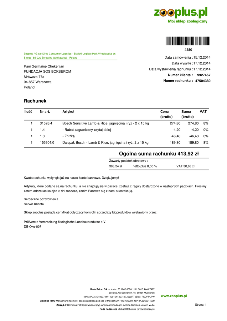 *47504380* 4380 Zooplus AG c/o Dirks Consumer Logistics - Skalski-Logistic Park Wroclawska 36 Data zamówienia : 15.12.2014 Street - 55-020 Zorawina (Wojkowice) - Poland Data wysyłki : 17.12.2014 Pani Germaine Chekerjian Data wystawienia rachunku : 17.12.2014 FUNDACJA SOS BOKSEROM Numer klienta : Mrówcza 77a 9927457 Numer rachunku : 47504380 04-857 Warszawa Poland Rachunek Ilość Nr art. Artykuł 1 31526.4 Bosch Sensitive Lamb & Rice, jagnięcina i ryż - 2 x 15 kg 1 1.4 - Rabat zagraniczny czytaj dalej 1 1.3 1 155604.0 Cena Suma (brutto) (brutto) VAT 274,80 274,80 8% -4,20 -4,20 0% - Zniżka -46,48 -46,48 0% Dwupak Bosch - Lamb & Rice, jagnięcina i ryż, 2 x 15 kg 189,80 189,80 8% Ogólna suma rachunku 413,92 zł Zawarty podatek obrotowy : 383,24 zł netto plus 8,00 % VAT 30,68 zł Kwota rachunku wpłynęła już na nasze konto bankowe. Dziękujemy! Artykuły, które podane są na rachunku, a nie znajdują się w paczce, zostają z reguły dostarczone w następnych paczkach. Prosimy zatem odczekać kolejne 2 dni robocze, zanim Państwo się z nami skontaktują. Serdeczne pozdrowienia Serwis Klienta Sklep zooplus posiada certyfikat dotyczacy kontroli i sprzedazy bioproduktów wystawiony przez: Prüfverein Verarbeitung ökologische Landbauprodukte e.V. DE-Öko-007 Bank Pekao SA Nr konta: 75 1240 6074 1111 0010 4440 7497 zooplus AG Sonnenstr. 15, 80331 Muenchen IBAN: PL75124060741111001044407497, SWIFT (BIC): PKOPPLPW www.zooplus.pl Siedziba firmy Monachium (Niemcy), zooplus podlega pod sąd w Monachium HRB 125080, NIP: PL5263041909 Zarząd dr Cornelius Patt (przewodniczący), Andreas Grandinger, Andrea Skersies, Jürgen Vedie Rada nadzorcza Michael Rohowski (przewodniczący) Strona 1 Państwa numer zwrotu Formularz zwrotu Rachunek 47504380 Paczkę odesłać na adres : Zooplus AG c/o Dirks Consumer Logistics !! Prosimy koniecznie wcześniej zażądać od Skalski-Logistic Park Wroclawska 36 Street serwisu klienta! !! 55-020 Zorawina (Wojkowice) www.zooplus.pl/contact Poland Kiedy i jak mogę odesłać produkty? Informacje ogólne Możesz w ciągu 14 dni od otrzymania produktów odesłać wszystkie zakupione artykuły. Szczegółowe informacje na temat prawa odstąpienia od umowy oraz wyłączenia prawa do odstąpienia od umowy znajdziesz w naszym regulaminie : (www.zooplus.pl/content/terms). Aby skorzystać z prawa odstąpienia od umowy należy powiadomić nas o tym fakcie przed upływem okresu karencji. Prosimy w tej sprawie skontaktować się z naszym serwisem klienta. Prosimy odesłać produkty odpowiednio ofrankowane. Koszty przesyłki zostaną niezwłocznie zwrócone, pod warunkiem, że odwołanie zostało skutecznie dostarczone w wymaganym czasie. Zwrot kosztów nastąpi zgodnie z taryfą naszych partnerów: Poczty Polskiej oraz GLS. Koszty dodatkowe, jak np. dodatek expresowy lub dodatek za artykuły nieporęczne, nie mogą zostać zwrócone. W przypadku artykułów nieporęcznych, mających duże rozmiary w stosunku do wagi, oferujemy odbiór tych produktów bezpośrednio u Ciebie w domu. W tej sprawie prosimy o kontakt z serwisem klienta. Zanim odeślesz artykuły, prosimy skontaktować się z naszym serwisem klienta. Prosimy podać numer artykułu, który Krok 1: chcesz odesłać. W zamian otrzymasz od nas indywidualny numer zwrotu. Tylko ten numer gwarantuje prawidłowe przyporządkowanie do Twojego konta klienta. internet : www.zooplus.pl/contact Krok 2: Nasz Serwis Klienta odpowie na wszelkie pytania i pomoże wypełnić formularz. Krok 3: Prosimy włożyć dokument zwrotu łącznie z numerem do odpowiednio ofrankowanej paczki i odesłać na adres: Zooplus AG c/o Dirks Consumer Logistics, Skalski-Logistic Park Wroclawska 36 Street , 55-020 Zorawina (Wojkowice) , Poland Prosimy zaznaczyć, który artykuł/które artykuły chcą Państwo zwrócić i jaki jest powód zwrotu. Numer artykułu Ilość Artykuł nie Pomyłka przy Nieprawidłowy artykuł Zepsuty Artykuł pasuje zamawianiu dostarczony artykuł niekompletny Inne Co możemy dla Państwa zrobić, po tym jak otrzymaliśmy odesłany przez Państwa artykuł? Proszę o przesłanie mi następujących artykułów: Numer artykułu : ___________________ Ilość :___________________ Proszę zwrócić uwagę, że przelew zwrotny może być dokonany tylko i wyłącznie na to konto, z którego otrzymaliśmy płatność za zamówienie. Proszę pomniejszyć sumę rachunku o kwotę ____________________ zł Bank Pekao SA Nr konta: 75 1240 6074 1111 0010 4440 7497 zooplus AG Sonnenstr. 15, 80331 Muenchen IBAN: PL75124060741111001044407497, SWIFT (BIC): PKOPPLPW www.zooplus.pl Siedziba firmy Monachium (Niemcy), zooplus podlega pod sąd w Monachium HRB 125080, NIP: PL5263041909 Zarząd dr Cornelius Patt (przewodniczący), Andreas Grandinger, Andrea Skersies, Jürgen Vedie Rada nadzorcza Michael Rohowski (przewodniczący) Strona 2