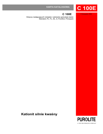 KARTA KATALOGOWA C 100E C 100E 8 listopada 2002 Dotyczy następujących rodzajów i zakresów granulacji ziaren Standard, PL, FL, DL, S, Purofine i Puropack Kationit silnie kwaśny © 1998 THE PUROLITE COMPANY C 100E Dane techniczne OPIS PRODUKTU Purolite C 100E jest konwencjonalną żelową, polistyrenową, sulfonianową żywicą kationowymienną o dużej pojemności, w postaci kulek, mającą zastosowanie w domowych i przemysłowych urządzeniach do zmiękczania wody. Ze względu na stosowany w produkcji dodatkowy proces oczyszczania może być używana w instalacjach zmiękczania wody pitnej (lub mającej kontakt z żywnością). Usuwa jony powodujące twardość, np. wapń i magnez, zastępując je jonami sodu. Gdy złoże ulega wyczerpaniu i jony powodujące twardość przedostają się do wycieku, pojemność odnawia się poprzez regenerację roztworem soli kamiennej. Osiągnięta pojemność zależy w dużej mierze od ilości soli użytej do regeneracji. Purolite C 100E spełnia wymagania U.S. Food and Drugs Code of Federal Regulations (Sekcja 21, § 173.25) oraz wymagania krajów członkowskich Unii Europejskiej. Tabela 1 – Typowe właściwości fizyczne i chemiczne Struktura polimeru Polistyren żelowy sieciowany diwinylobenzenem Grupy funkcyjne R-SO3- Forma fizyczna Sferyczne przezroczyste ziarna Forma jonowa (przy wysyłce) Na+ Gęstość nasypowa ok. 850 g/l Zakres wielkości cząstek +1,2 mm < 5%, -0,3 mm < 1% Retencja wilgoci 46-50% Pęcznienie maksymalne, Na+→H+ maks. 5% Ciężar właściwy 1,27 + Całkowita pojemność wymienna, postać Na min. 1,9 val/l mokra, objętościowo min. 4,5 val/kg sucha, wagowo Maksymalna temperatura pracy 150°C Zakres pH 0-14 (trwałość) 6-10 (praca) Tabela 2 – Standardowe warunki pracy (współprądowe zmiękczanie wody) Operacja Szybkość Roztwór Czas, min Ilość Woda surowa - - Woda surowa 5-20 1,5-4 OZ Eksploatacja 8-40 OZ/h* Płukanie wsteczne 7-12 m/h Regeneracja 2-7 OZ/h 8-20% NaCl 30-60 60-320 g/l Płukanie (wolne) 2-7 OZ/h Woda surowa ok. 30 2-4 OZ Płukanie (szybkie) 8-40 OZ/h Woda surowa ok. 30 3-10 OZ (5°-20°C) Ekspansja złoża przy płukaniu wstecznym 50-75% Wolna przestrzeń nad złożem 100% *OZ=Objętość złoża 2 WŁASNOŚCI EKSPLOATACYJNE Wyniki eksploatacyjne Purolite C 100E w cyklu sodowym są funkcją: a) Ilości i stężenia czynnika regenerującego, b) Całkowitej twardości wody i zawartości sodu. c) Szybkości przepływu medium przez złoże. Wynik na ogół określa się w postaci resztkowej twardości w uzdatnionej wodzie (tradycyjnie określanych jako ppm CaC03, gdzie 1 ppm CaC03 odpowiada stężeniu kationów dwuwartościowych równemu 0,02 mval/I. Dla zmiękczania wody pitnej wymagane są niskie poziomy regeneracji i duża efektywność usuwania twardości ponieważ odpowiednia jakość wody na ogół otrzymuje się przez dwustrumieniową operację, w której w pełni zmiękczony strumień jest mieszany z surowa woda, aby dać produkt końcowy. W zastosowaniach przemysłowych odpowiednia woda o twardości mniejszej od 5 ppm jest otrzymywana przy ilości 70-80 kg soli na metr sześcienny żywicy. Gdy zmiękczanie przeprowadza się w celu zasilania tradycyjnych niskociśnieniowych kotłów, to wymagania są mniejsze od 1 ppm i wymagana będzie co najmniej podwójna ilość czynnika regenerującego. Poślizg twardości w standardowych warunkach pracy jest na ogół mniejszy od 1 całkowitej twardości wody surowej a pojemności robocze pozostają niezmienne, gdy surowa woda zawiera mniej niż 25 % wymienianych kationów w postaci jonów sodu (lub innych jednowartościowych). W zwykłym domowym zmiękczaniu twardość resztkowa przy tak niskich poziomach na ogół nie jest wymagana i można zastosować stosunkowo wysokie szybkości przepływu przy pomijalnym wpływie na pojemność roboczą. Należy jednak pamiętać, że najbardziej efektywne użycie czynnika regenerującego można osiągnąć przez stosowanie dużych stężeń soli i odpowiednio długie czasy kontaktu. Dalsze rugowanie zużytego czynnika regenerującego ze złoża powinno również być powolne, natomiast ostateczne usunięcie nadmiaru soli powinno być wykonane przy normalnych operacyjnych szybkościach przepływu. Zarówno pojemność robocza jak i średnie przecieki twardości podczas przebiegu można obliczyć dla szerokiego zakresu warunków z danych podanych na Rys. 3 do 6. TRWAŁOŚĆ CHEMICZNA I TERMICZNA Purolite C 100E jest nierozpuszczalny w rozcieńczonych lub średnio stężonych kwasach, zasadach i we wszystkich typowych rozpuszczalnikach. Jednak poddanie działaniu znacznych ilości wolnego chloru, jonów "podchlorynowych" lub innych silnych utleniaczy przez długie okresy czasu zniszczy wiązania sieciujące. Zwiększy to retencję wilgoci przez żywicę, zmniejszy mechaniczną wytrzymałość jak i wygeneruje małe ilości ekstrahowalnych produktów rozpadu. Tak jak w przypadku tradycyjnych sulfonowanych żywic polistyrenowych, jest termicznie stabilna w temperaturach przekraczających 150°C w formie alkalicznej (np. sodowej) lub w formie z jonami ziem alkalicznych (wapń i magnez). Forma wolnego kwasu ma tendencje do ulegania hydrolizie w wodzie w temperaturach wyraźnie wyższych od 120°C, w wyniku czego maleje pojemność, w miarę jak grupy funkcyjne są stopniowo zastępowane grupami hydroksylowymi. CHARAKTERYSTYKA HYDRAULICZNA Spadek ciśnienia przez prawidłowo przesortowane złoże żywicy jonowymiennej zależy od rozkładu wielkości cząstek, głębokości złoża i objętości międzyziarnowej wymieniacza, a także od szybkości przepływu i lepkości (a zatem i temperatury) wody. Czynniki wpływające na którekolwiek z tych parametrów, np. obecność cząstek stałych filtrowanych przez złoże, nietypowa ściśliwość żywicy lub niedokończone sortowanie złoża, będą miały niesprzyjający wpływ i w rezultacie spowoduje większy spadek ciśnienia. Typowe wartości spadków ciśnienia przez z