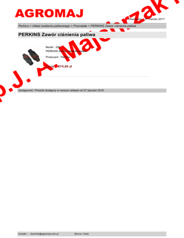 i k a z r h Utworzono : 07 marzec 2017 c j a Perkins > Układ zasilania paliwowego > Pozostałe > PERKINS Zawór ciśnienia paliwa PERKINS Zawór ciśnienia paliwa M . Model : 259 PERKINS Zawór ciśnienia paliwa Producent : Perkins A . Cena : 674,80 zł J . p Dostępność: Produkt dostępny w naszym sklepie od 27 styczeń 2016 kontakt : - [email protected] Strona 1/{nb}