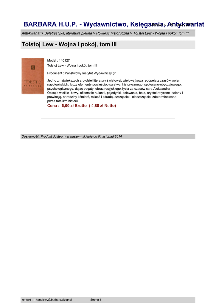 Utworzono Antykwariat : 07 marzec 2017 BARBARA H.U.P. - Wydawnictwo, Księgarnia, Antykwariat > Beletrystyka, literatura piękna > Powieść historyczna > Tołstoj Lew - Wojna i pokój, tom III Tołstoj Lew - Wojna i pokój, tom III Model : 140127 Tołstoj Lew - Wojna i pokój, tom III Producent : Państwowy Instytut Wydawniczy (P Jedno z największych arcydzieł literatury światowej, wielowątkowa epopeja z czasów wojen napoleońskich. łączy elementy powieściopisarstwa historycznego, społeczno-obyczajowego, psychologicznego, dając bogaty obraz rosyjskiego życia za czasów cara Aleksandra I. Opisuje wielkie bitwy, oficerskie hulanki, pojedynki, polowania, bale, arystokratyczne salony i prowincję, narodziny i śmierć, miłość i zdradę, szczęście i nieszczęście, zdeterminowane przez fatalizm historii. Cena : 6,00 zł Brutto ( 4,88 zł Netto) Dostępność: Produkt dostępny w naszym sklepie od 01 listopad 2014 kontakt : - [email protected] Strona 1
