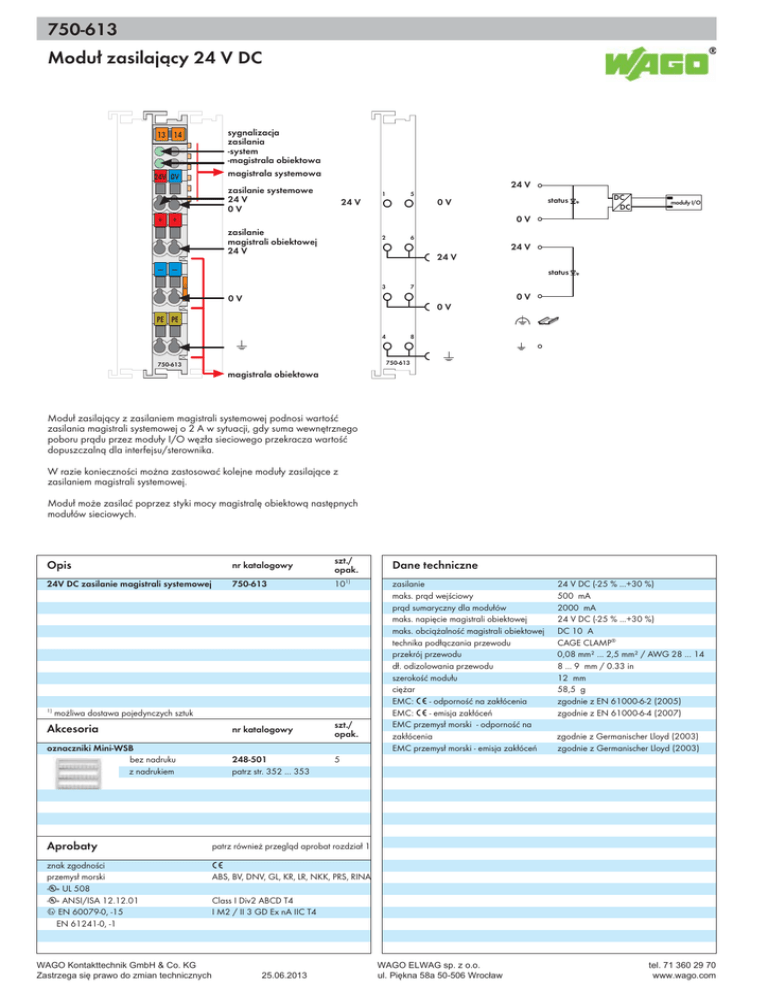 750-613 1 Moduł zasilający 24 V DC 334 13 14 A C B D 24V 0V sygnalizacja zasilania -system -magistrala obiektowa magistrala systemowa 24 V zasilanie systemowe 24 V 0V + 24 V status 0V DC DC moduły I/O 0V + zasilanie magistrali obiektowej 24 V — 5 1 6 2 24 V 24 V — status 7 3 0V 0V 0V PE PE 8 4 750-613 750-613 magistrala obiektowa Moduł zasilający z zasilaniem magistrali systemowej podnosi wartość zasilania magistrali systemowej o 2 A w sytuacji, gdy suma wewnętrznego poboru prądu przez moduły I/O węzła sieciowego przekracza wartość dopuszczalną dla interfejsu/sterownika. W razie konieczności można zastosować kolejne moduły zasilające z zasilaniem magistrali systemowej. Moduł może zasilać poprzez styki mocy magistralę obiektową następnych modułów sieciowych. Opis 24V DC zasilanie magistrali systemowej nr katalogowy szt./ opak. 1) 750-613 10 Akcesoria nr katalogowy szt./ opak. oznaczniki Mini-WSB bez nadruku z nadrukiem 248-501 patrz str. 352 ... 353 1) możliwa dostawa pojedynczych sztuk Dane techniczne zasilanie maks. prąd wejściowy prąd sumaryczny dla modułów maks. napięcie magistrali obiektowej maks. obciążalność magistrali obiektowej technika podłączania przewodu przekrój przewodu dł. odizolowania przewodu szerokość modułu ciężar EMC: 1 - odporność na zakłócenia EMC: 1 - emisja zakłóceń EMC przemysł morski - odporność na zakłócenia EMC przemysł morski - emisja zakłóceń 24 V DC (-25 % ...+30 %) 500 mA 2000 mA 24 V DC (-25 % ...+30 %) DC 10 A CAGE CLAMP® 0,08 mm² ... 2,5 mm² / AWG 28 ... 14 8 ... 9 mm / 0.33 in 12 mm 58,5 g zgodnie z EN 61000-6-2 (2005) zgodnie z EN 61000-6-4 (2007) zgodnie z Germanischer Lloyd (2003) zgodnie z Germanischer Lloyd (2003) 5 Aprobaty patrz również przegląd aprobat rozdział 1 znak zgodności przemysł morski r UL 508 r ANSI/ISA 12.12.01 4 EN 60079-0, -15 EN 61241-0, -1 1 ABS, BV, DNV, GL, KR, LR, NKK, PRS, RINA Class I Div2 ABCD T4 I M2 / II 3 GD Ex nA IIC T4 :$*2.RQWDNWWHFKQLN*PE+&R.* :$*2(/:$*VS]RR =DVWU]HJDVLĊSUDZRGR]PLDQWHFKQLF]Q\FK XO3LĊNQDD:URFáDZ WHO ZZZZDJRFRP
