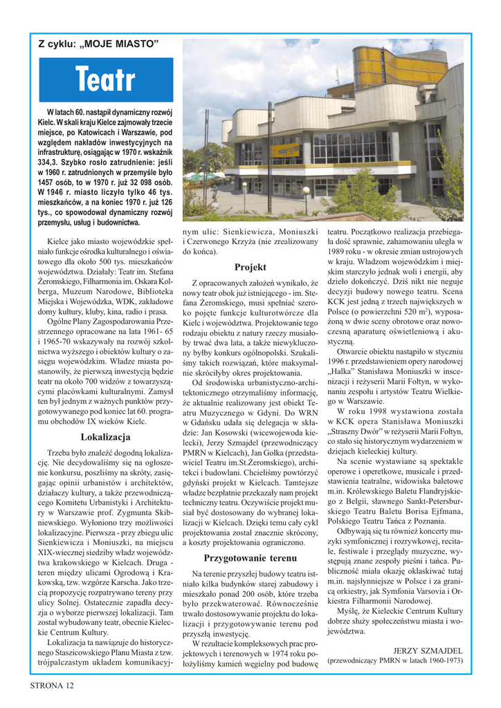 Z cyklu: MOJE MIASTO Teatr W latach 60. nast¹pi³ dynamiczny rozwój Kielc. W skali kraju Kielce zajmowa³y trzecie miejsce, po Katowicach i Warszawie, pod wzglêdem nak³adów inwestycyjnych na infrastrukturê, osi¹gaj¹c w 1970 r. wskanik 334,3. Szybko ros³o zatrudnienie: jeli w 1960 r. zatrudnionych w przemyle by³o 1457 osób, to w 1970 r. ju¿ 32 098 osób. W 1946 r. miasto liczy³o tylko 46 tys. mieszkañców, a na koniec 1970 r. ju¿ 126 tys., co spowodowa³ dynamiczny rozwój przemys³u, us³ug i budownictwa. Kielce jako miasto wojewódzkie spe³nia³o funkcje orodka kulturalnego i owiatowego dla oko³o 500 tys. mieszkañców województwa. Dzia³a³y: Teatr im. Stefana ¯eromskiego, Filharmonia im. Oskara Kolberga, Muzeum Narodowe, Biblioteka Miejska i Wojewódzka, WDK, zak³adowe domy kultury, kluby, kina, radio i prasa. Ogólne Plany Zagospodarowania Przestrzennego opracowane na lata 1961- 65 i 1965-70 wskazywa³y na rozwój szkolnictwa wy¿szego i obiektów kultury o zasiêgu wojewódzkim. W³adze miasta postanowi³y, ¿e pierwsz¹ inwestycj¹ bêdzie teatr na oko³o 700 widzów z towarzysz¹cymi placówkami kulturalnymi. Zamys³ ten by³ jednym z wa¿nych punktów przygotowywanego pod koniec lat 60. programu obchodów IX wieków Kielc. Lokalizacja Trzeba by³o znaleæ dogodn¹ lokalizacjê. Nie decydowalimy siê na og³oszenie konkursu, poszlimy na skróty, zasiêgaj¹c opinii urbanistów i architektów, dzia³aczy kultury, a tak¿e przewodnicz¹cego Komitetu Urbanistyki i Architektury w Warszawie prof. Zygmunta Skibniewskiego. Wy³oniono trzy mo¿liwoci lokalizacyjne. Pierwsza - przy zbiegu ulic Sienkiewicza i Moniuszki, na miejscu XIX-wiecznej siedziby w³adz województwa krakowskiego w Kielcach. Druga teren miêdzy ulicami Ogrodow¹ i Krakowsk¹, tzw. wzgórze Karscha. Jako trzeci¹ propozycjê rozpatrywano tereny przy ulicy Solnej. Ostatecznie zapad³a decyzja o wyborze pierwszej lokalizacji. Tam zosta³ wybudowany teatr, obecnie Kieleckie Centrum Kultury. Lokalizacja ta nawi¹zuje do historycznego Staszicowskiego Planu Miasta z tzw. trójpalczastym uk³adem komunikacyjSTRONA 12 nym ulic: Sienkiewicza, Moniuszki i Czerwonego Krzy¿a (nie zrealizowany do koñca). Projekt Z opracowanych za³o¿eñ wynika³o, ¿e nowy teatr obok ju¿ istniej¹cego - im. Stefana ¯eromskiego, musi spe³niaæ szeroko pojête funkcje kulturotwórcze dla Kielc i województwa. Projektowanie tego rodzaju obiektu z natury rzeczy musia³oby trwaæ dwa lata, a tak¿e niewykluczony by³by konkurs ogólnopolski. Szukalimy takich rozwi¹zañ, które maksymalnie skróci³yby okres projektowania. Od rodowiska urbanistyczno-architektonicznego otrzymalimy informacjê, ¿e aktualnie realizowany jest obiekt Teatru Muzycznego w Gdyni. Do WRN w Gdañsku uda³a siê delegacja w sk³adzie: Jan Kosowski (wicewojewoda kielecki), Jerzy Szmajdel (przewodnicz¹cy PMRN w Kielcach), Jan Golka (przedstawiciel Teatru im.St.¯eromskiego), architekci i budowlani. Chcielimy powtórzyæ gdyñski projekt w Kielcach. Tamtejsze w³adze bezp³atnie przekaza³y nam projekt techniczny teatru. Oczywicie projekt musia³ byæ dostosowany do wybranej lokalizacji w Kielcach. Dziêki temu ca³y cykl projektowania zosta³ znacznie skrócony, a koszty projektowania ograniczono. Przygotowanie terenu Na terenie przysz³ej budowy teatru istnia³o kilka budynków starej zabudowy i mieszka³o ponad 200 osób, które trzeba by³o przekwaterowaæ. Równoczenie trwa³o dostosowywanie projektu do lokalizacji i przygotowywanie terenu pod przysz³¹ inwestycjê. W rezultacie kompleksowych prac projektowych i terenowych w 1974 roku po³o¿ylimy kamieñ wêgielny pod budowê teatru. Pocz¹tkowo realizacja przebiega³a doæ sprawnie, zahamowaniu uleg³a w 1989 roku - w okresie zmian ustrojowych w kraju. W³adzom wojewódzkim i miejskim starczy³o jednak woli i energii, aby dzie³o dokoñczyæ. Dzi nikt nie neguje decyzji budowy nowego teatru. Scena KCK jest jedn¹ z trzech najwiêkszych w Polsce (o powierzchni 520 m2), wyposa¿on¹ w dwie sceny obrotowe oraz nowoczesn¹ aparaturê owietleniow¹ i akustyczn¹. Otwarcie obiektu nast¹pi³o w styczniu 1996 r. przedstawieniem opery narodowej Halka Stanis³awa Moniuszki w inscenizacji i re¿yserii Marii Fo³tyn, w wykonaniu zespo³u i artystów Teatru Wielkiego w Warszawie. W roku 1998 wystawiona zosta³a w KCK opera Stanis³awa Moniuszki Straszny Dwór w re¿yserii Marii Fo³tyn, co sta³o siê historycznym wydarzeniem w dziejach kieleckiej kultury. Na scenie wystawiane s¹ spektakle operowe i operetkowe, musicale i przedstawienia teatralne, widowiska baletowe m.in. Królewskiego Baletu Flandryjskiego z Belgii, s³awnego Sankt-Petersburskiego Teatru Baletu Borisa Ejfmana, Polskiego Teatru Tañca z Poznania. Odbywaj¹ siê tu równie¿ koncerty muzyki symfonicznej i rozrywkowej, recitale, festiwale i przegl¹dy muzyczne, wystêpuj¹ znane zespo³y pieni i tañca. Publicznoæ mia³a okazjê oklaskiwaæ tutaj m.in. najs³ynniejsze w Polsce i za granic¹ orkiestry, jak Symfonia Varsovia i Orkiestra Filharmonii Narodowej. Mylê, ¿e Kieleckie Centrum Kultury dobrze s³u¿y spo³eczeñstwu miasta i województwa. JERZY SZMAJDEL (przewodnicz¹cy PMRN w latach 1960-1973)