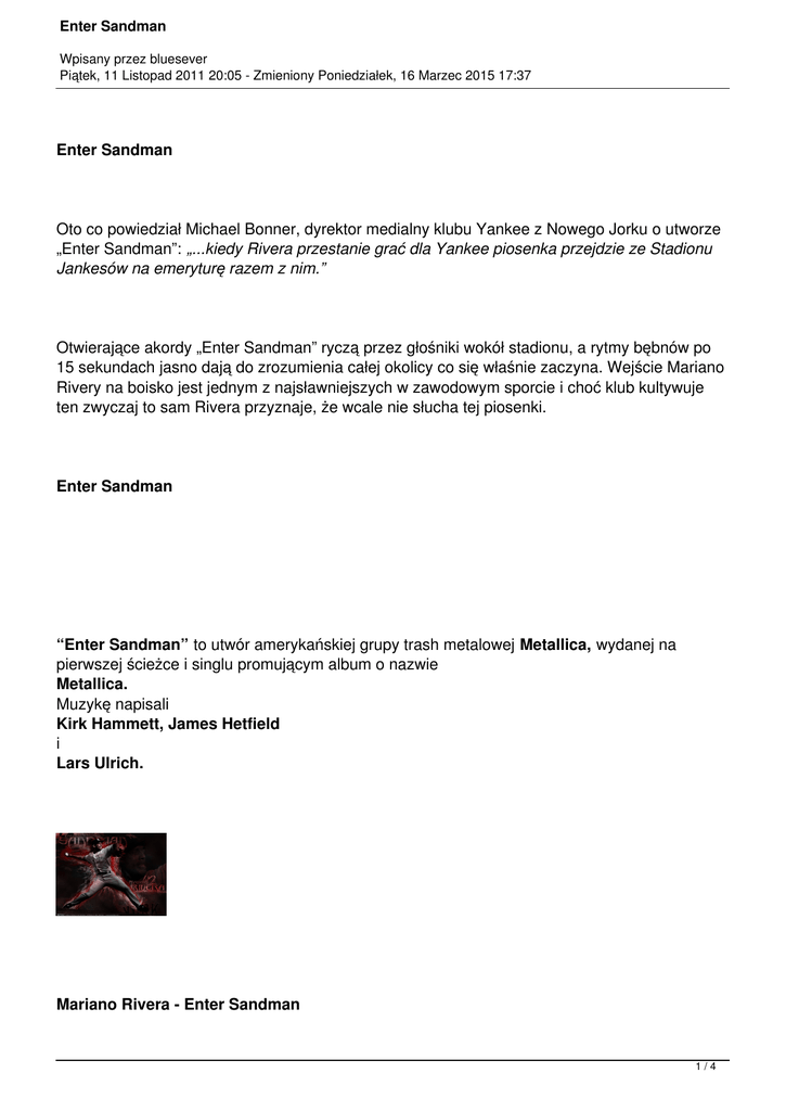 Enter Sandman Wpisany przez bluesever Piątek, 11 Listopad 2011 20:05 - Zmieniony Poniedziałek, 16 Marzec 2015 17:37 Enter Sandman Oto co powiedział Michael Bonner, dyrektor medialny klubu Yankee z Nowego Jorku o utworze „Enter Sandman”: „...kiedy Rivera przestanie grać dla Yankee piosenka przejdzie ze Stadionu Jankesów na emeryturę razem z nim.” Otwierające akordy „Enter Sandman” ryczą przez głośniki wokół stadionu, a rytmy bębnów po 15 sekundach jasno dają do zrozumienia całej okolicy co się właśnie zaczyna. Wejście Mariano Rivery na boisko jest jednym z najsławniejszych w zawodowym sporcie i choć klub kultywuje ten zwyczaj to sam Rivera przyznaje, że wcale nie słucha tej piosenki. Enter Sandman “Enter Sandman” to utwór amerykańskiej grupy trash metalowej Metallica, wydanej na pierwszej ścieżce i singlu promującym album o nazwie Metallica. Muzykę napisali Kirk Hammett, James Hetfield i Lars Ulrich. Mariano Rivera - Enter Sandman 1/4 Enter Sandman Wpisany przez bluesever Piątek, 11 Listopad 2011 20:05 - Zmieniony Poniedziałek, 16 Marzec 2015 17:37 Kirk Hammett, gitarzysta zespołu, w wywiadzie dla magazynu Rolling Stone tak opisał powstanie pamiętnego początkowego riffu: „Soundgarden właśnie wydali swój album. Cały czas próbowałem znaleźć klimat ich wielkich, ciężkich riffów.Gdzieś około drugiej nad ranem nagrałem coś na taśmie i nie myślałem już o tym. Gdy Lars Ulrich(perkusista) usłyszał te moje próby powiedział: ’To jest świetne. Tylko powtórz pierwszą część czterokrotnie.’ To była akuratna sugestia, która sprawiła, że riff nabrał mocy.” KirK Hammett Według inżyniera Randy Stauba ścieżka bębnów składała się z 50 ujęć ponieważ Lars Ulrich nagrywał każdą sekcję osobno w zależności od dynamiki i intensywności poszczególnych fragmentów piosenki. Podobno używano 40 – 50 mikrofonów w różnych kombinacjach dla nagrania bębnów i gitar by uzyskać dźwięk symulujący występ na żywo. 2/4 Enter Sandman Wpisany przez bluesever Piątek, 11 Listopad 2011 20:05 - Zmieniony Poniedziałek, 16 Marzec 2015 17:37 Lars Ulrich Hammett dla angielskiego magazynu Kerrang! opowiadał o gitarowym solo: „Wielu ludzi prawdopodobnie słyszy jedną buczącą nutę, ale poza tym ta piosenka jest szalenie popularna a ja myślę, że to solo jest niesamowite z własnego tytułu. Jest dopasowane idealnie i dodaje innego wymiaru do melodii”. Metallica Instrumentalna warstwa piosenki została ukończona dosyć szybko. Za to James Hetfield miał przez dłuższy czas kłopot z dopasowaniem słów do melodii wokalisty. Utwór ten był wśród tych, których tekst powstał na końcu. Ostateczny tekst nie był tym oryginalnym. Hetfield czuł, że słowa „Enter Sandman” brzmią „zbyt chwytliwie i komercyjnie” i w celu przeciwwagi dla melodii zmienił słowa na „...o zniszczeniu rodziny, o wielkim i strasznym sekrecie rodzinnym” z nawiązaniem do śmierci dziecka. 3/4 Enter Sandman Wpisany przez bluesever Piątek, 11 Listopad 2011 20:05 - Zmieniony Poniedziałek, 16 Marzec 2015 17:37 Hetfield James Po raz pierwszy lepszego tekstu. Lars Tym Ulrich niemniej i producent Ulrich rzekł, Bobże Rock songpowiedzieli ten był „fundamentem, Hetfieldowi, że spodziewali się płyty” przewodnikiem całej jeszcze tekstu. nawet wtedy gdy nie miał Enter Sandman Wers "Take my hand, we're off wake to Land" Piotrusiu to Sandman Panie (baśniowy ,wersję w której to Piotruś dziadek) Pan żyje wbefore magicznym wNever Never świecie Land, Neverland. mało się do przyjemnym opowieści tejme piosence miejscu. o to W 5:23 utworu Hetfield ipiaskowy Bob Rock odtwarzają starą dziecięcą modlitwę: sleep, Ibardzo pray the Lord, my soul tonight, keep, ifżyje INever die Izupełnie wake, Iodwołuje pray the "Now my IW lay soul to down take." Jest nagrywał torefrenu swoją cyniczne „Enter wykonanie Sandman” modlitwy wykorzystał dziecka, które powierza inną modlitwę: sięLord Bogu. Gdy Pat Boone „"Guard me, angels, through the me inNever God's holy light". Metallica Singel Album krajach. pozwoliło promujący Metallica Sprzedaż towuzyskał określić zadebiutował wyszedł osiągnęła „Enter 29 Sandman” w lipca jako całym 1991 nr 1Ameryce świecie jako na roku, liście dwa Bilboard tygodnie 22 miliony 200 przed w płyt. USA ukazaniem Według iw dziewięciu się albumu. innych True rockowych historii”. „jedną z16, najbardziej rozpoznawalnych piosenek Rockową Sam 30 poza września singel nominacjami w 34 1991 edycji został całego na nagród liście złotą albumu, Bilboard Grammy, płytą piosenka w 100 ale miejsce przegrała taponad była za sprzedaż nominowana zzaś w Soul ponad Anglii na wspiął pół Najlepszą miliona się Chrisa na kopii. Pisoenkę piąte Wmiejsce. dodatku "The Cages" Stinga. śpiewaną przez Sandman Enter „Enter Sandman” przydzielił ją and Rocka." na Roll 22 miejscu Hall muof 339 Fame swojej miejsce otrzymał wprowadził listy na "40 wiele Największych „Enter wyróżnień "500 Sandman” Największych i pochwał. Piosenek na listę Piosenek Między Metalowych "500 innymi Utworów, wkulturowo Historii", Wszechczasów." , magazyn Które a VH1 Kształtowały Rolling na umieścił Rock W odtwarzanych amerykańskich wpływało 2003 roku deprymująco podczas ciągle, psychologów dla Wojny na odstraszenia opór piosenka wliście Zatoce sił irackich. ta zzwolenników Irakiem miała bardzo „Enter Saddama ofensywny Sandman” Husajna. był jedną Według zcharakter, piosenek coStone Metallica Enter Sandman Lyrics within your Something's Dreams with never (x2) say closet We're Say aone pillow And word never-land in Keep off your of your eye iftowar tight Iprayers And never die you wrong, open head Dreams before never free Exit Take never-land (Whisper) Grippin' little shut Exit from light mind Imy of wake one the light sin lies hand Enter your that light Don